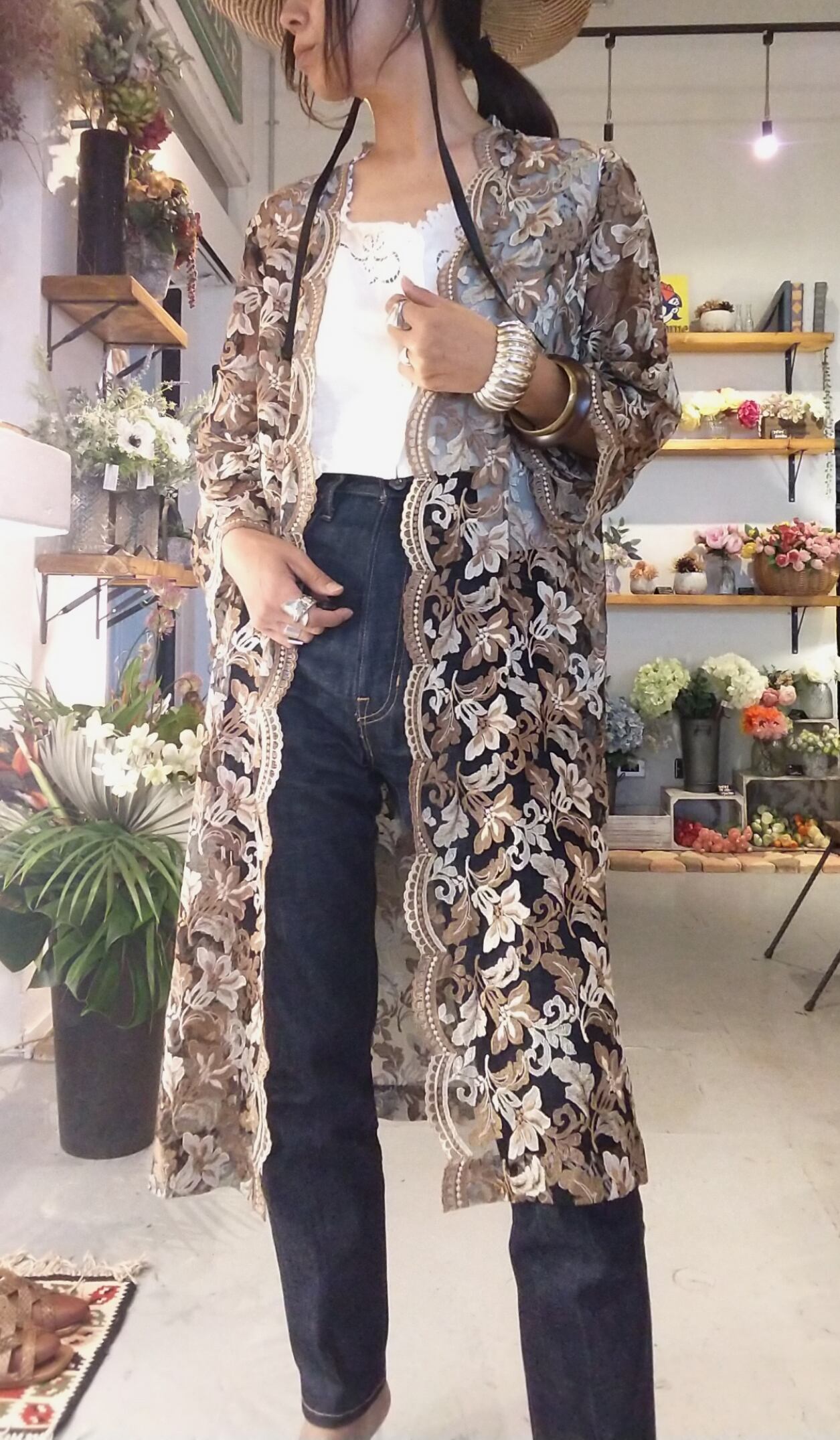 ブラウンベースの落ち着いたカラーのヴィンテージのオープンガウン。縦のラインが際立つ細見えのフォルムです。羽織って品良く着られる優秀アイテム。