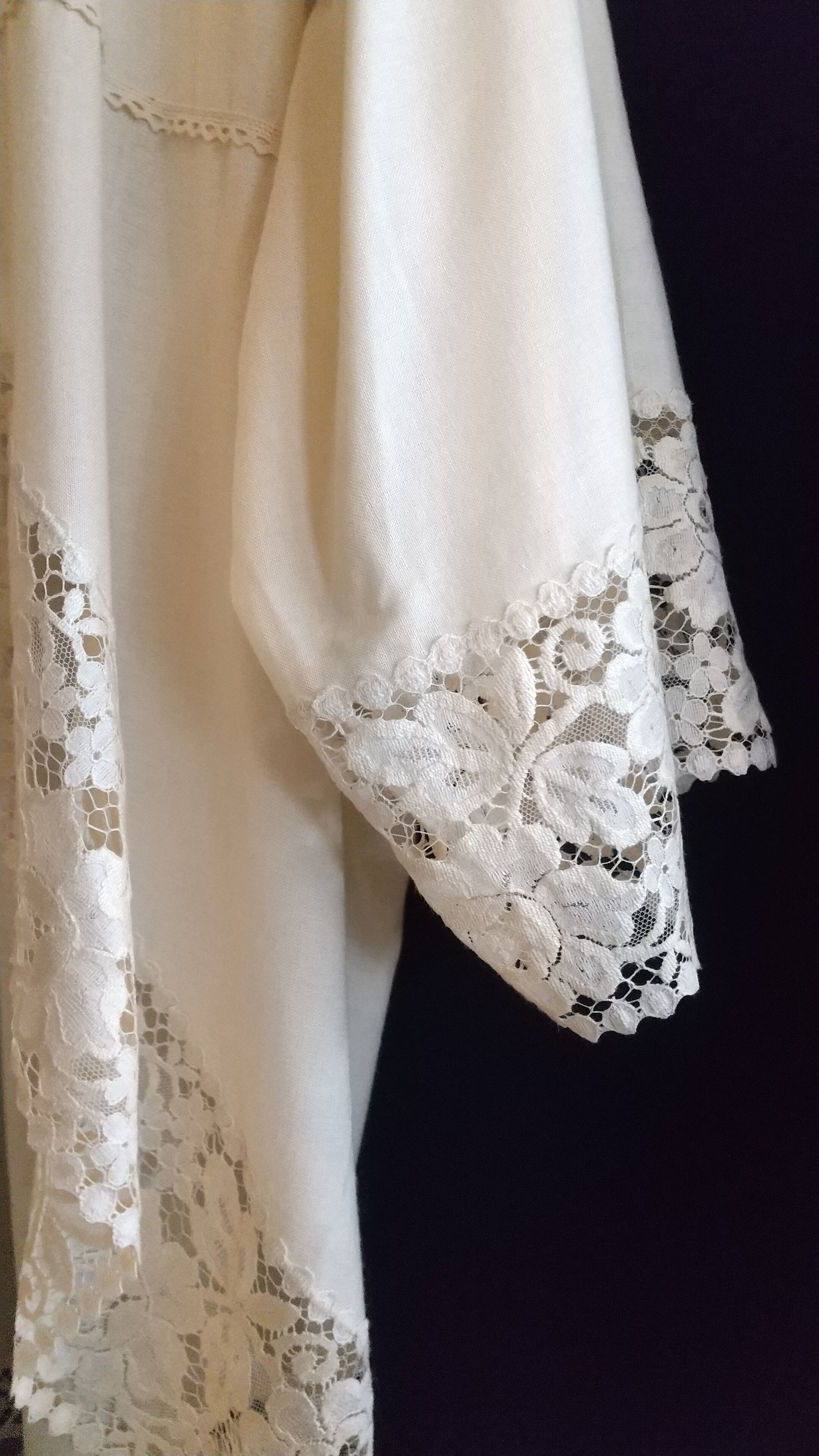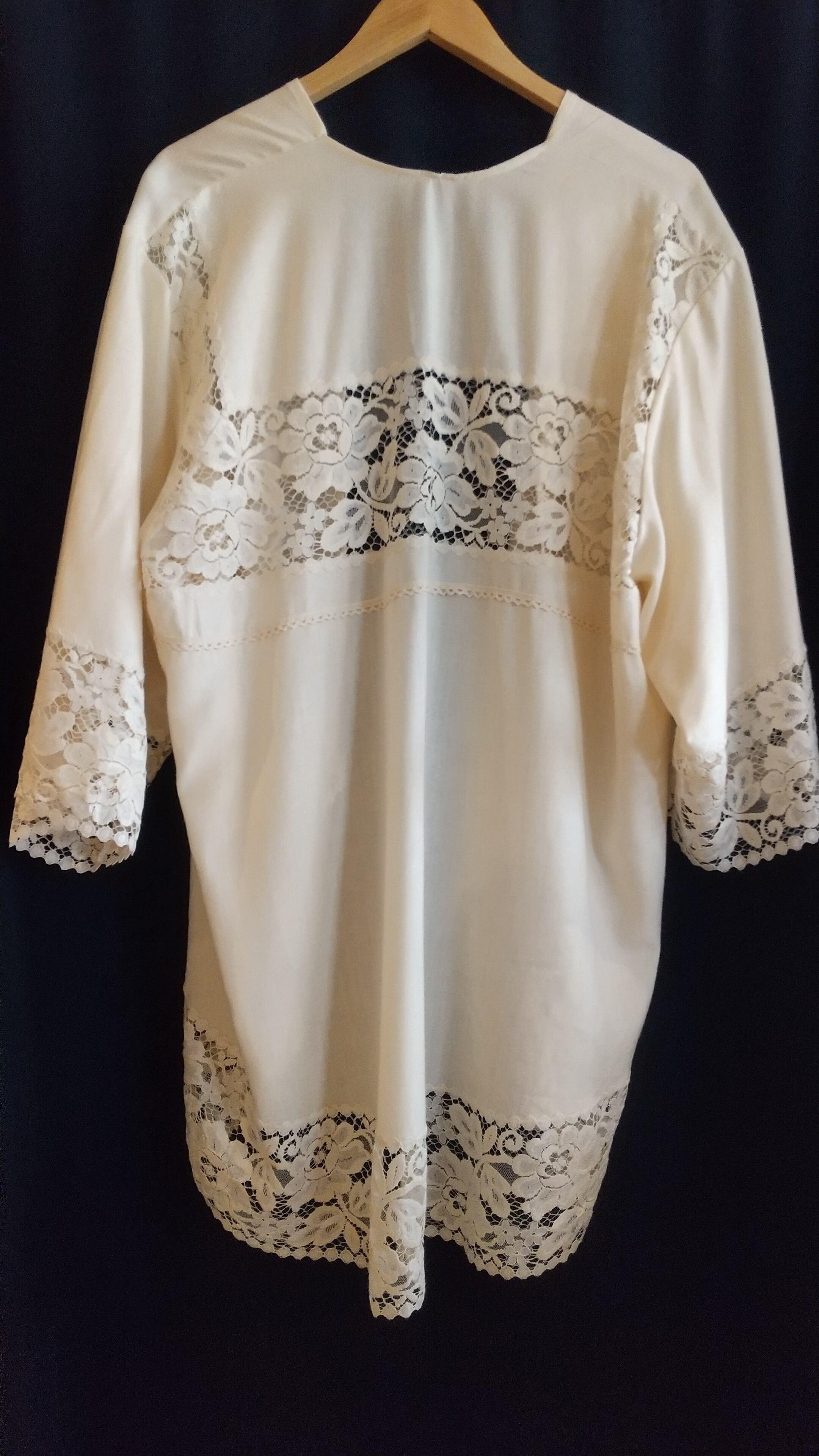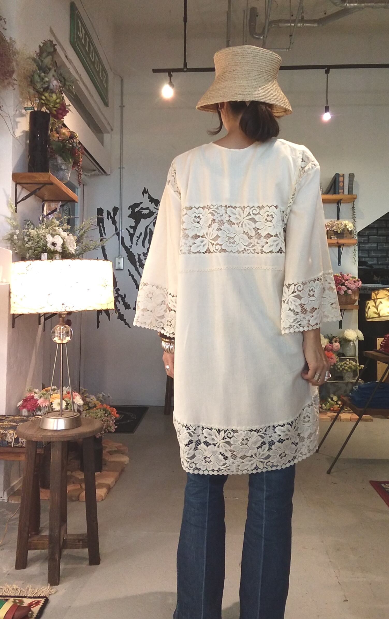 優しい雰囲気のヴィンテージレースガウン。素材表記はありませんがコットンとリネンの混紡のような肌触りでやや透け感があります。フロントからサイドにかけて斜めに流れるラインが優雅です。タンクトップ等の上にさっと羽織ってサマになる優秀アイテム。