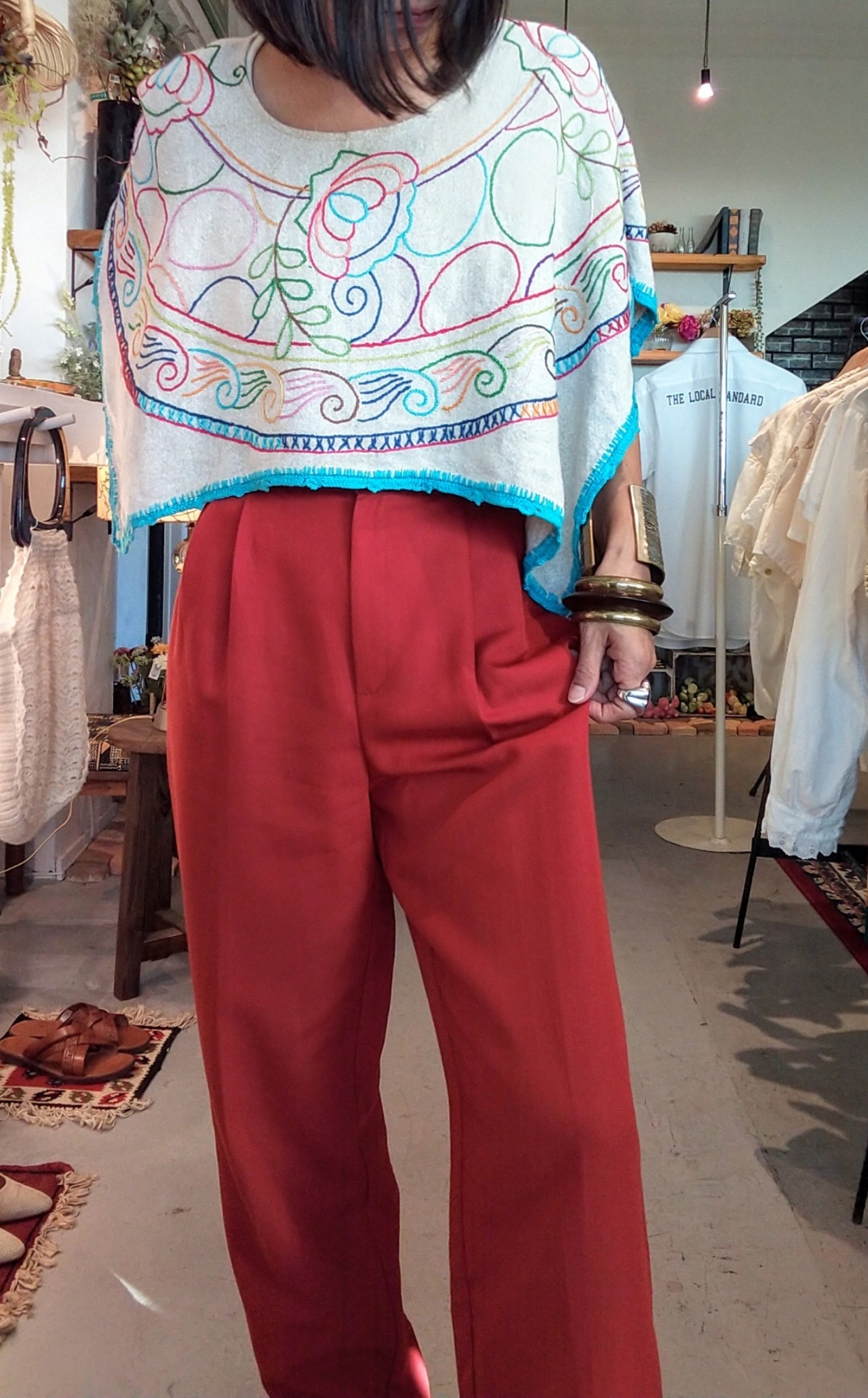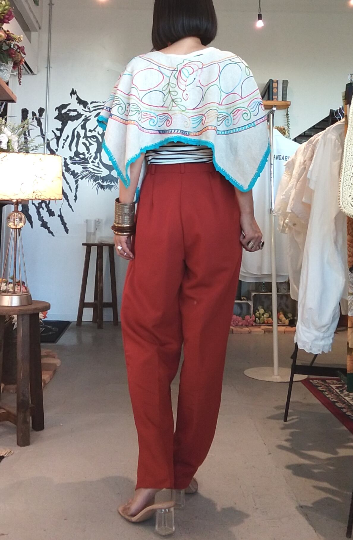 ヴィンテージのカラーパンツ。ウエストはバックの左右がゴム仕様なりましは。ほど良いテーパードとハイウエストでこなれた印象に。