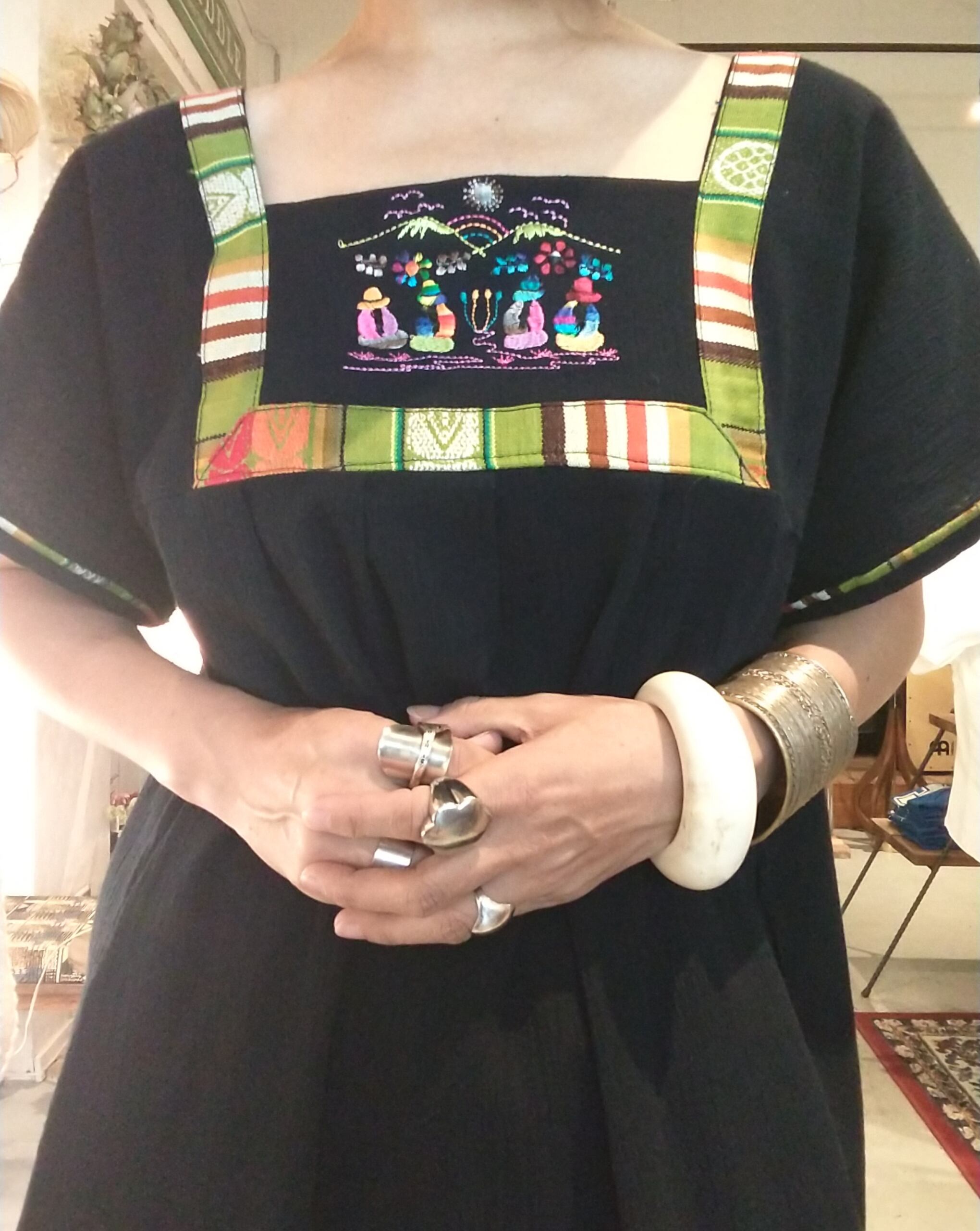 エクアドルのヴィンテージ刺繍ワンピース。素材表記はありませんが涼しく着られる薄手の生地です。透け感はありません。カラーは濃いネイビーです。締め付け感のないストレスフリーなデザインで1枚でもレイヤードでも楽しめます。