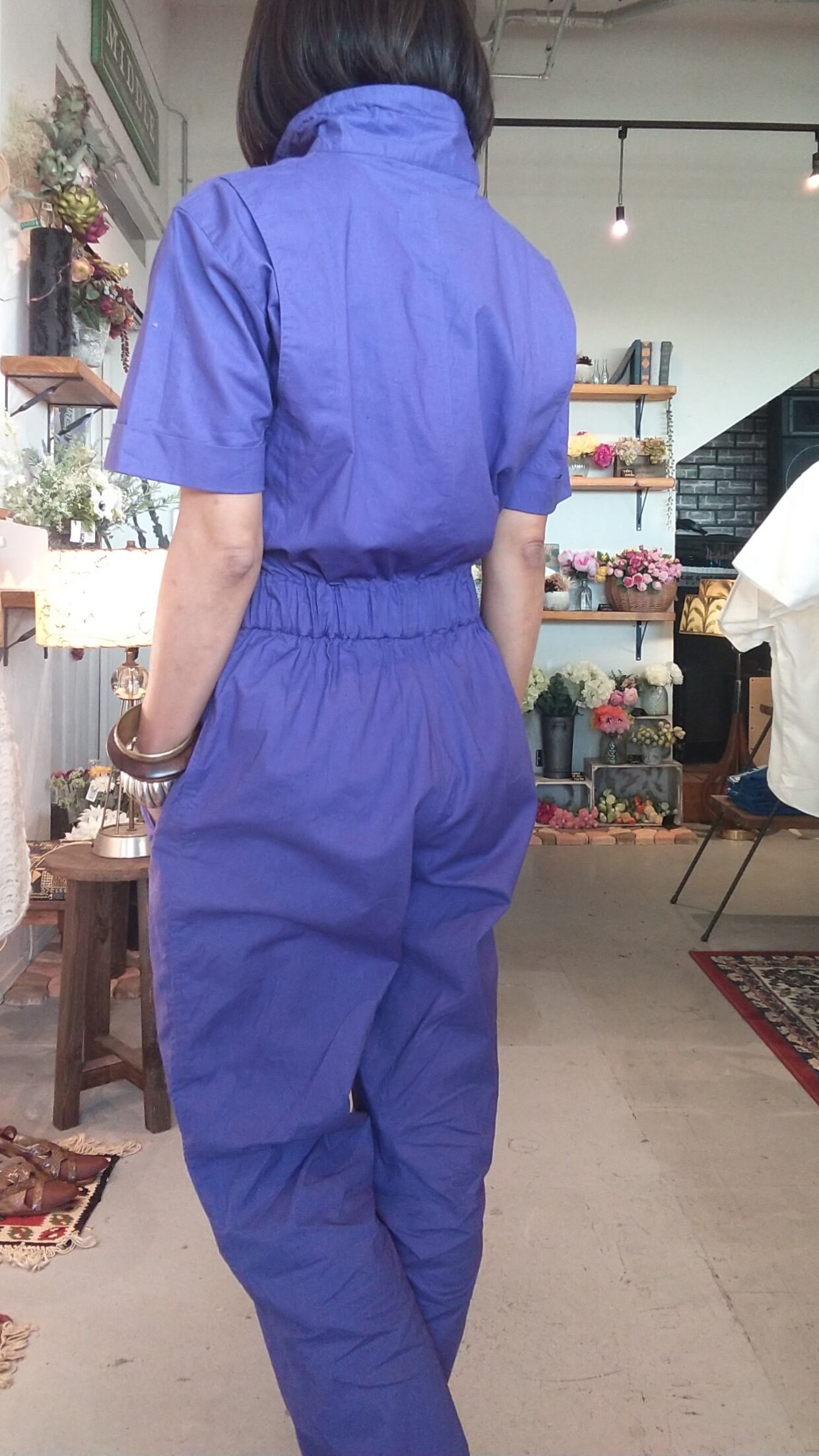 80sのヴィンテージジャンプスーツ。素材はコットン100% 張り感があります。ほぼ未使用の綺麗な状態です。ウエストはゴム仕様で自然なブラウジングになるため着丈は実寸よりもやや短くなります。首〜胸元のディテールがかっこ良く、1枚できまるアイテムです。