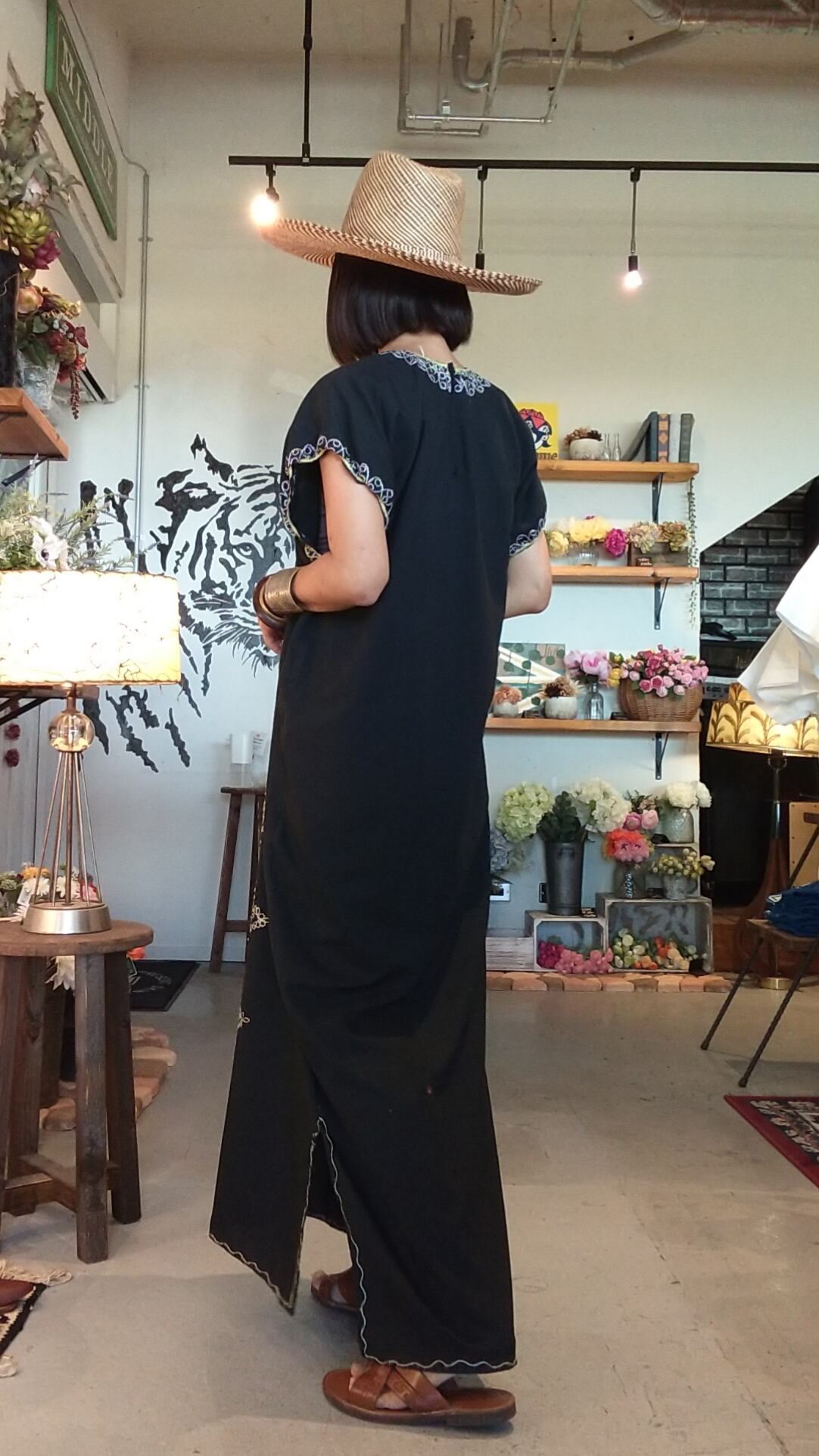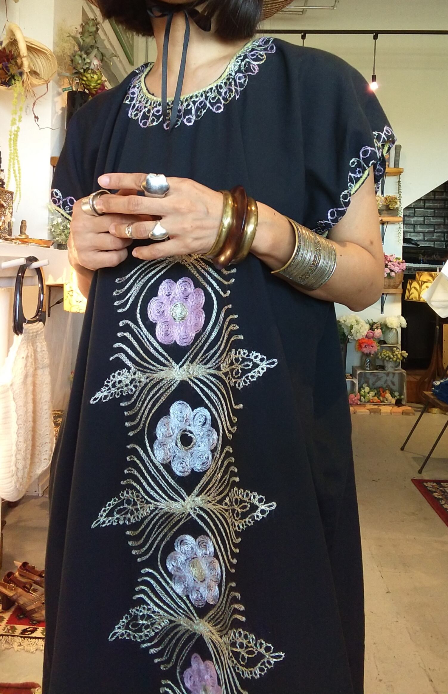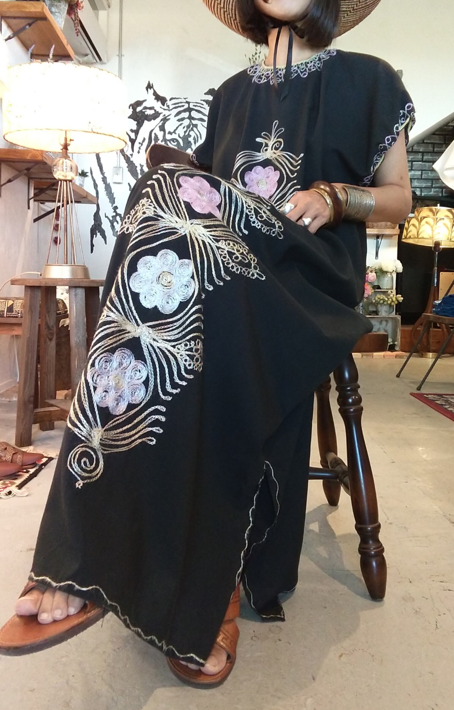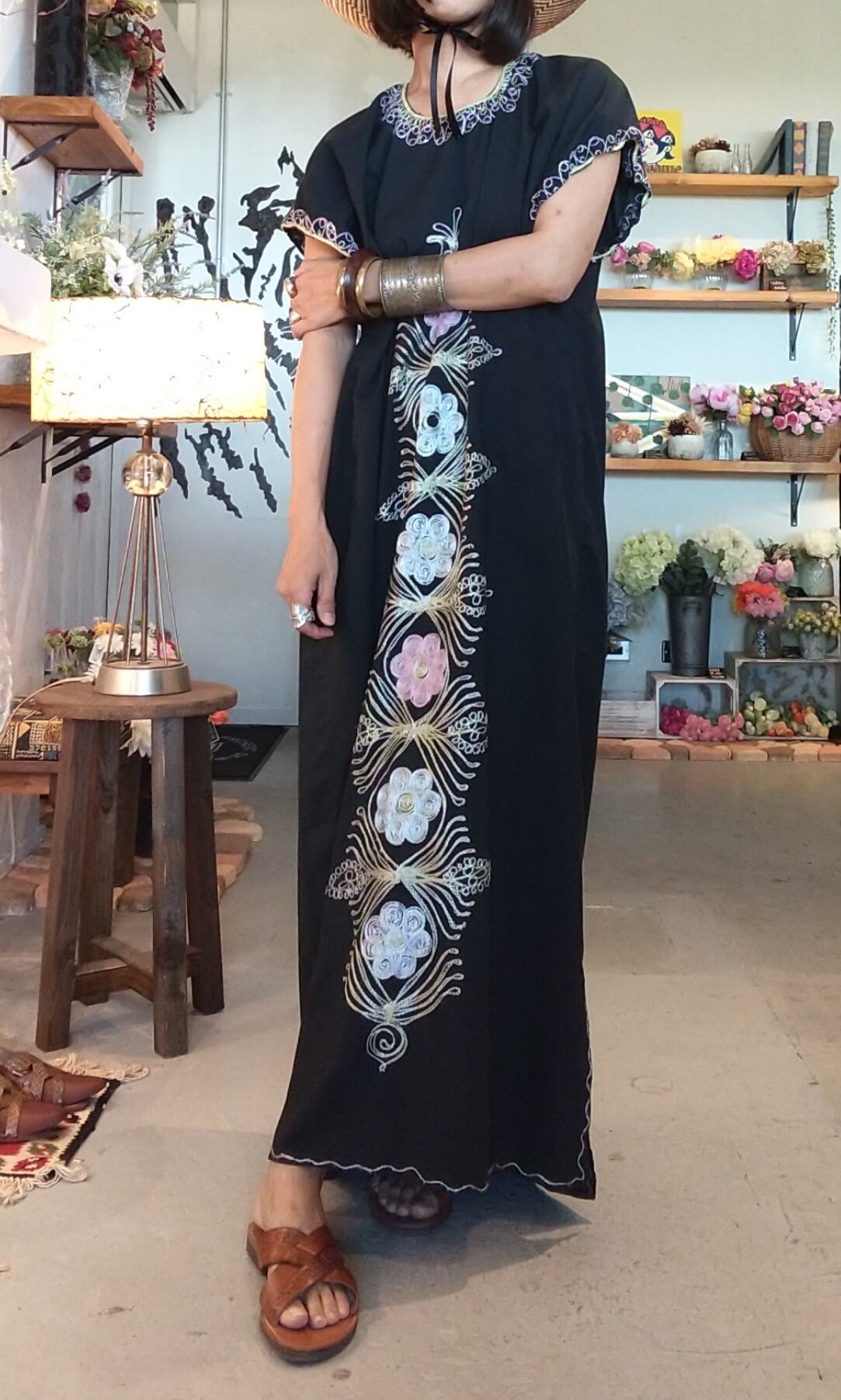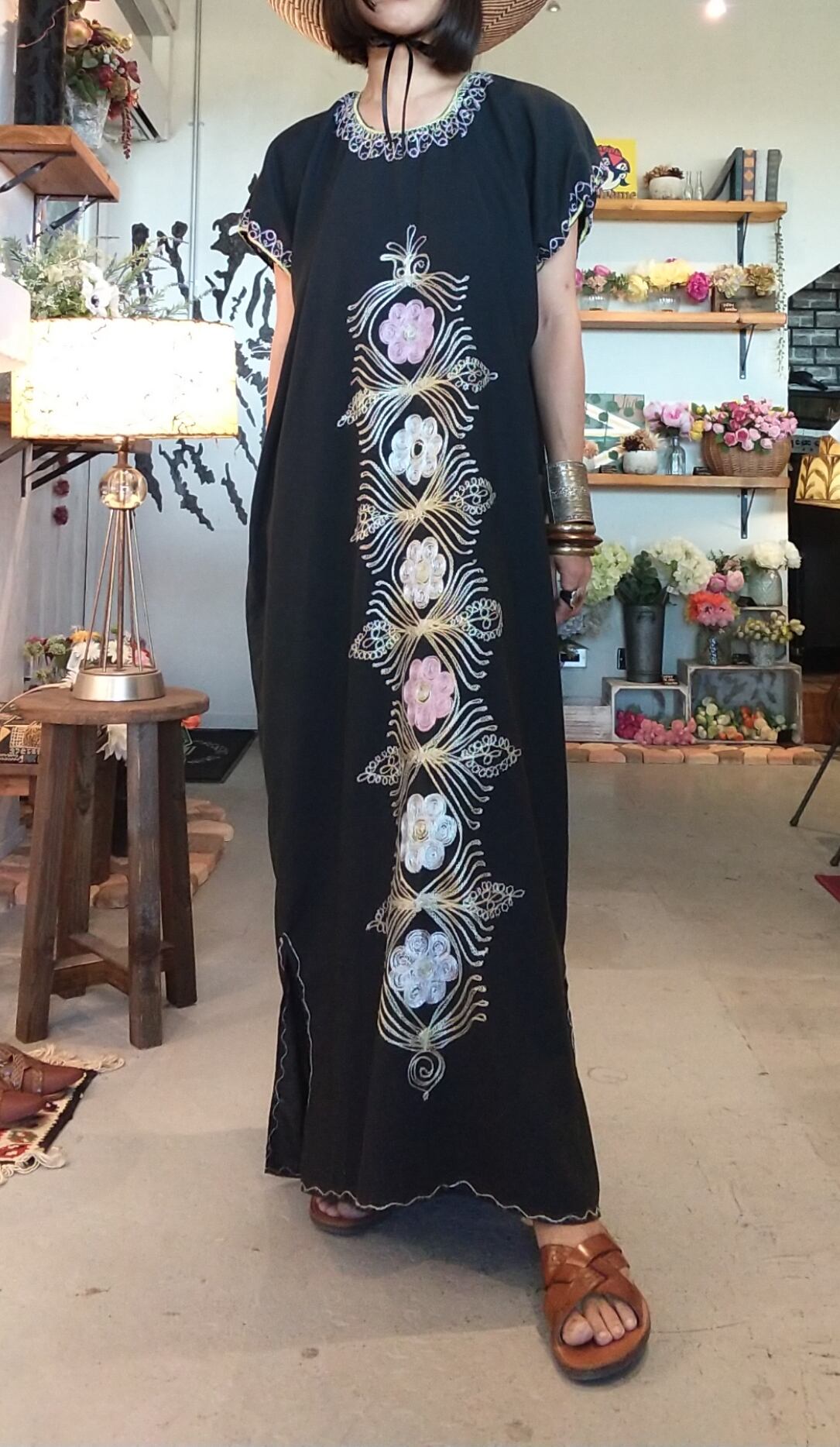 チェーンステッチが素敵なヴィンテージ刺繍マキシドレスです。締め付け感無く涼しく着ていただけます。裾にはスリット入りで足さばきも楽です。