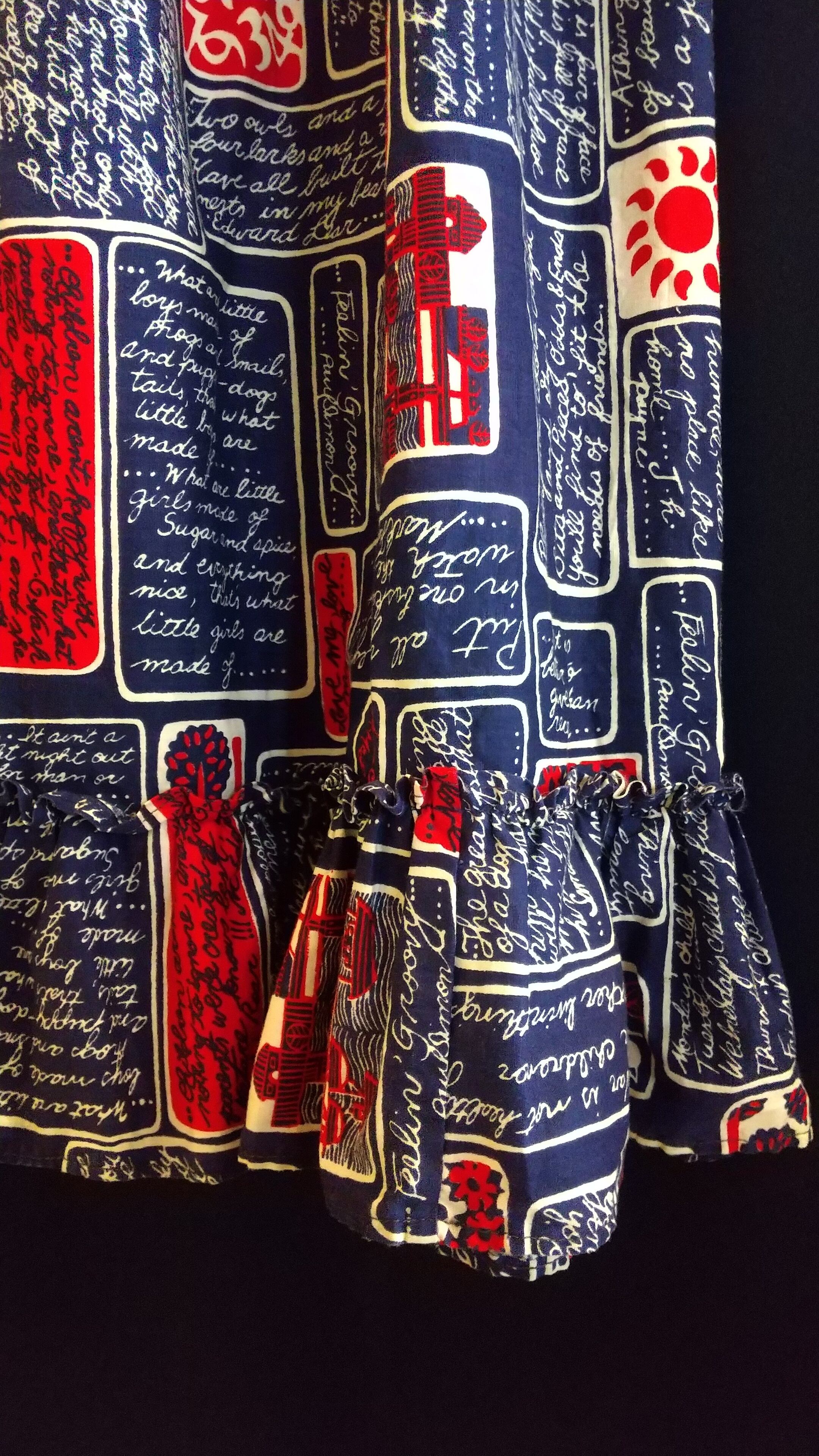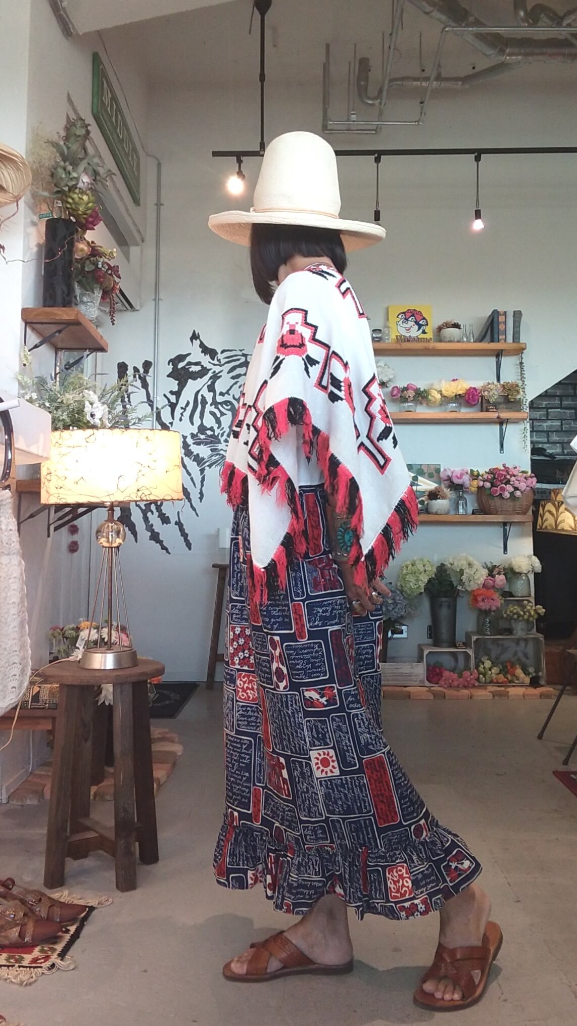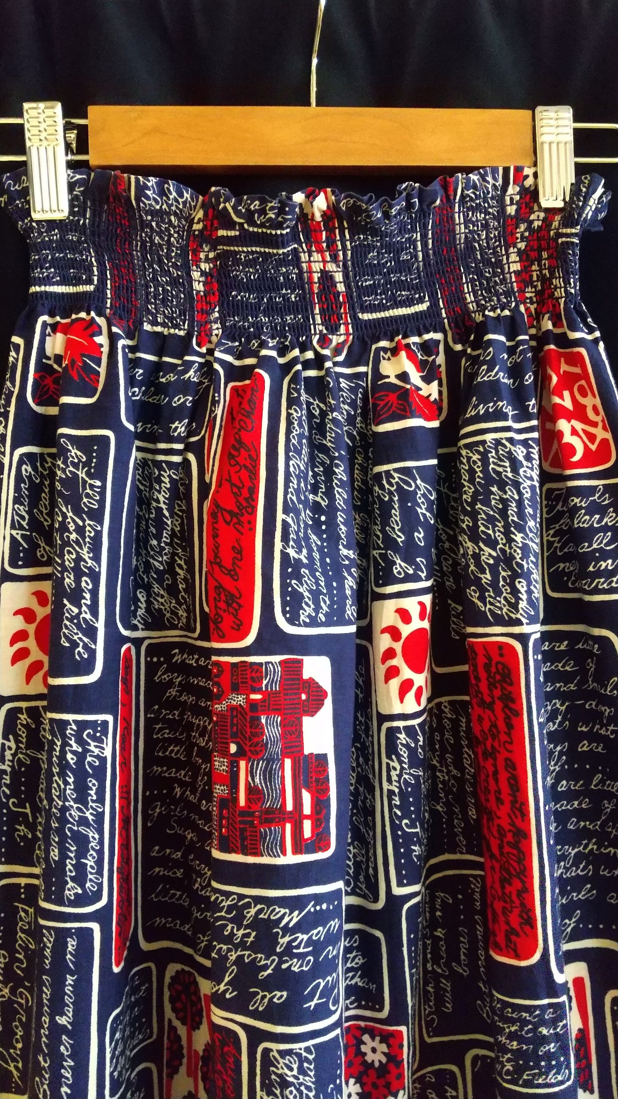 バンダナ風にもみえる総柄プリントのヴィンテージスカート。素材表記はありませんがコットンのようです。ウエストはゴム仕様でサイズに幅があります。長すぎない丈感でカジュアルに着られます。
