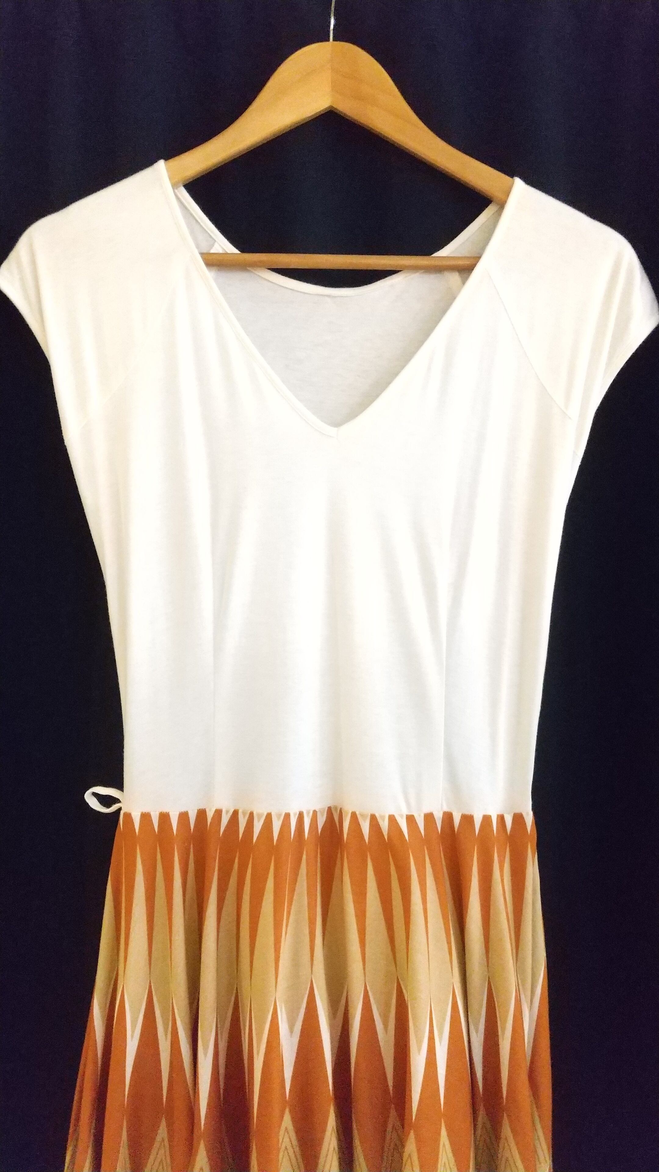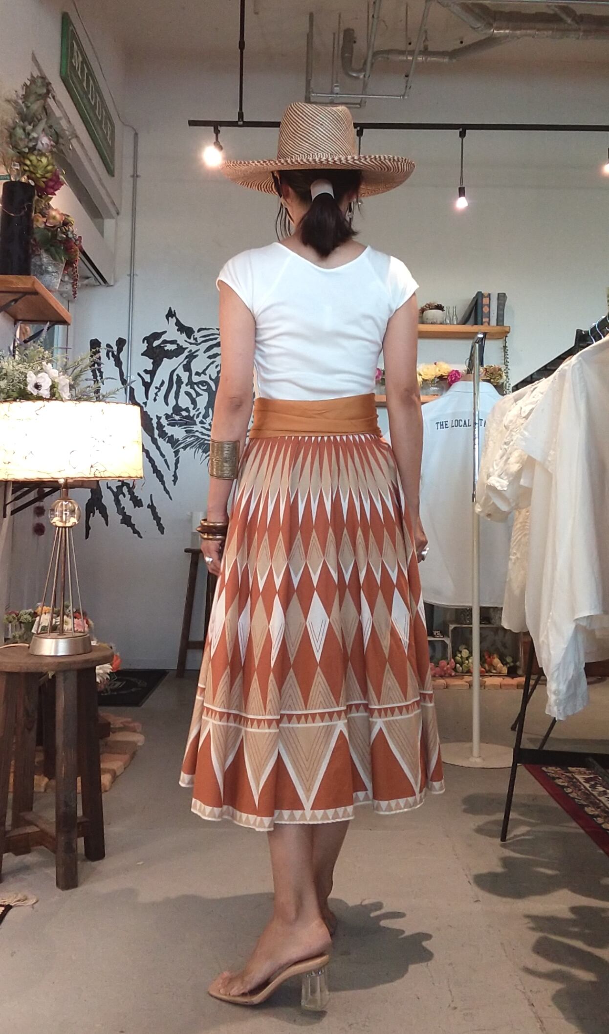 コットン素材の幾何学柄ヴィンテージワンピース。スカート部分はたっぷりの生地を使用したサーキュラー仕立て。広げると円 -circle- を描きます。カジュアルな素材感で気負うことなく着られる1枚。