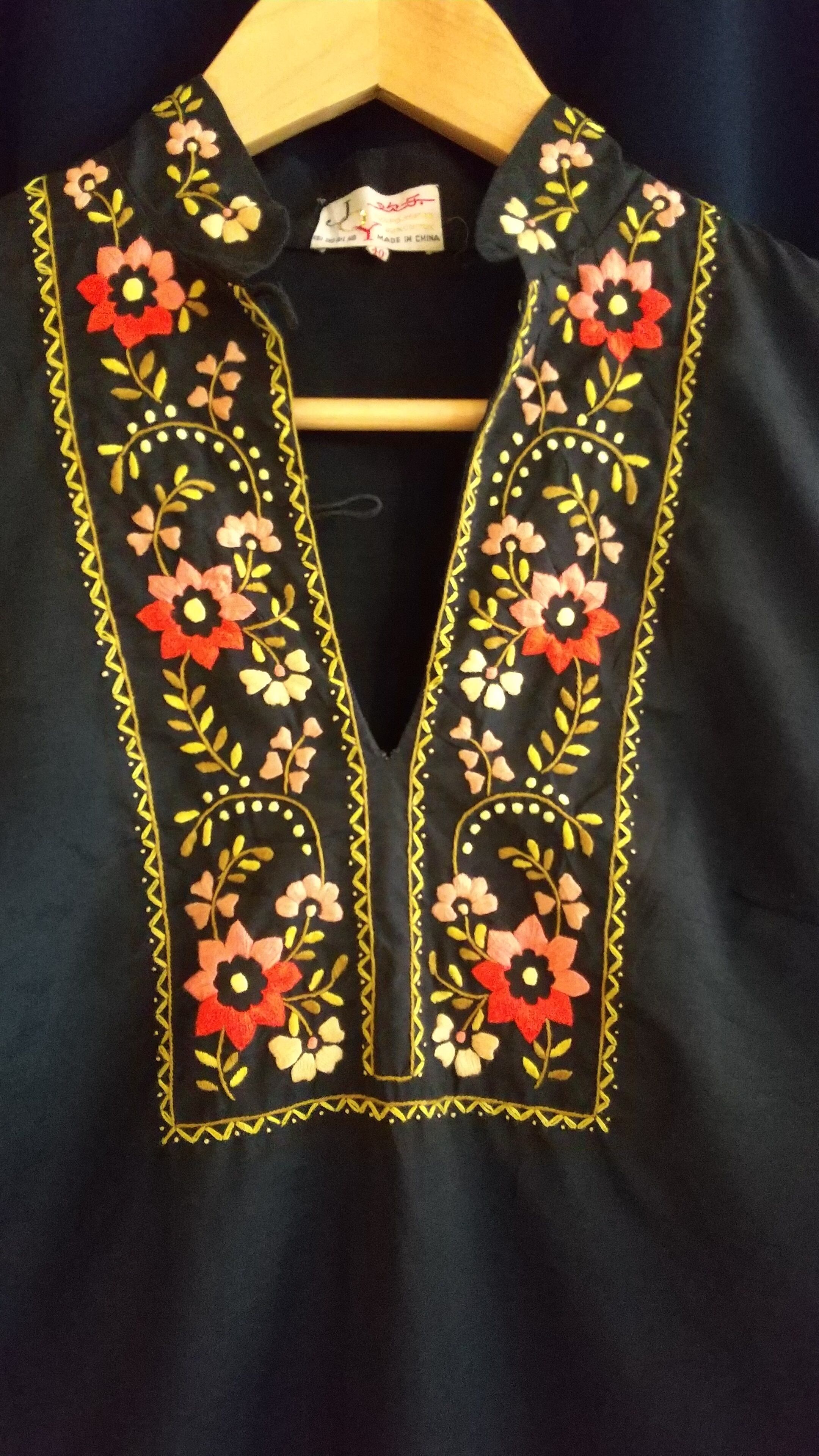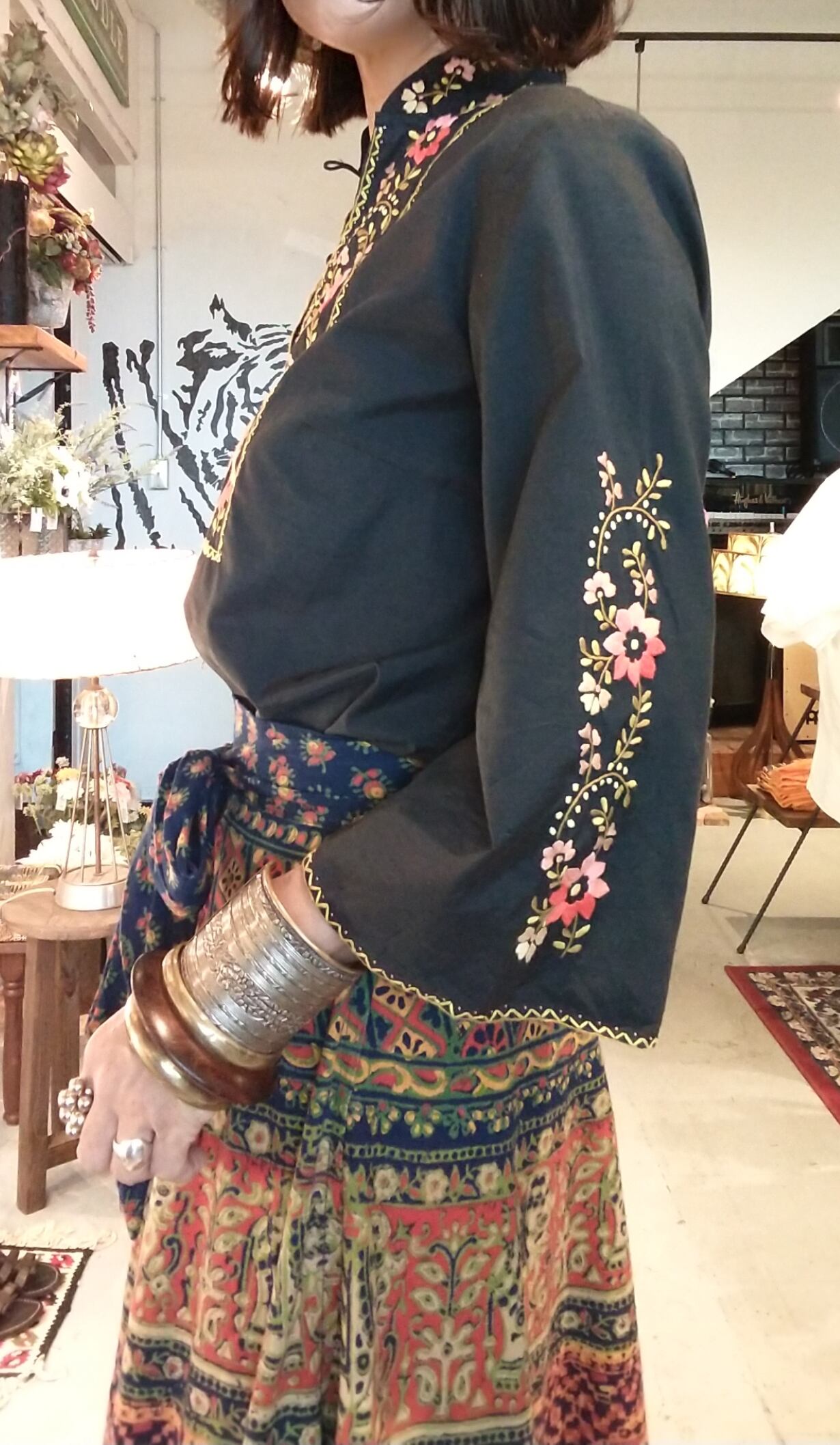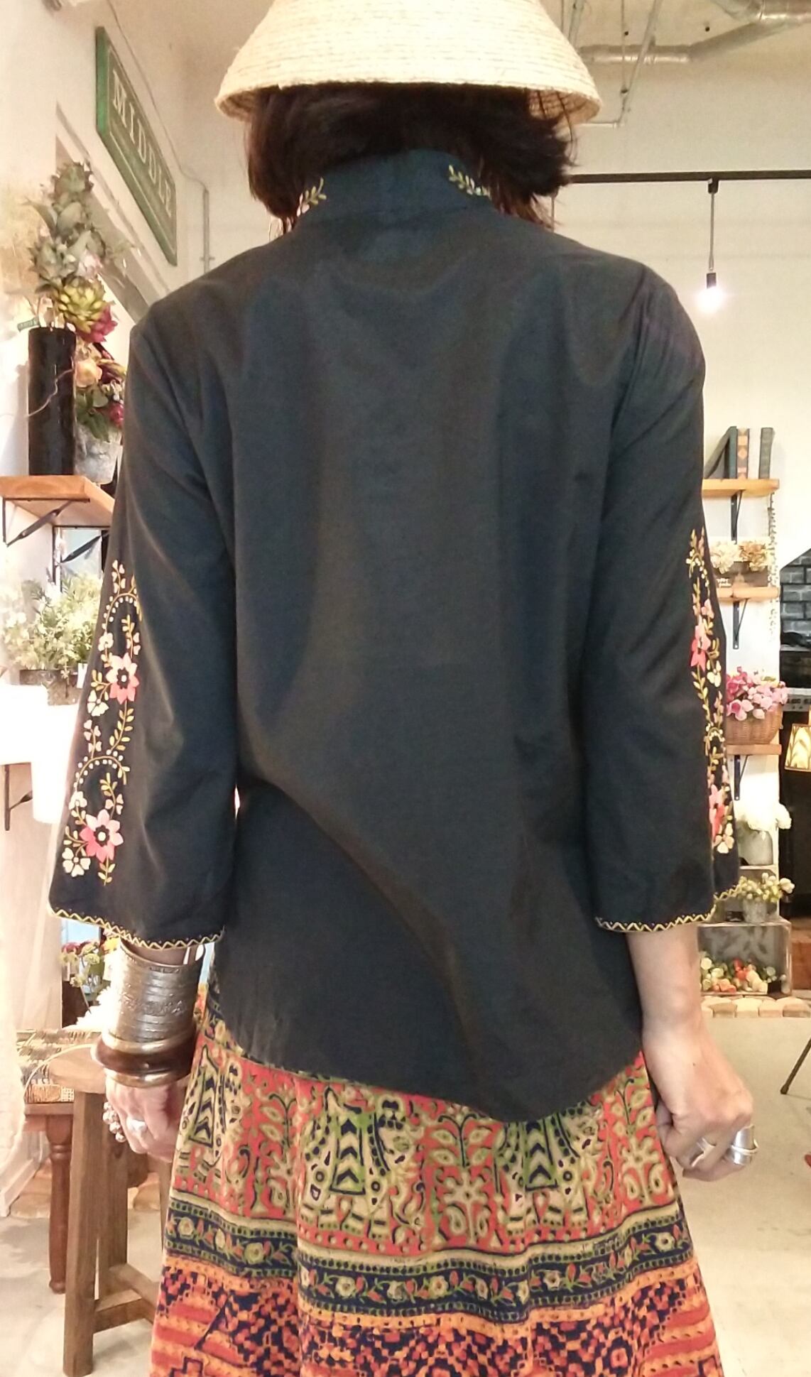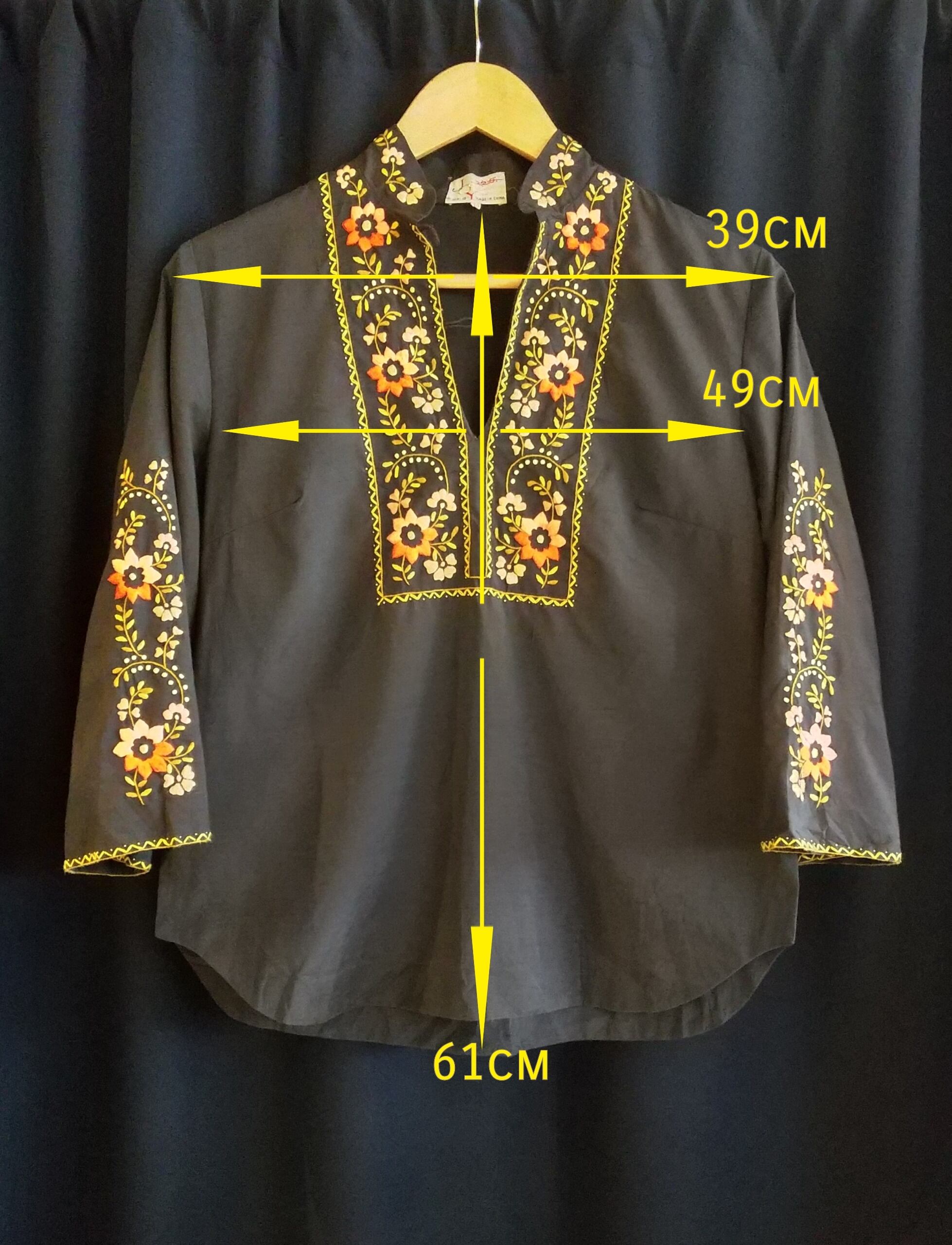 黒字に華やかな刺繍が映えるヴィンテージチャイナ刺繍トップス。プルオーバータイプです。ボタンループが2つ付いていますがボタンはありません。素材はコットン30%、ポリエステル70%です。サイドスリット入りのためアウトでも可愛く着られます。