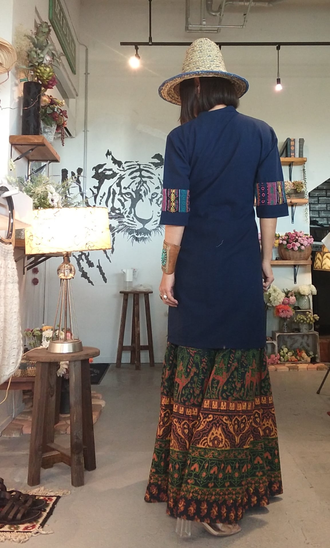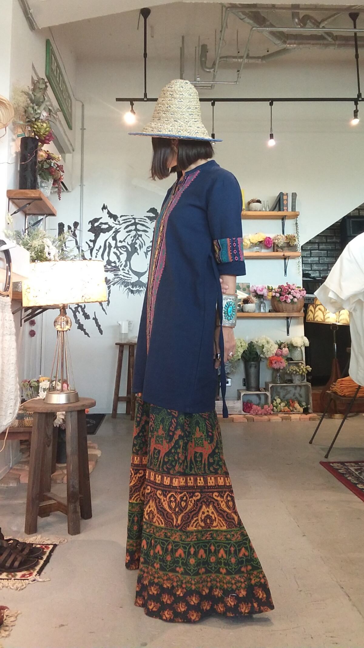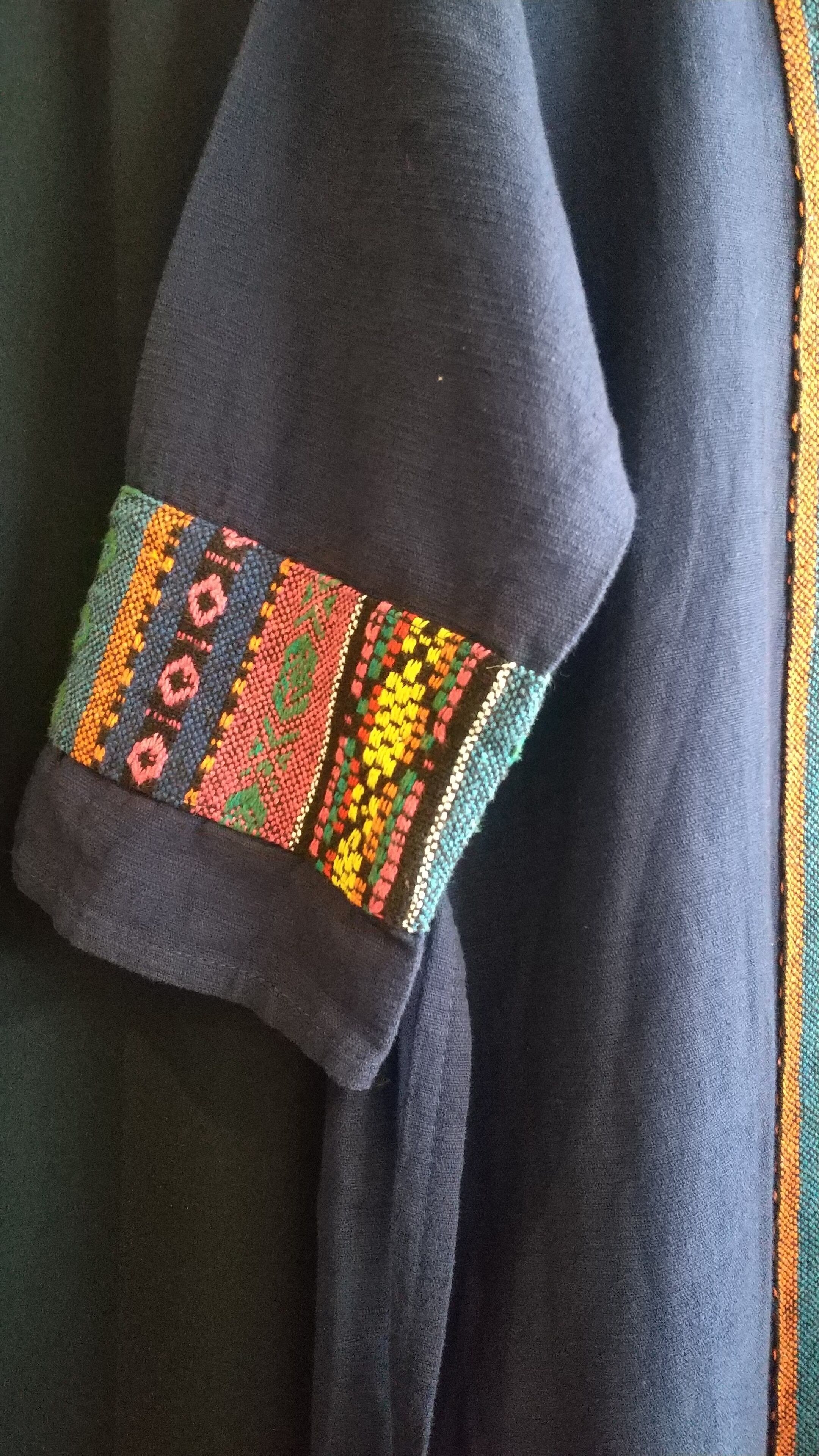 グアテマラの美しい織りのヴィンテージチュニック。ネイビーの地にカラフルな織り柄が映えます。素材表記はありませんがコットンのようです。細身のすっきりシルエットはパンツはもちろんマキシスカートにレイヤードも素敵です。
