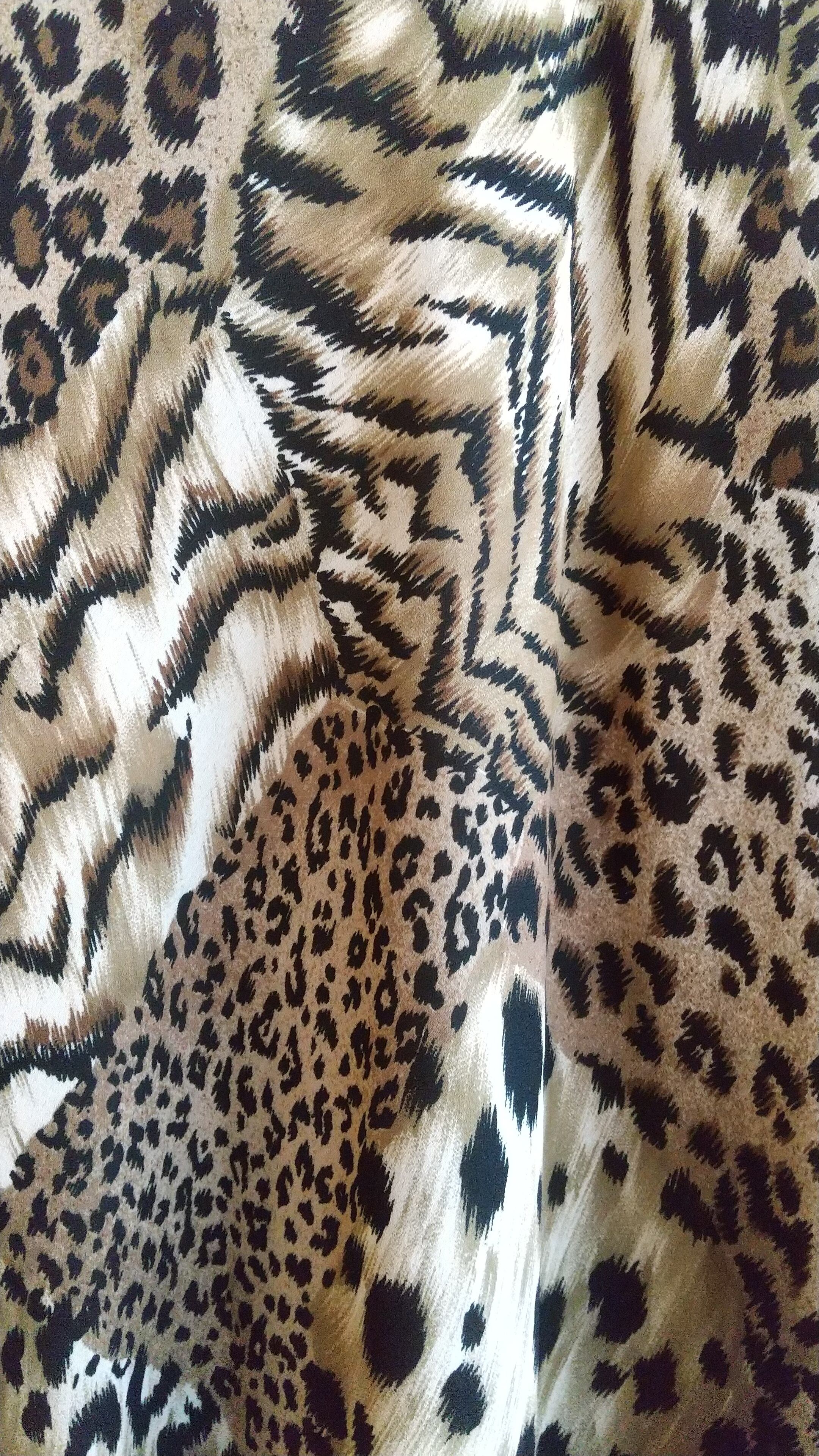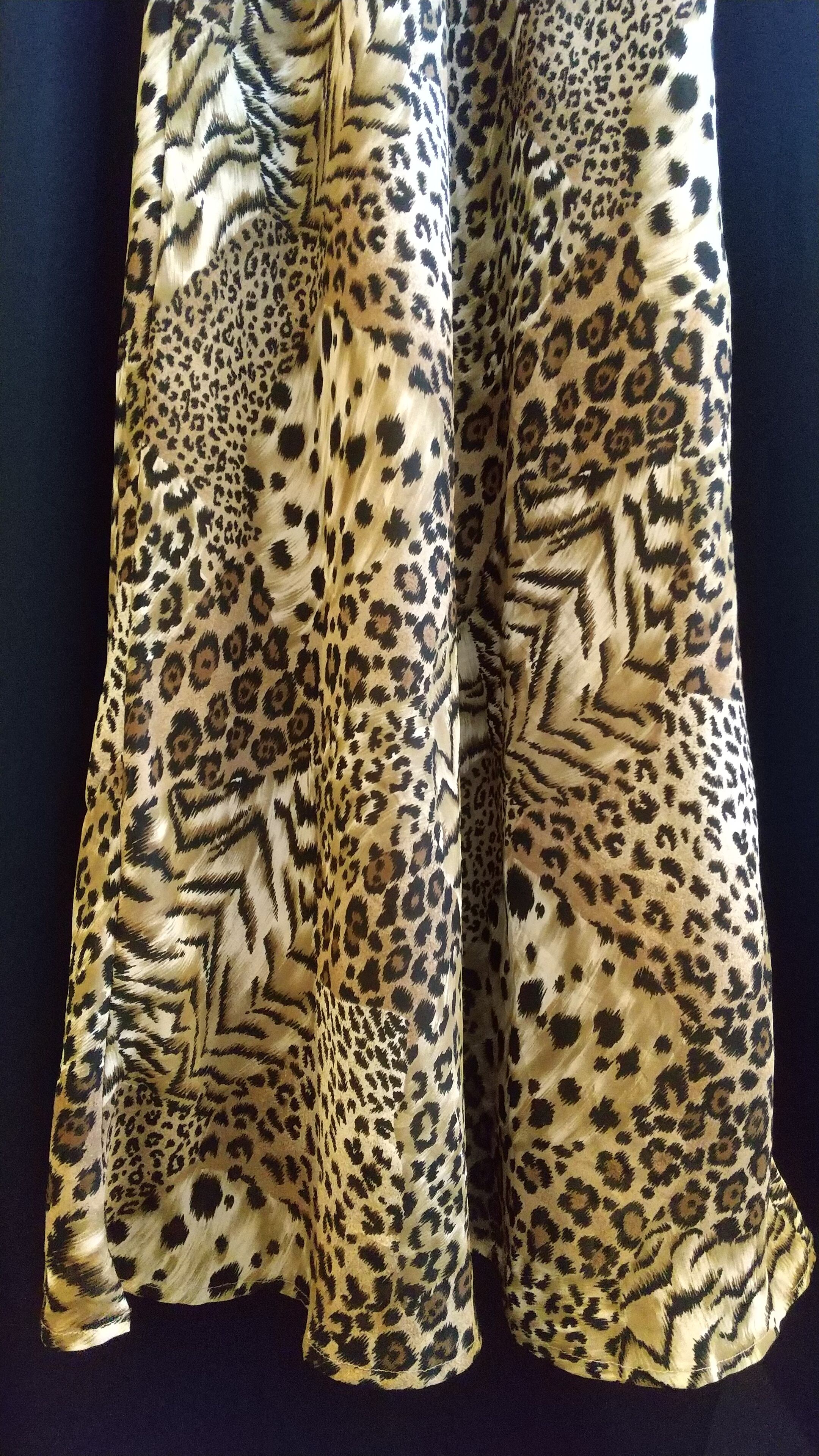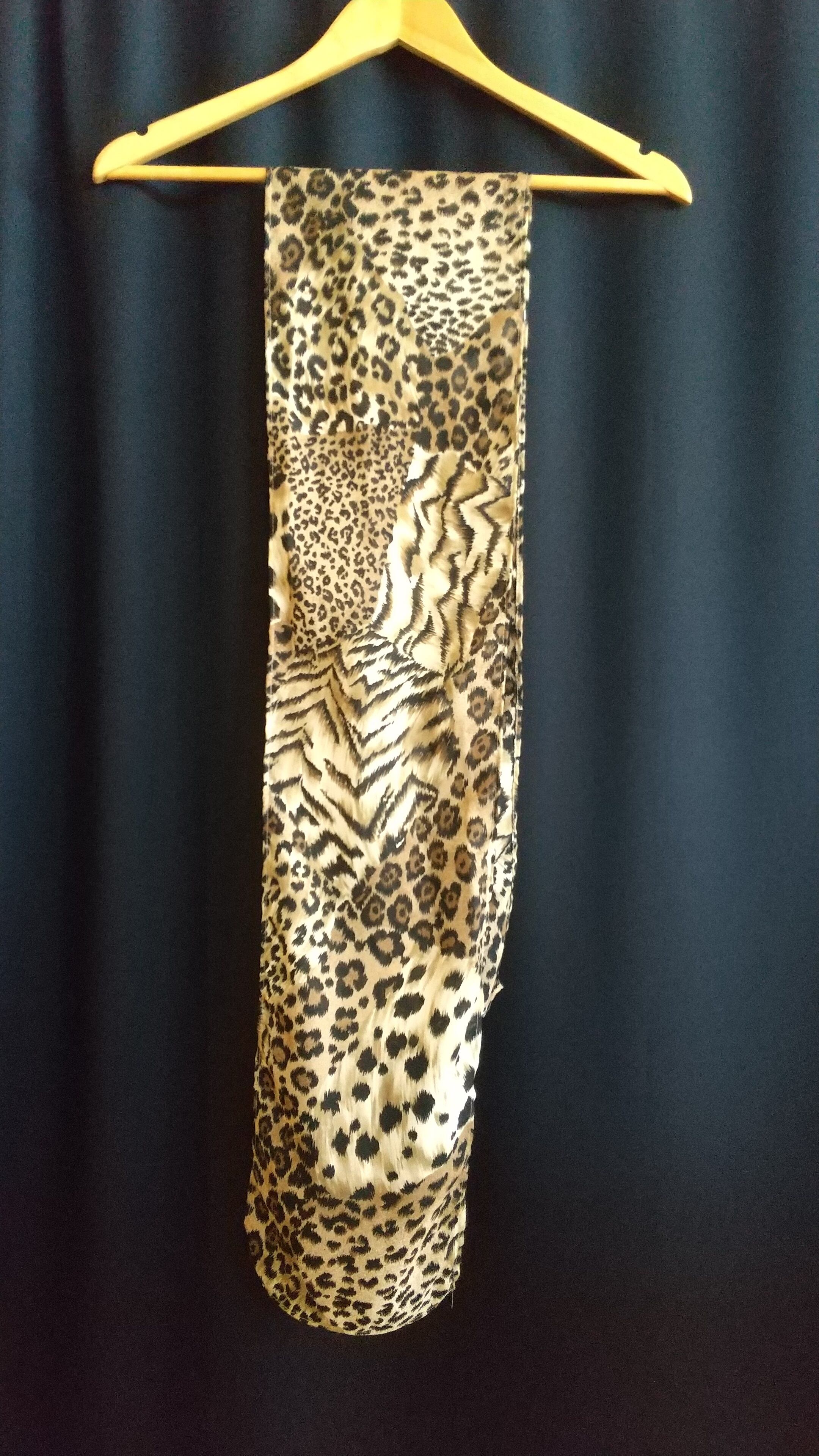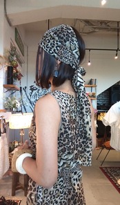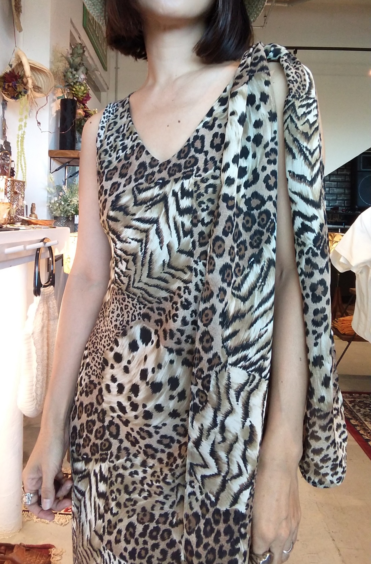 レオパードの総柄のヴィンテージマキシドレス。素材表記はありませんがポリエステルのようです。裏地付き、ファスナーは付いていません。すっきり縦のラインが強調されるシルエットで大人っぽい印象。共布のスカーフは肩に結んで垂らしたり、首に巻いたり、ターバンのように頭に巻いたり、お好きなスタイルでお楽しみください。