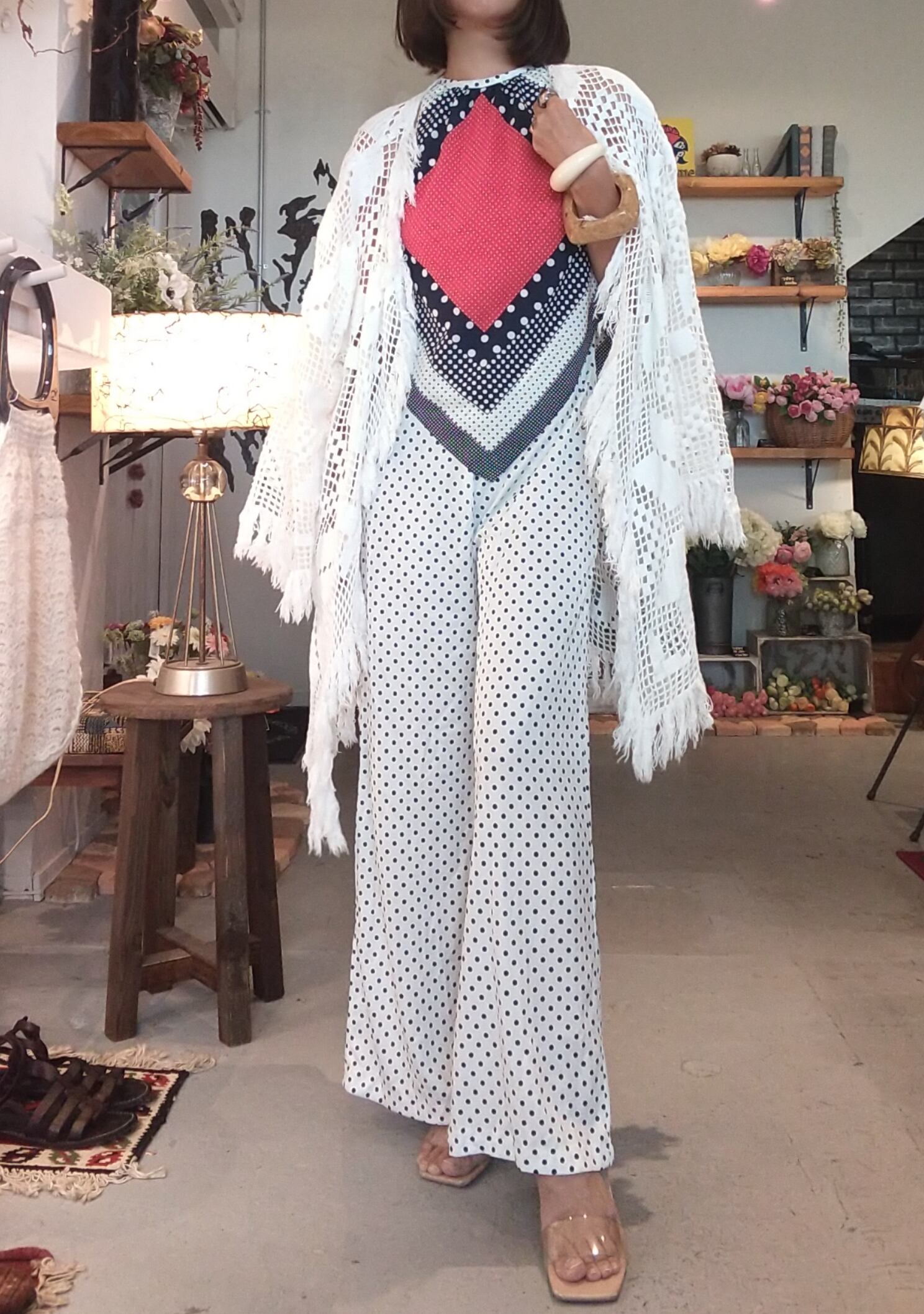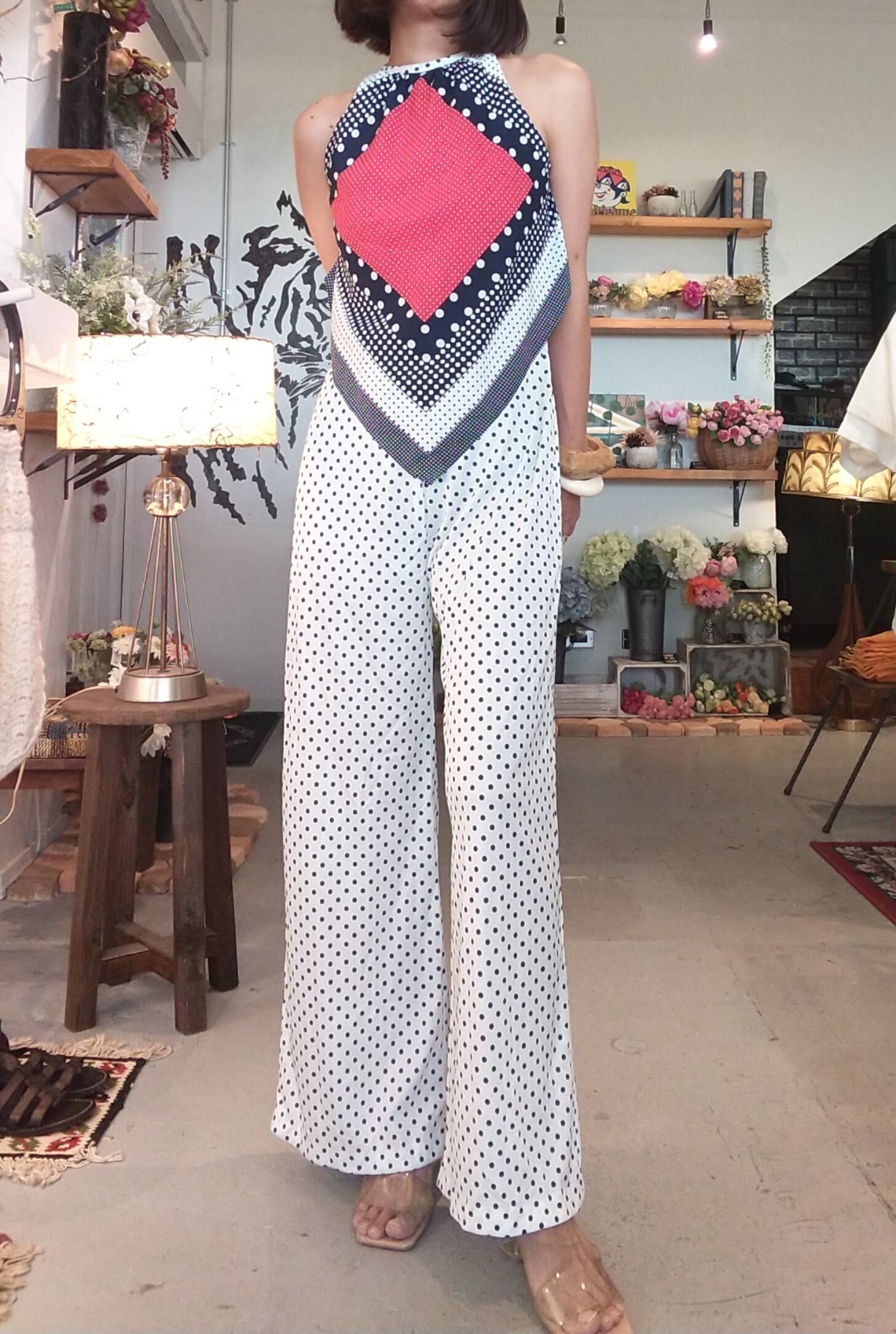 デザイン・配色等、ヴィンテージならではの可愛さが詰まったジャンプスーツ。素材表記はありませんが薄手の軽いポリエステルのようです。スカーフをあしらったようなトップスデザインやアメリカンスリーブが垢抜けた印象。