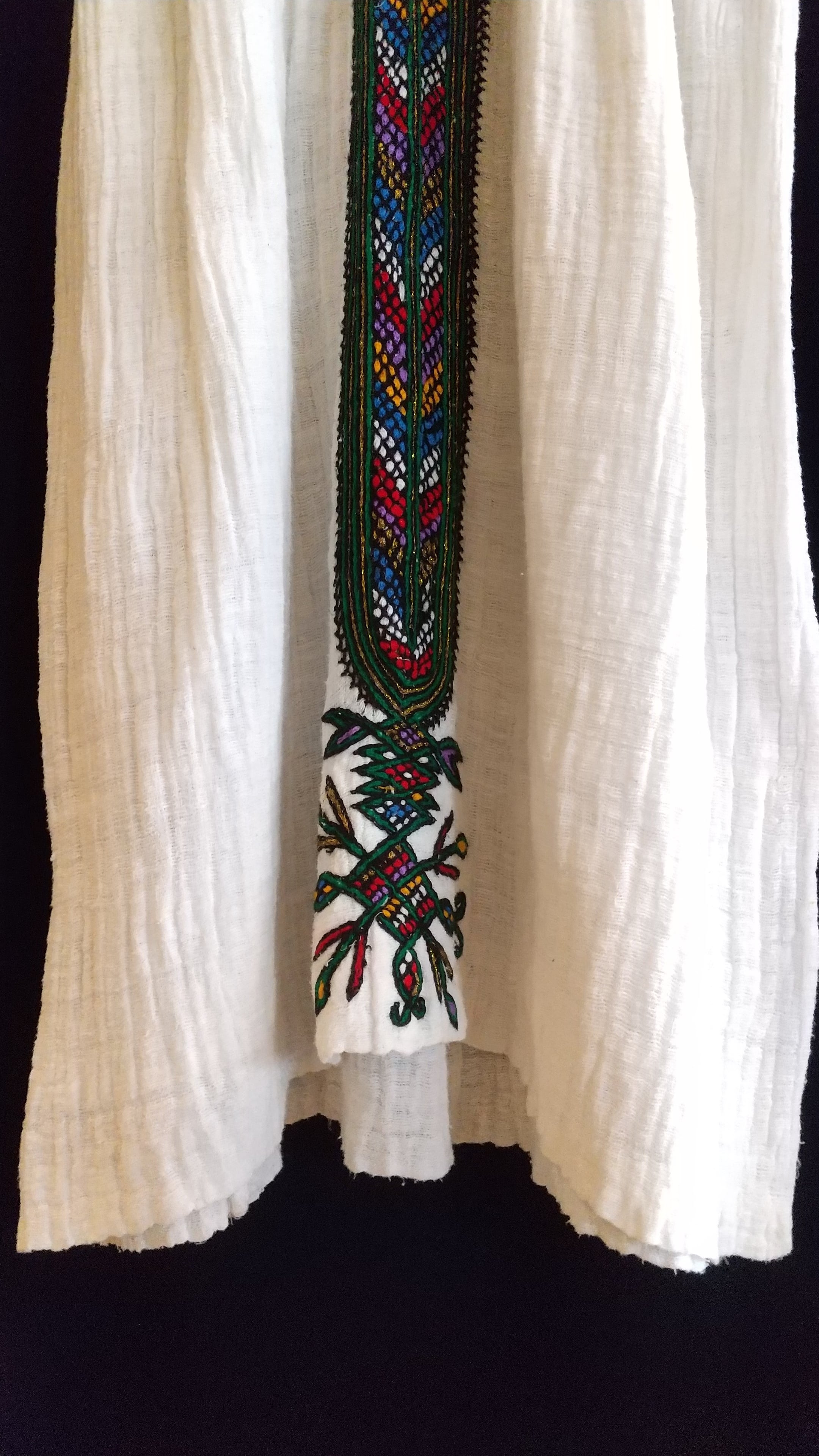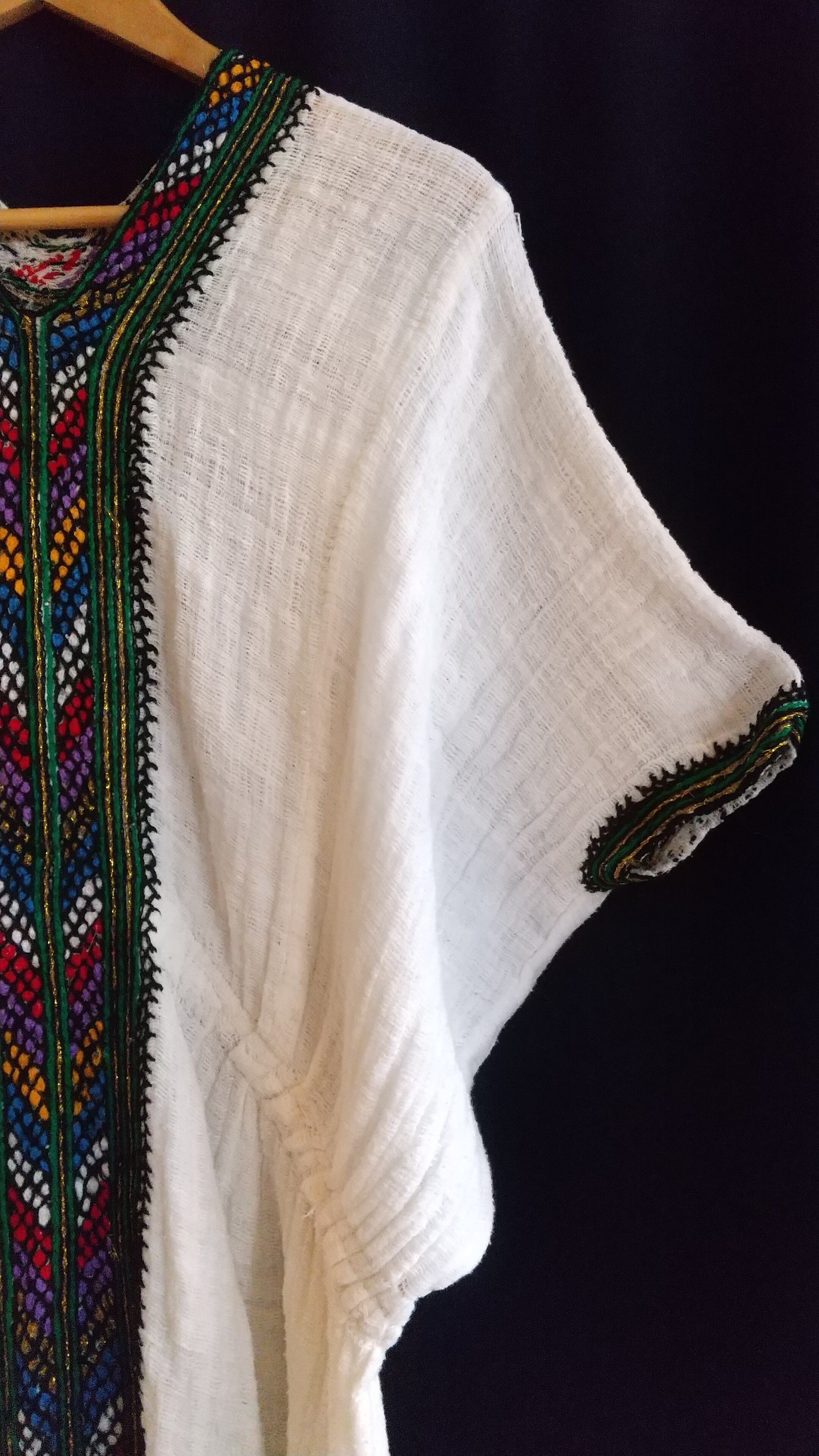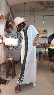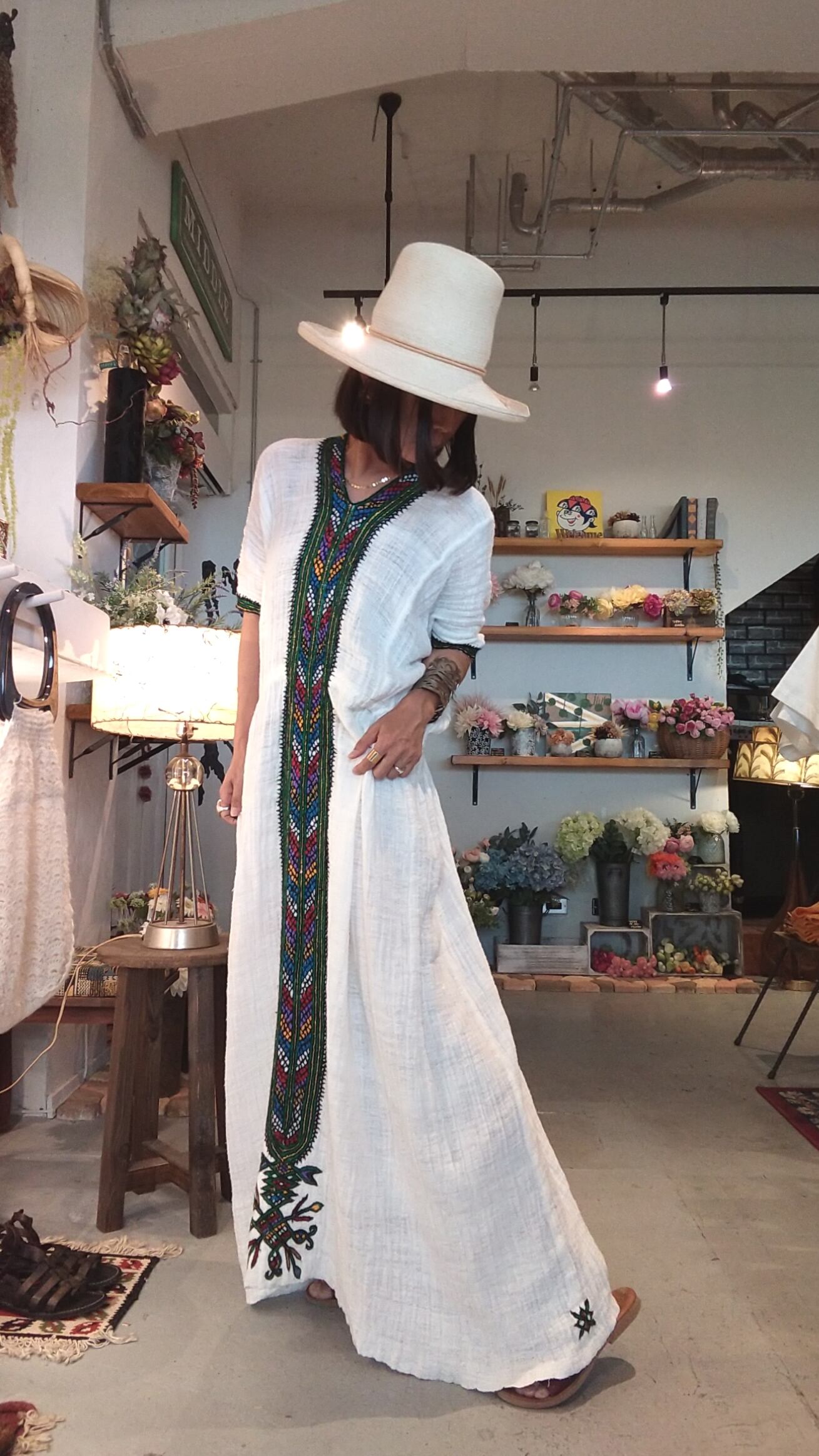 柔らかなコットンガーゼ素材に手刺繍があしらわれたヴィンテージのカフタンマキシドレス。ガーぜの風合いと立体感のある手刺繍に温かみを感じます。着丈はセンターからサイドにかけて長くなっています。ゆるりとしたサイズ感がリラクシングな1枚。