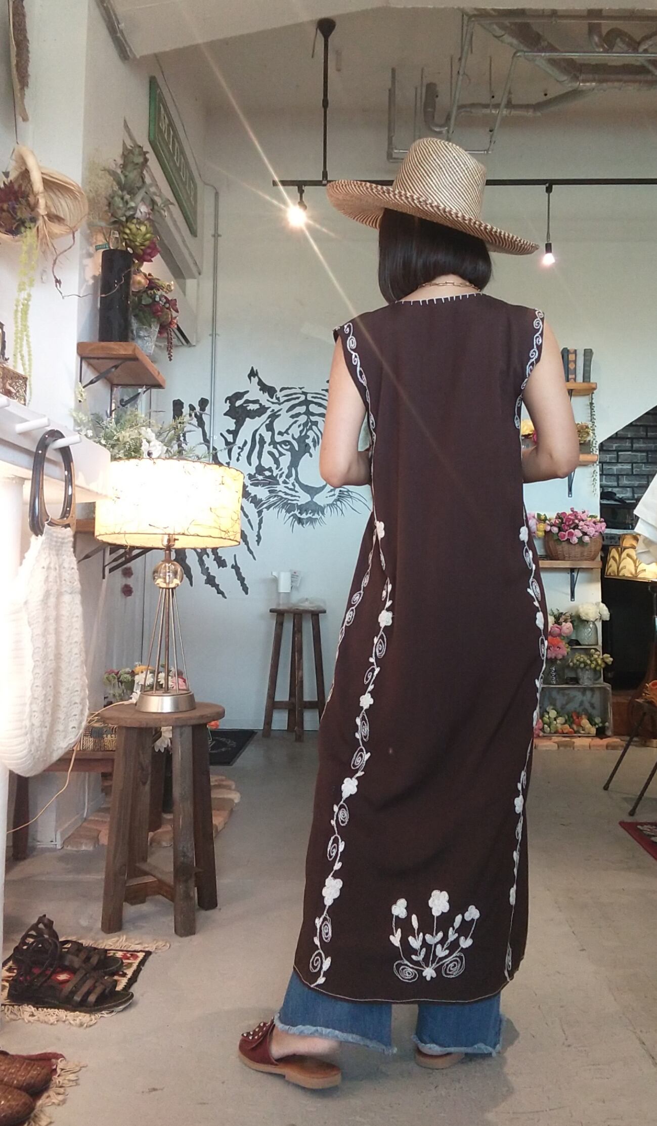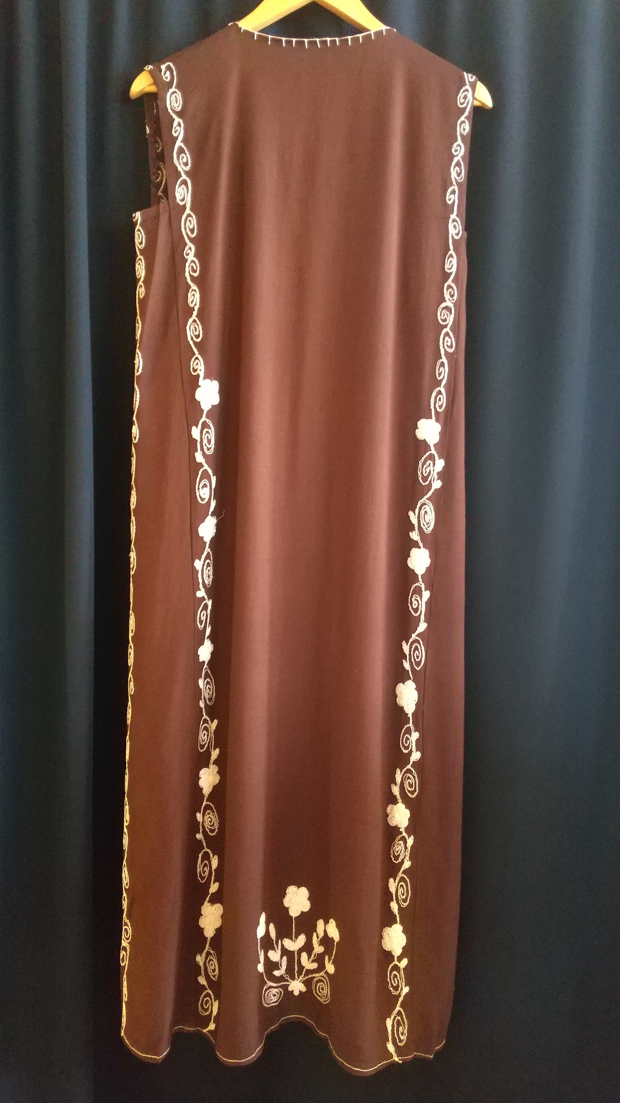 大きな立体的なお花の刺繍か目を引くヴィンテージワンピース。素材表記はありませんがコットンのようです。やや落ち感があるためレーヨンとの混紡かもしれません。透け感はありません。ハンドメイドと思われます。直線的ですとんと落ちるシルエットでほっそり、すっきり見えます。*小さなキズ、修繕跡、薄い色移りがありますので画像でご確認ください。