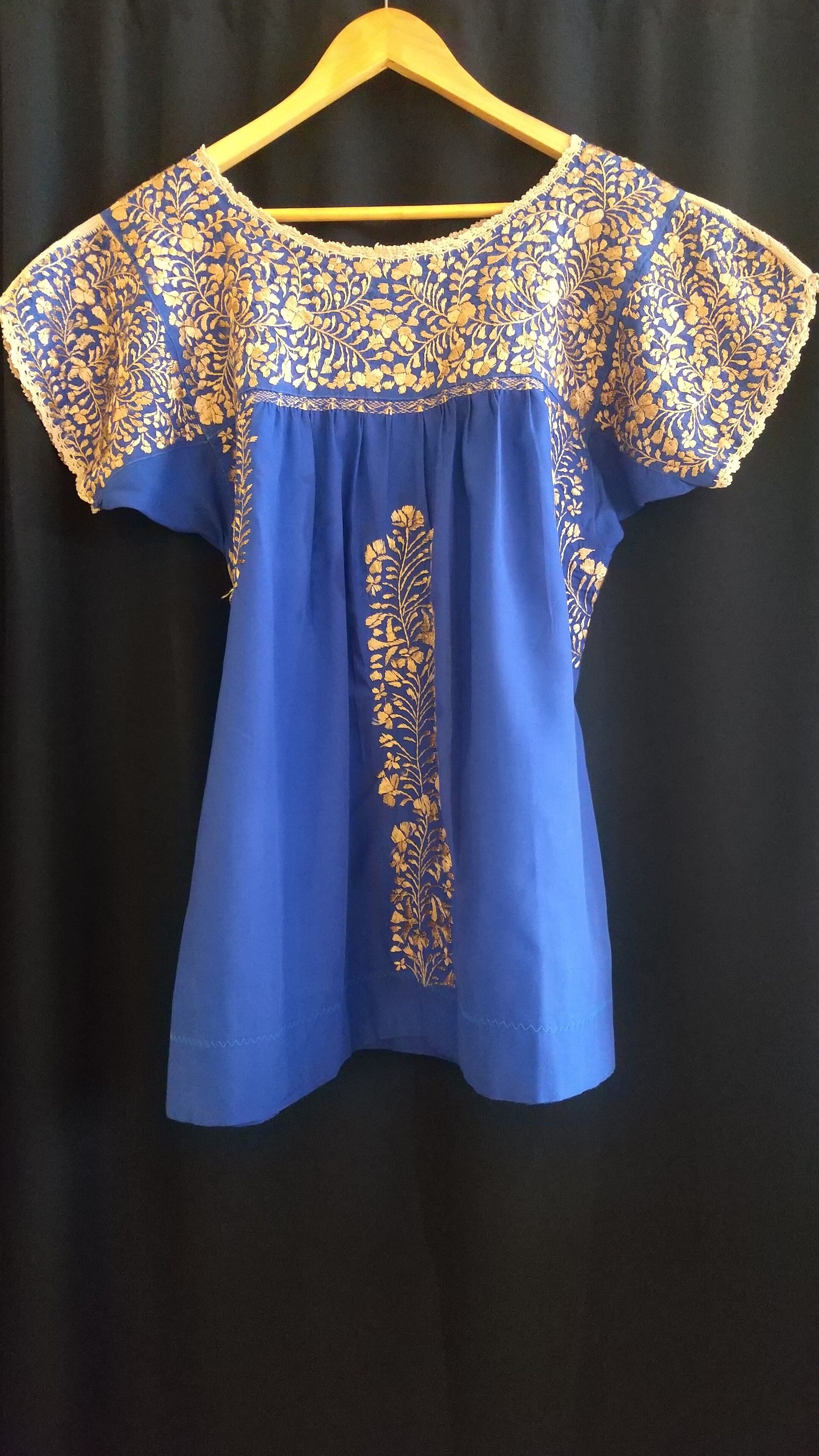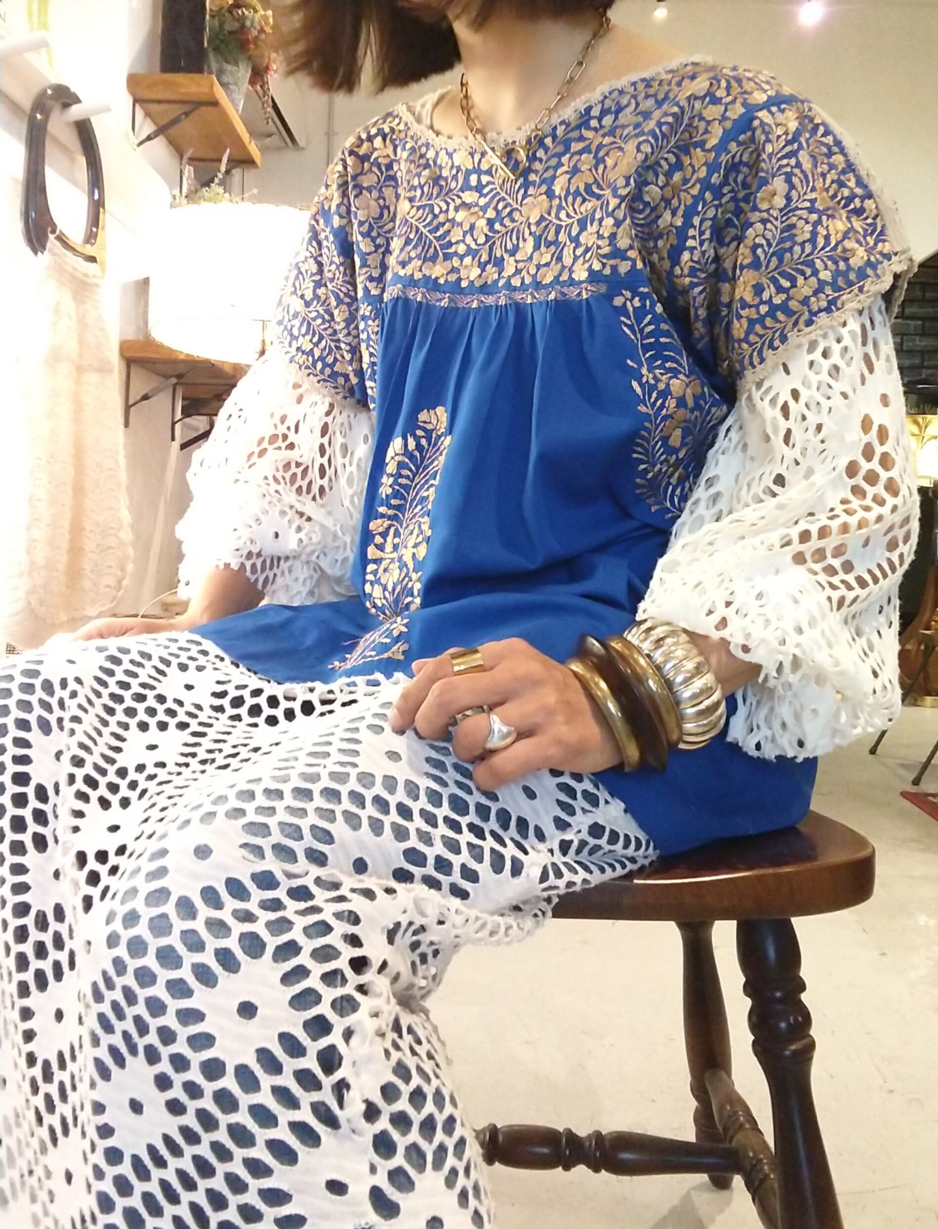 手の込んだ手刺繍が魅力のサンアントニーノ刺繍のヴィンテージチュニック。綺麗なブルーに光沢のあるベージュの糸でびっしりと手刺繍がほどこされた美しいチュニックです。さらりとしたコットン素材。ヒップが隠れる丈感で1枚で着てもレイヤードでも楽しめます。