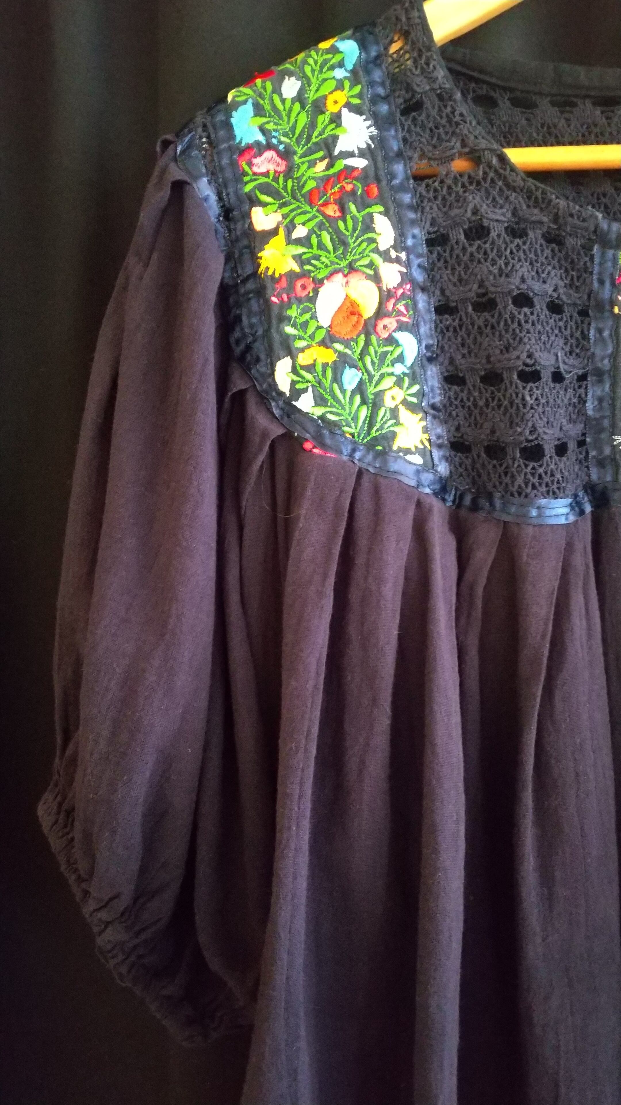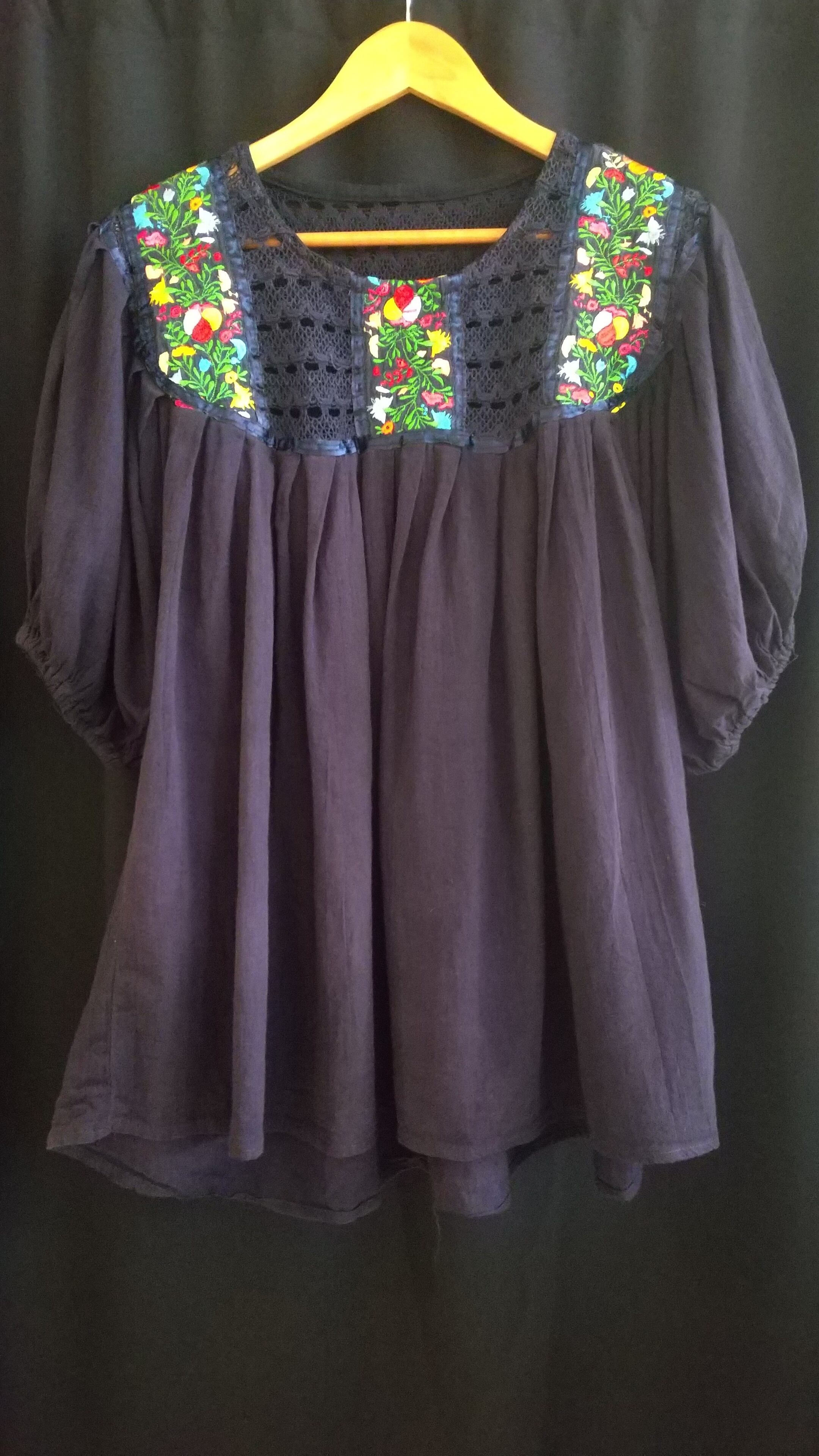 ネイビーの地にカラフルなお花の手刺繍が映えるヴィンテージトップス。素材表記はありませんがコットンのようです。細かい刺繍とデコルテから背中にかけての透かし編みレースがスペシャルな1枚。