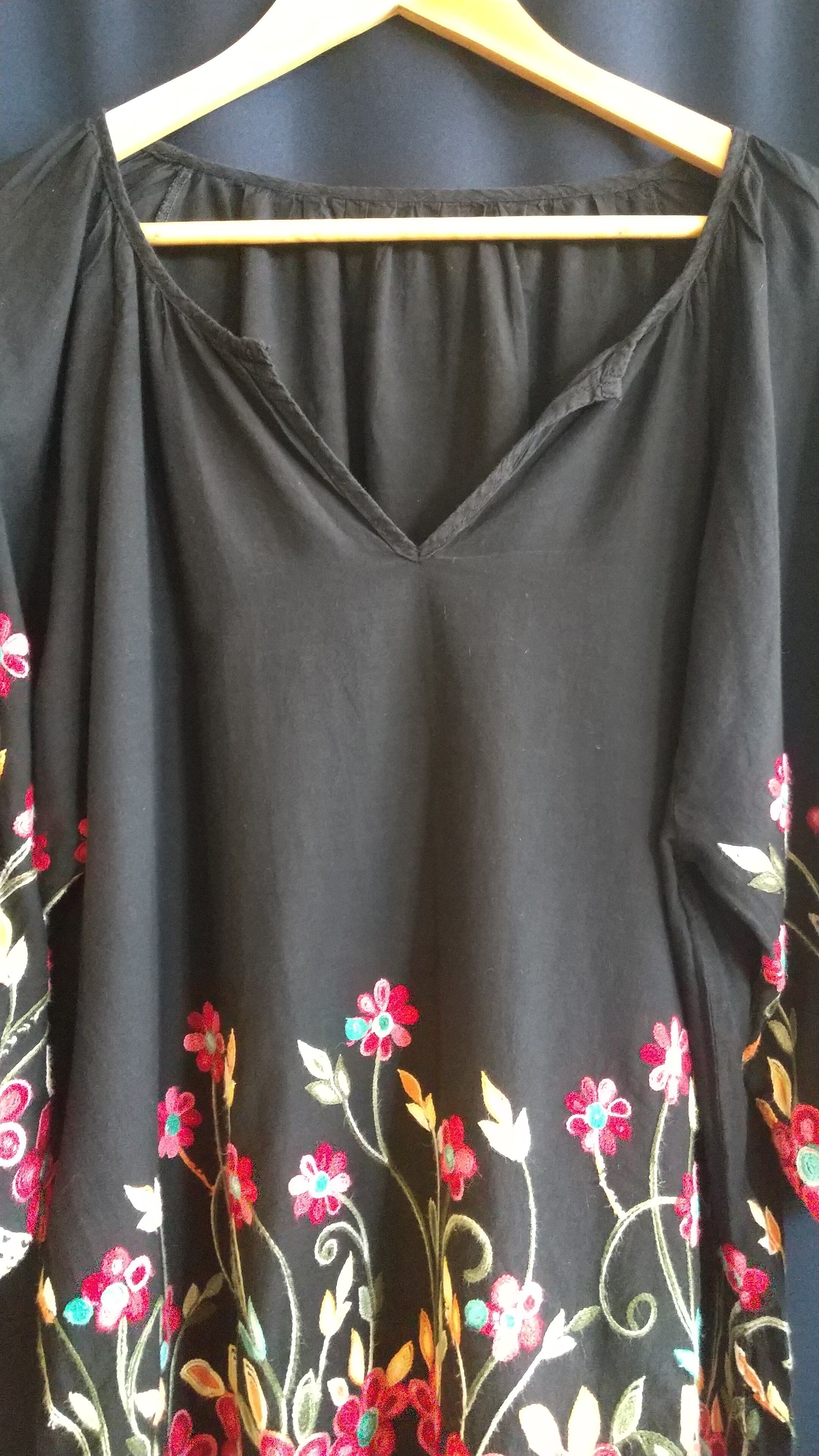 色とりどりのチェーン刺繍が魅力のヴィンテージのインディアンコットントップ。たっぷりのボリュームスリーブにふんわりとしたデザインは軽量で風通しも良く涼しく着られます。元々が大きめサイズですがあえてオーバーサイズで着ても可愛いサイズ感です。
