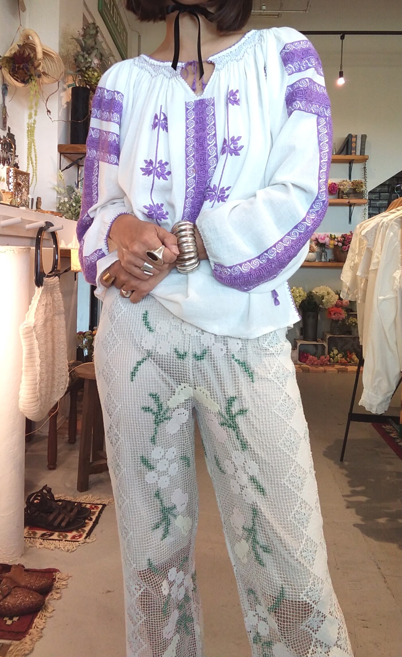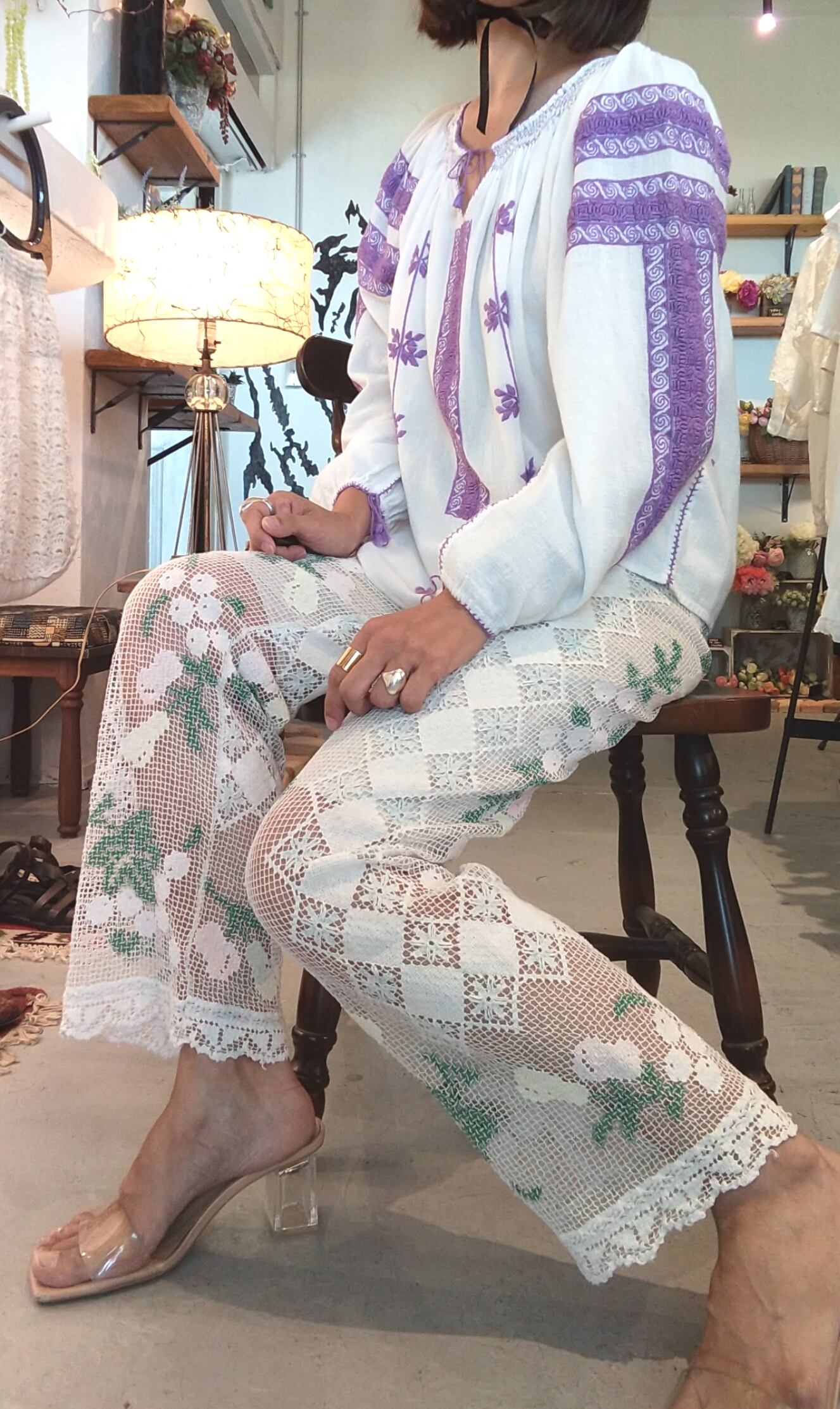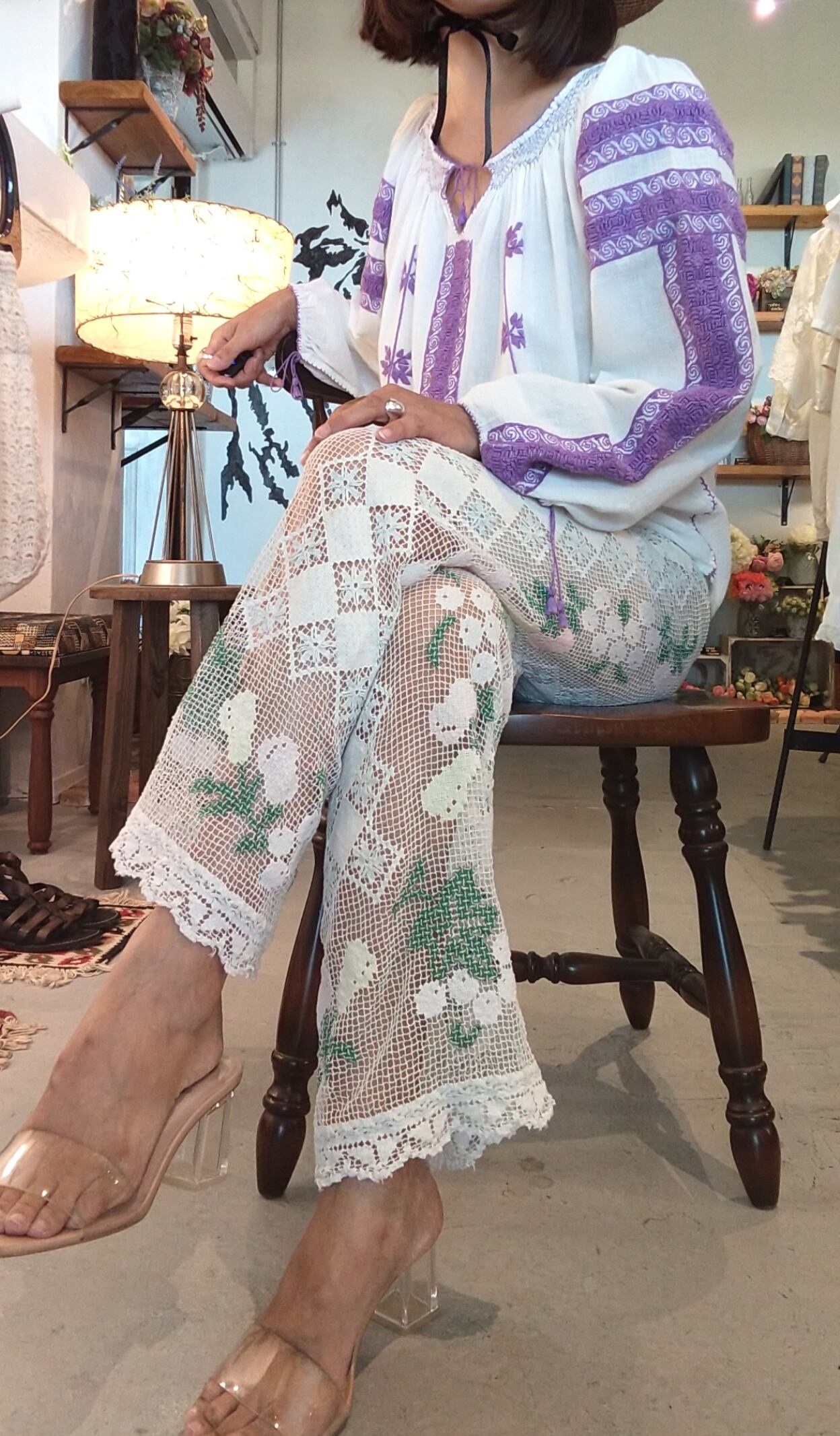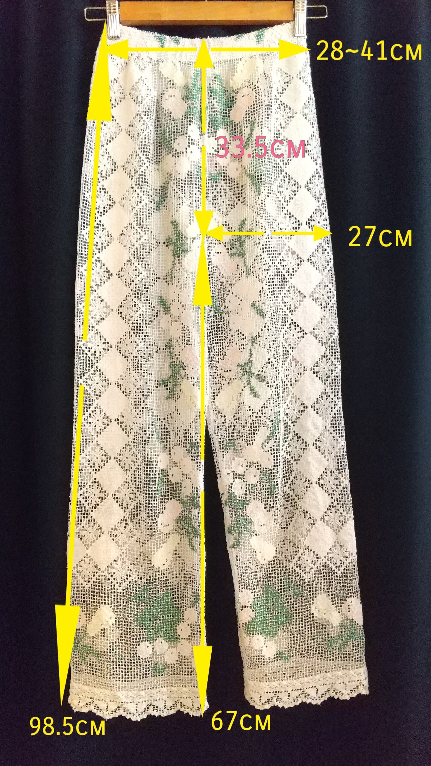 総レースのヴィンテージパンツ。優しいカラーの柄入りで繊細な印象です。ウエストはゴム仕様。裏地は付いていないためアンダーにペチコートの着用が必要です。