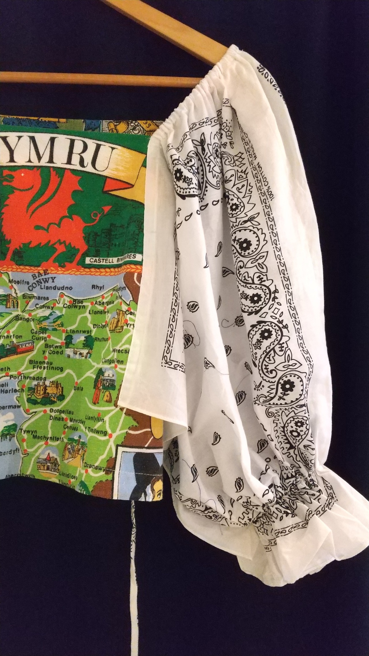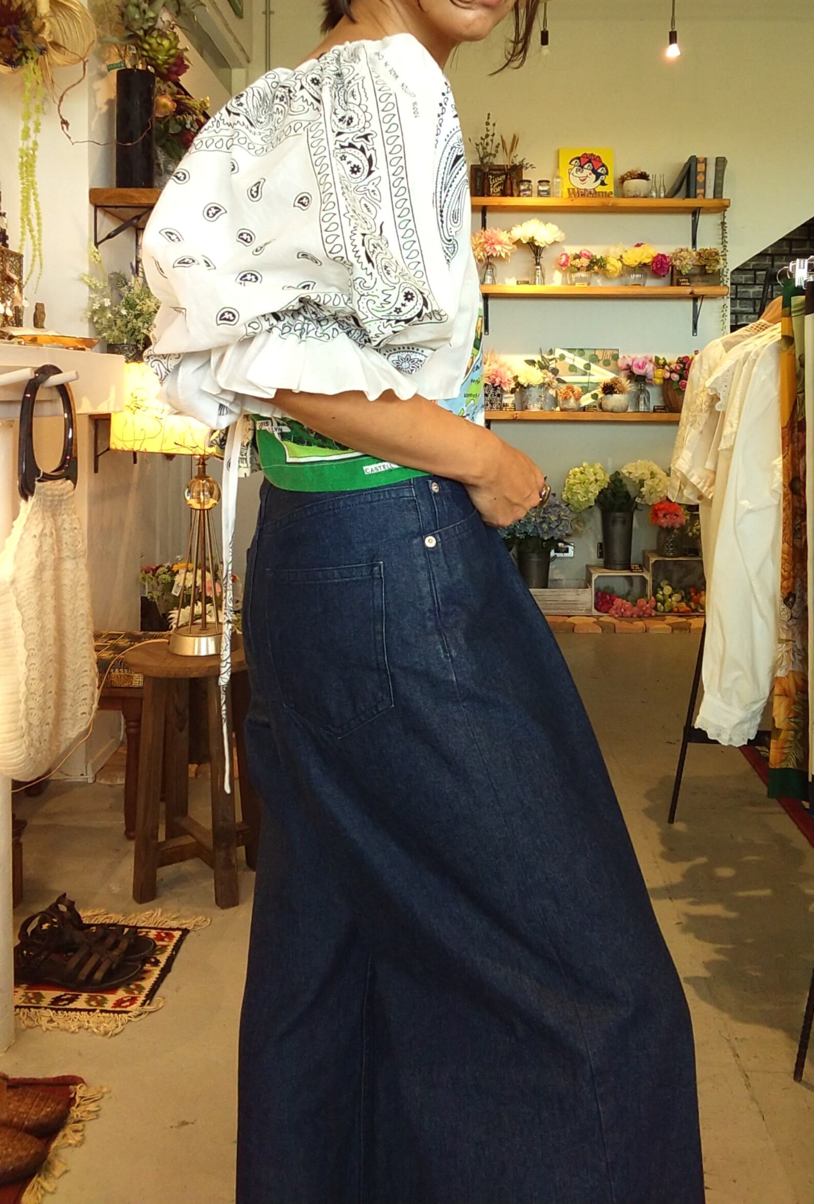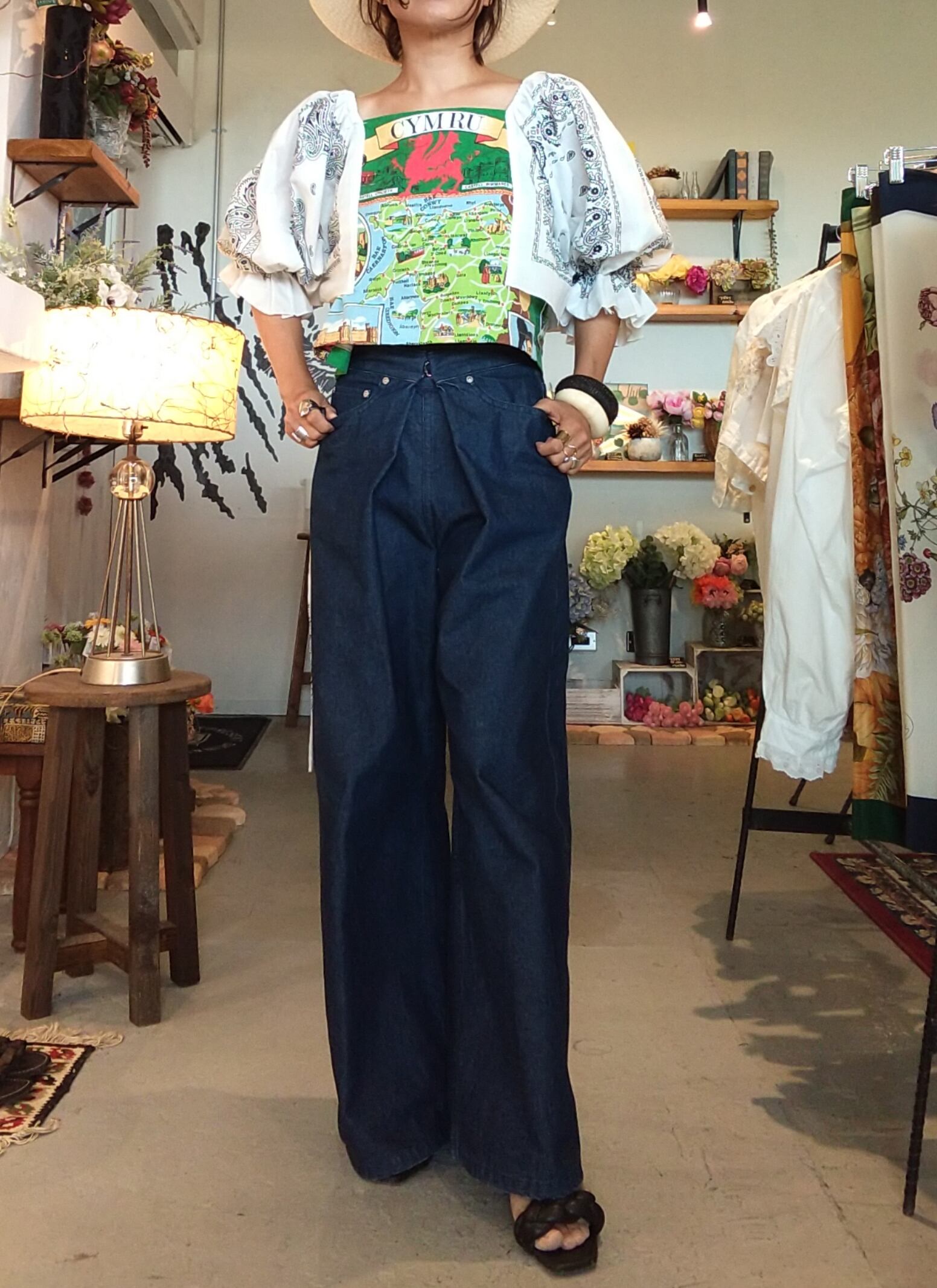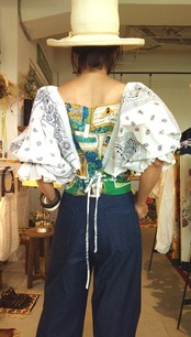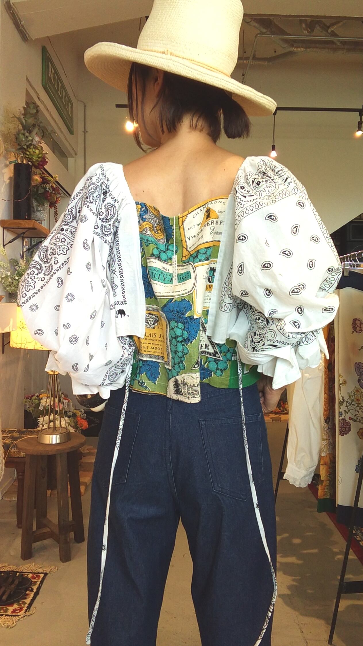 ヴィンテージクロスとバンダナを使用したリメイクトップス。素材はコットンです。直線的なデザインで前後どちらでも着用可能です。ゆとりあるサイジングで幅広いサイズに対応。クロップト丈のためハイウエストのボトムとの相性抜群です。