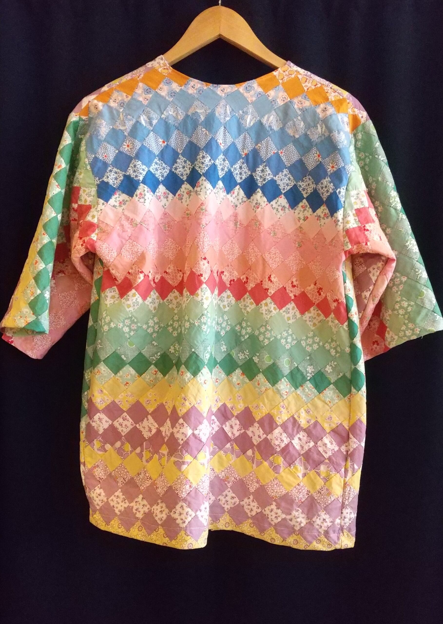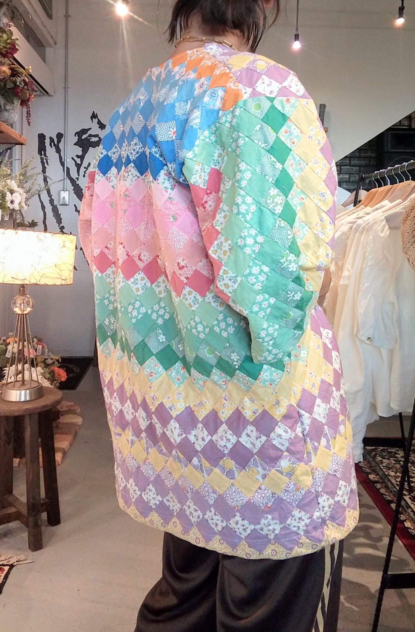 フロントオープンタイプのヴィンテージパッチワークジャケット。ハンドメイドのリメイクのようです。素材はコットン、裏地は付いていません。パステルカラーのグラデーションが可愛い1枚。