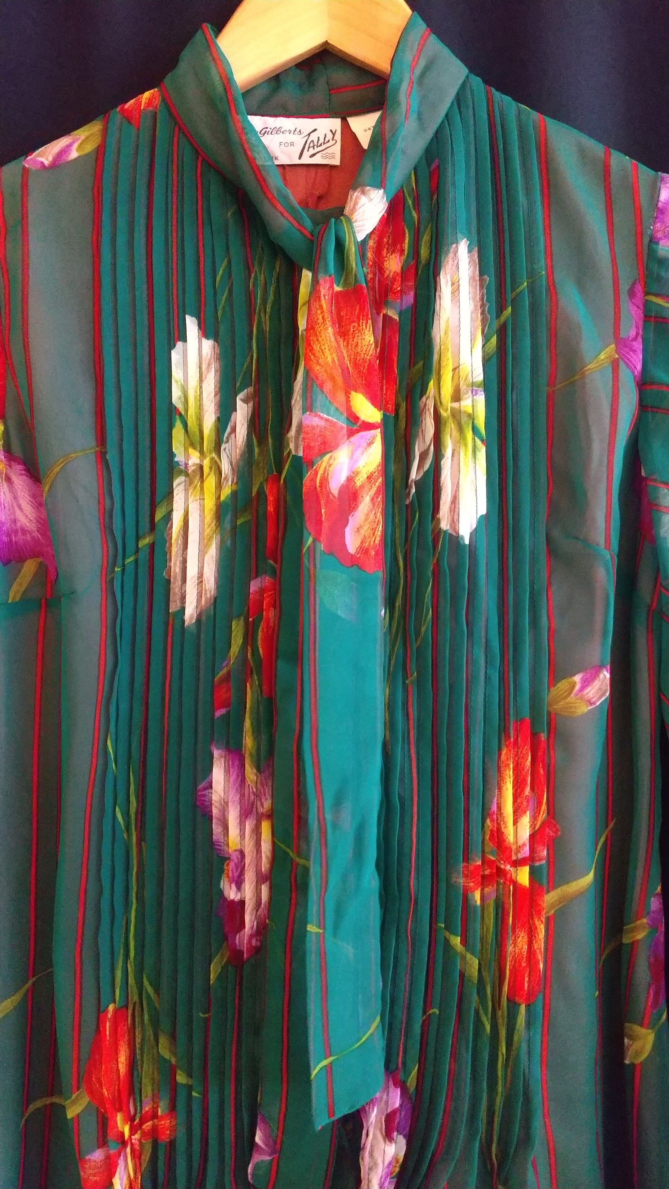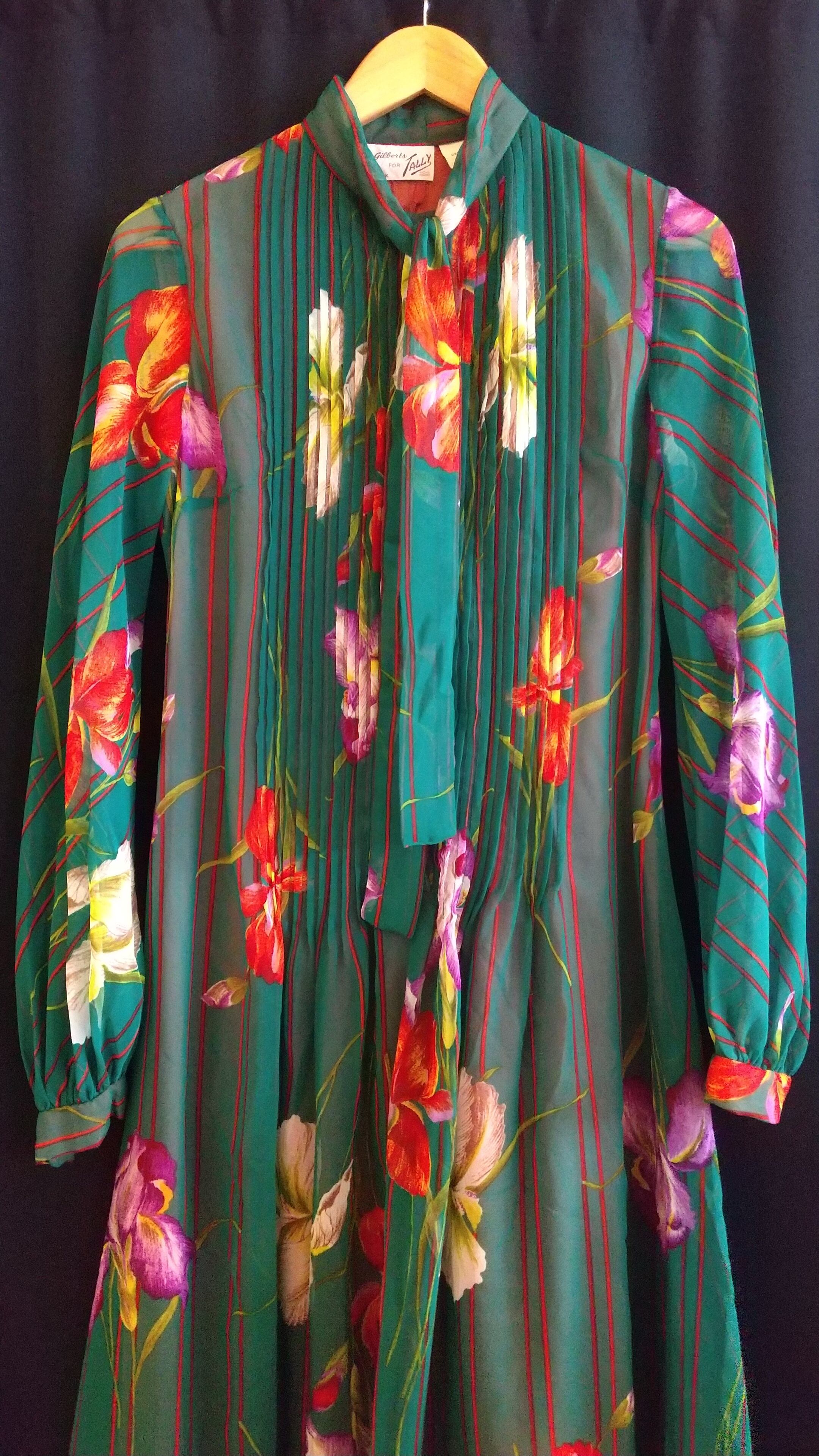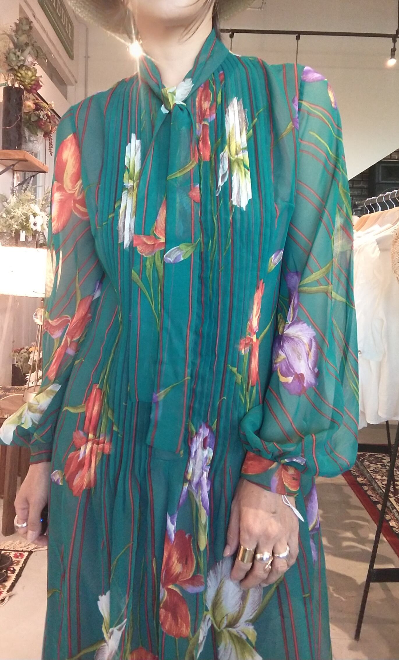 大柄のフラワープリントが素敵なヴィンテージのマキシドレス。素材表記はありませんが透け感のあるシフォン素材です。袖以外は裏地付きなので1枚で着用可能。フロントのボウタイと細かいプリーツ、広がりすぎないフレアシルエットがエレガントです。