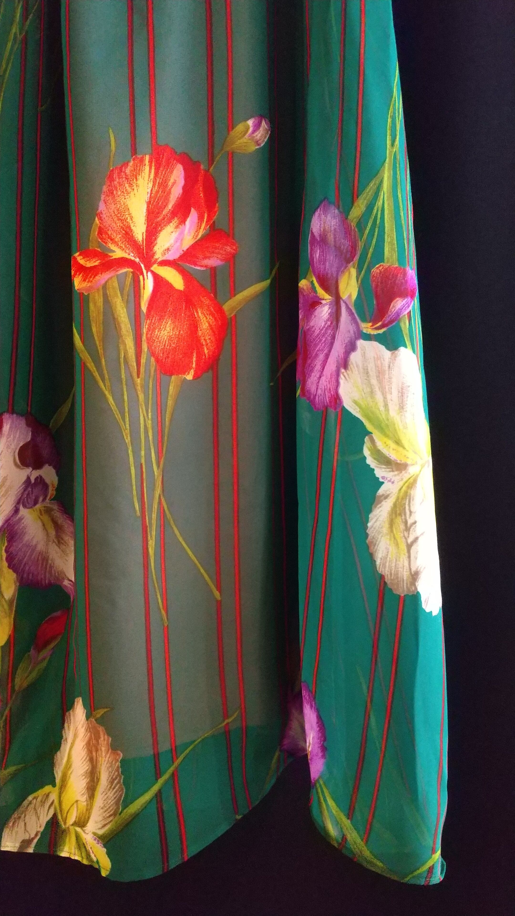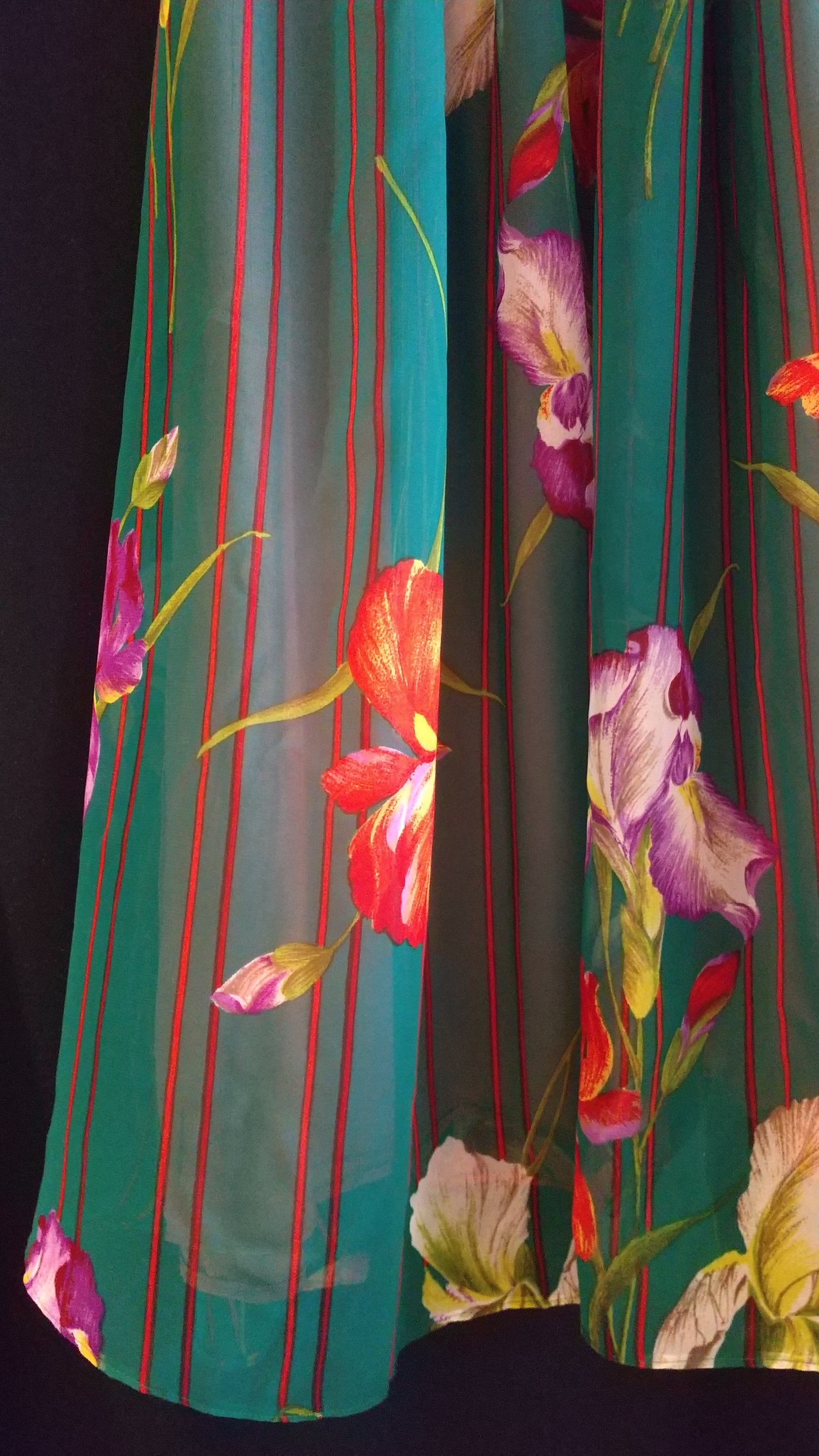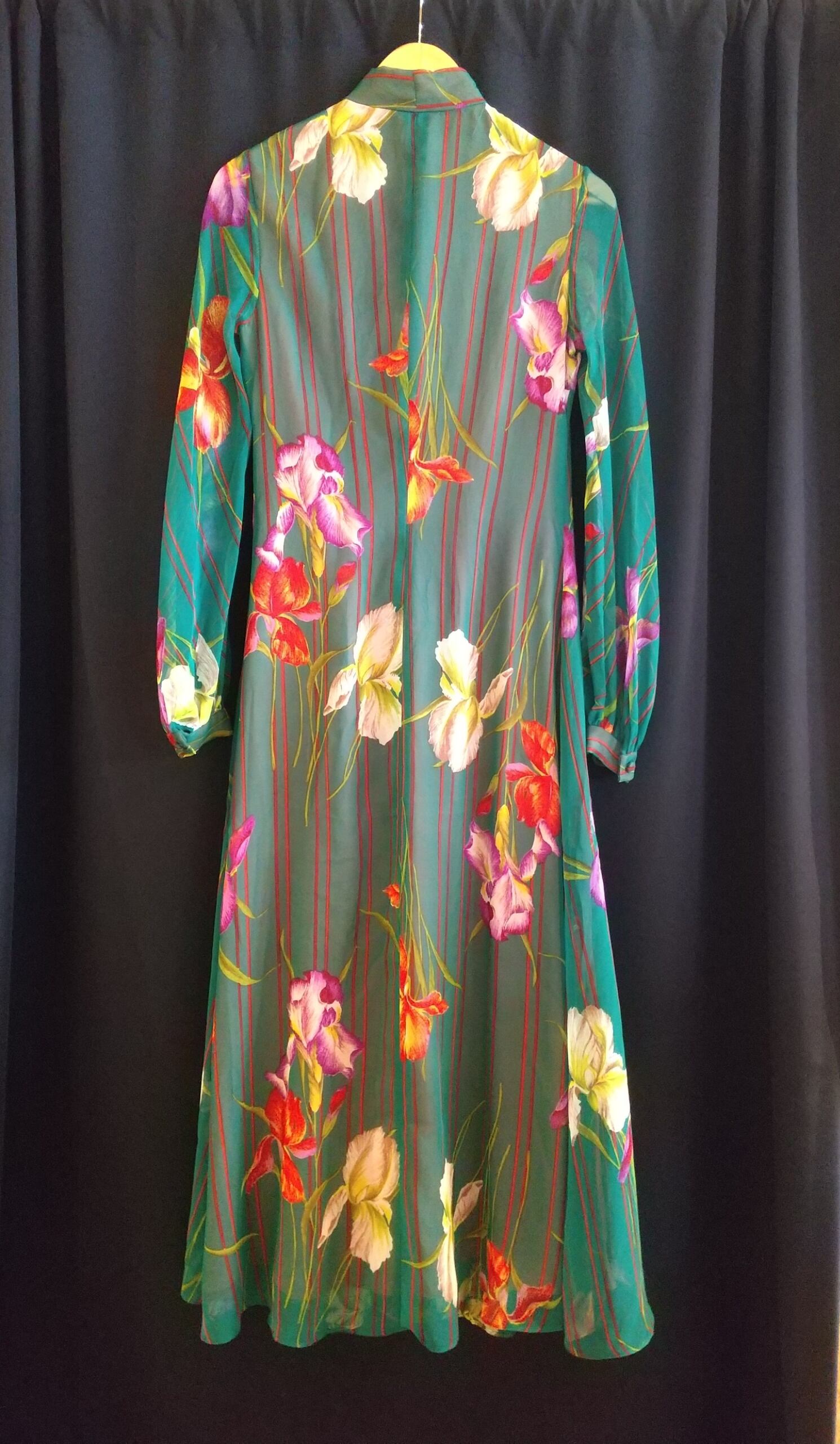 大柄のフラワープリントが素敵なヴィンテージのマキシドレス。素材表記はありませんが透け感のあるシフォン素材です。袖以外は裏地付きなので1枚で着用可能。フロントのボウタイと細かいプリーツ、広がりすぎないフレアシルエットがエレガントです。