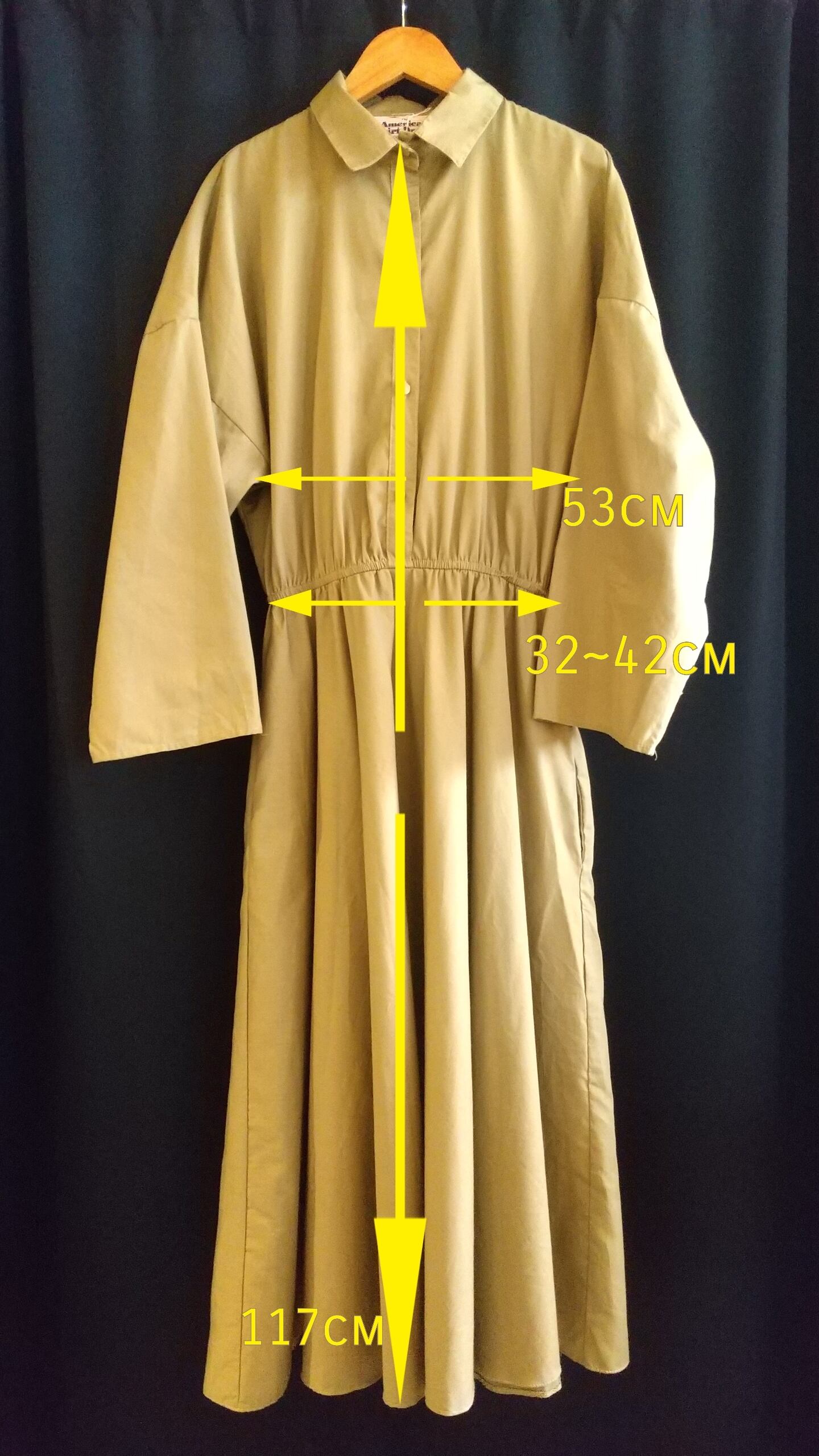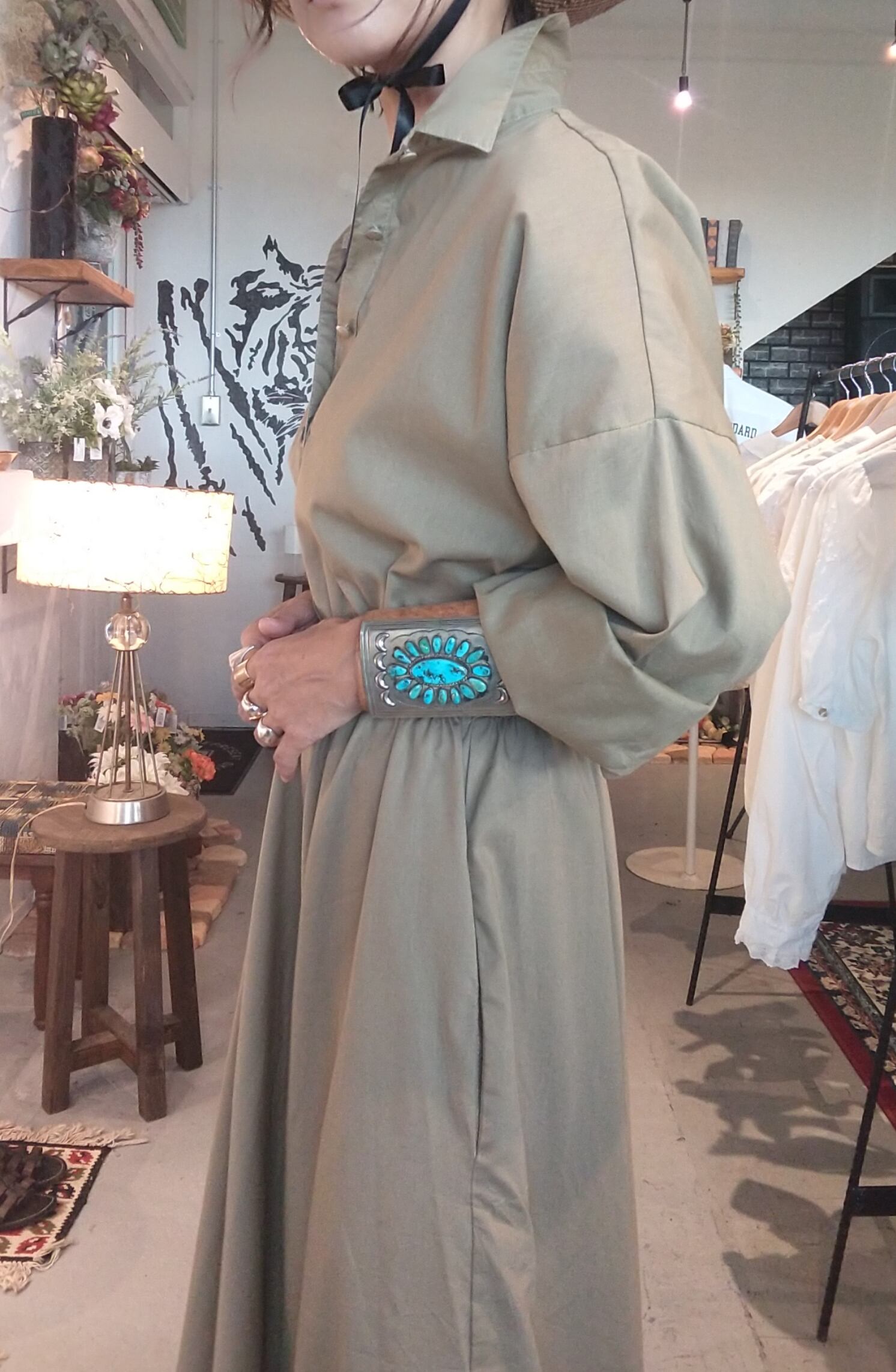 Made in USA のシンプルでかっこいいヴィンテージワンピース。素材表記はありませんがコットンとポリエステルの混紡素材のような薄手の素材です。透け感は無く1枚で着られます。シャツのような辛口なデザインから広がるたっぷりフレアが絶妙な組み合わせです。わざと落とした肩ラインやワイドスリーブ、ポケット付き等、ディテールにこだわりを感じる1枚。