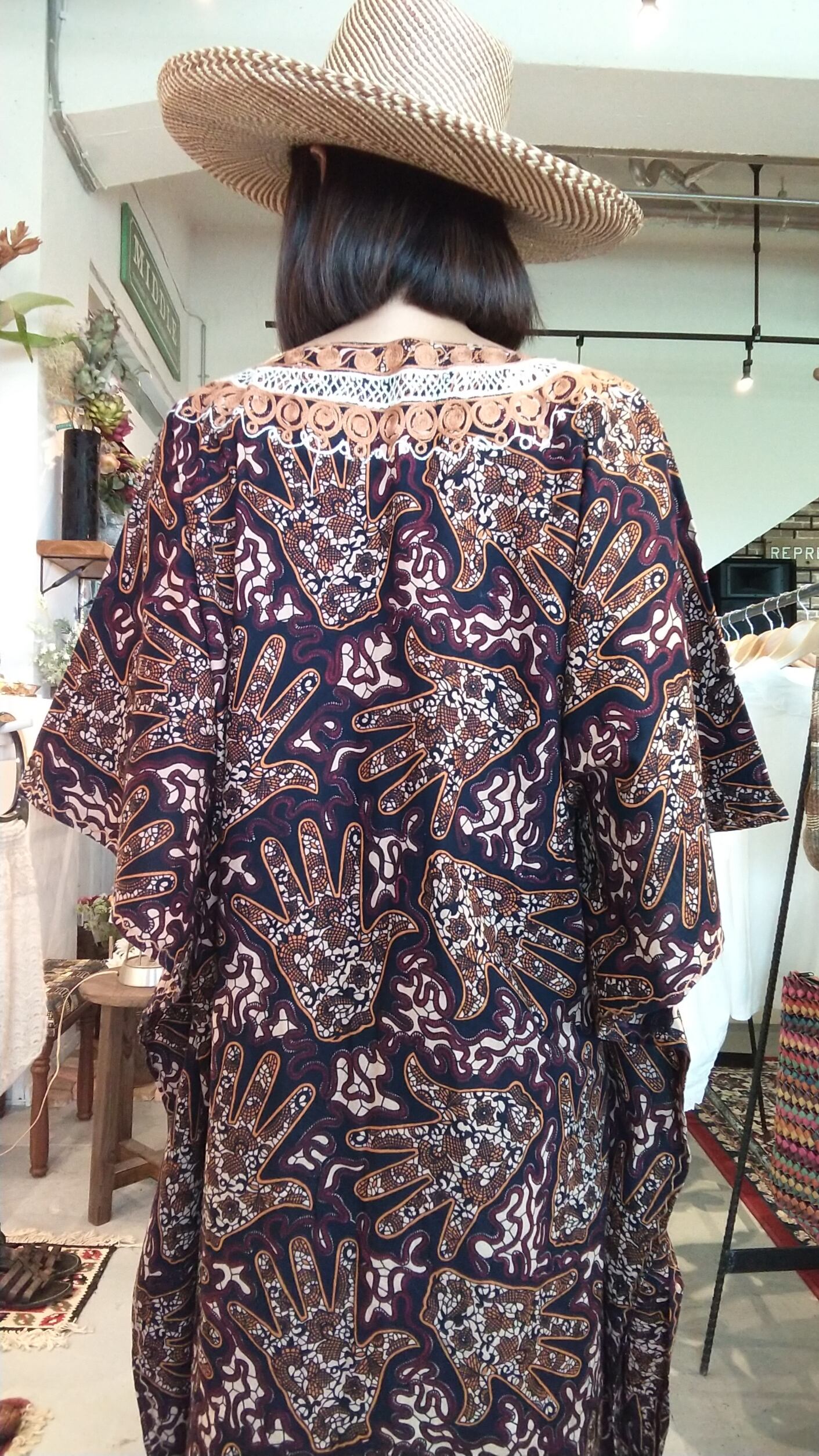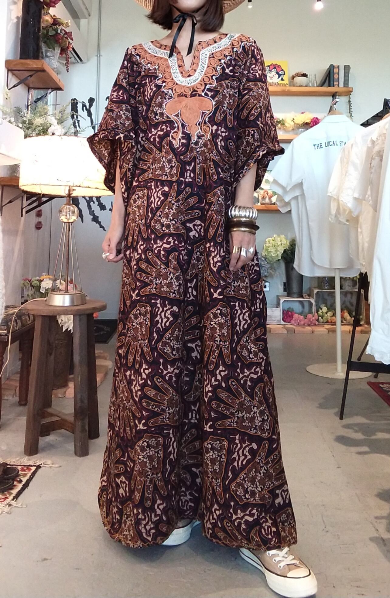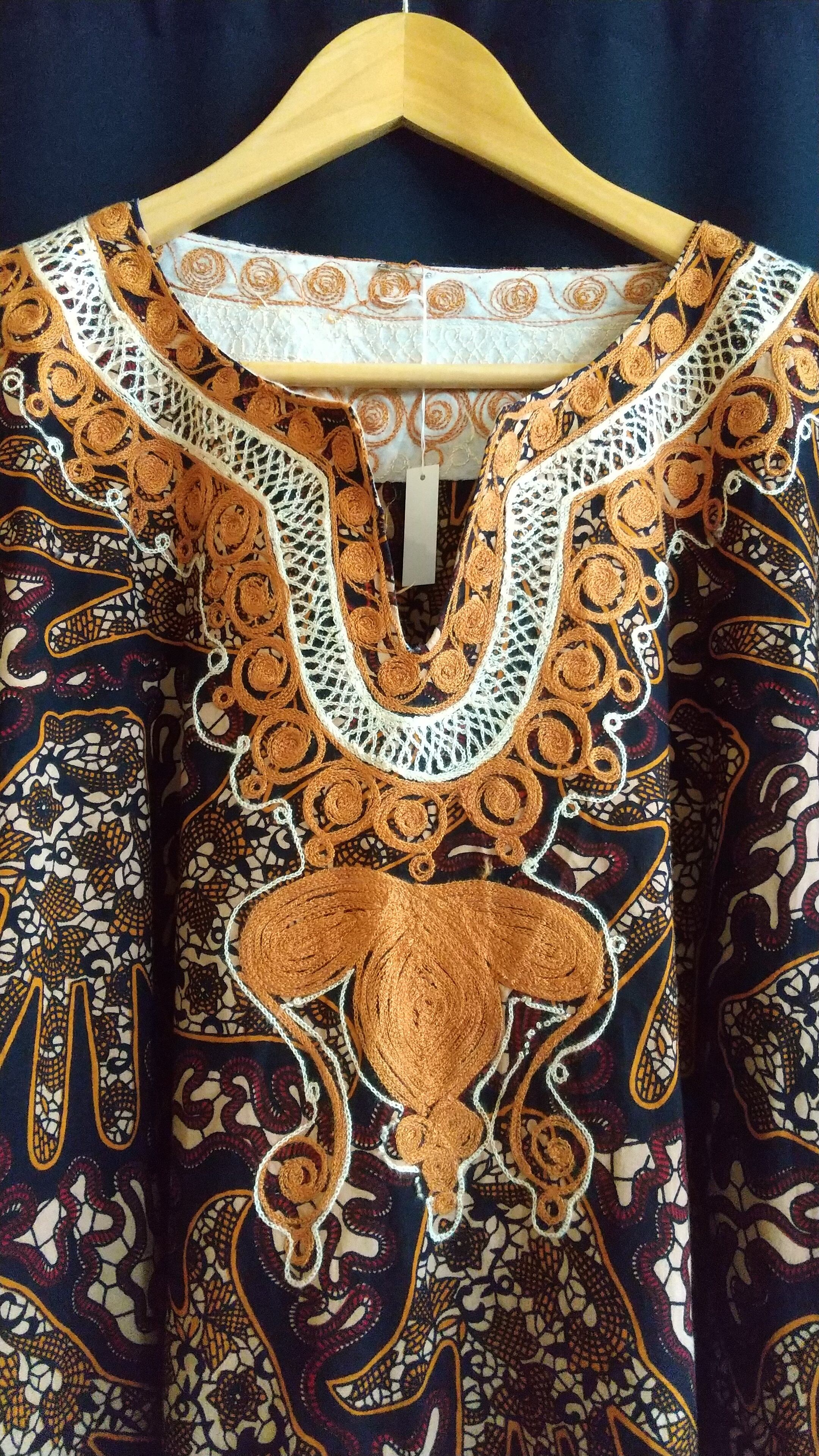 ヴィンテージの刺繍入りカフタンドレス。素材表記はありませんがコットンのようです。透け感は無く1枚で着られる素材てす。締め付け感無く、風の通る涼しくストレスフリーなデザイン。