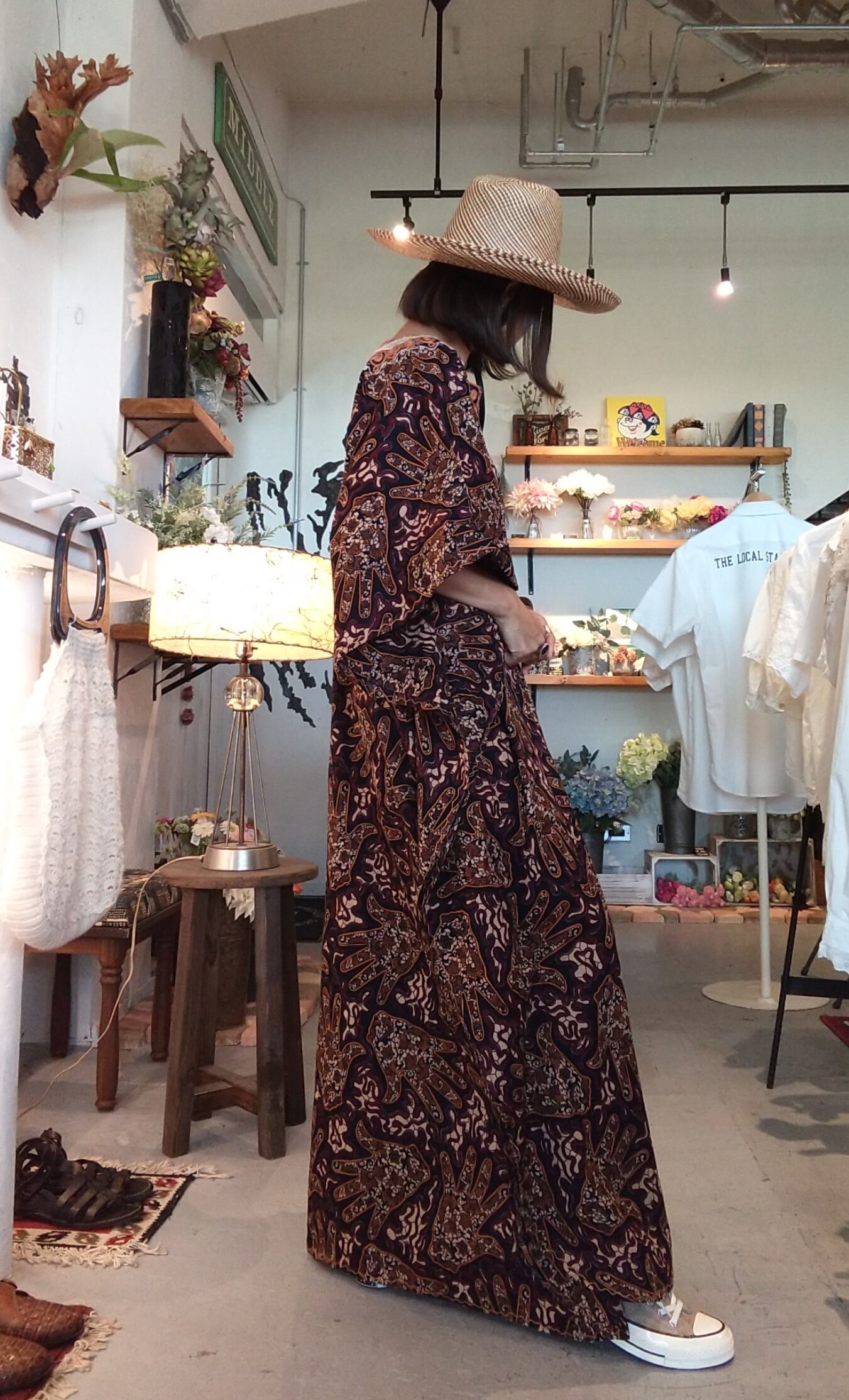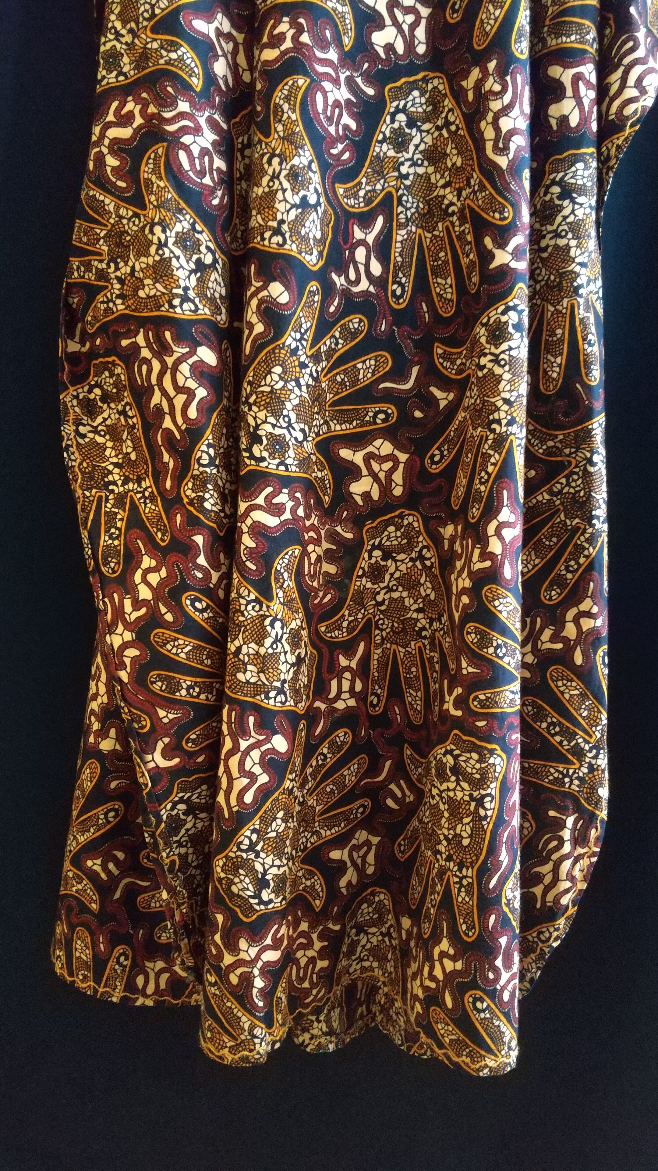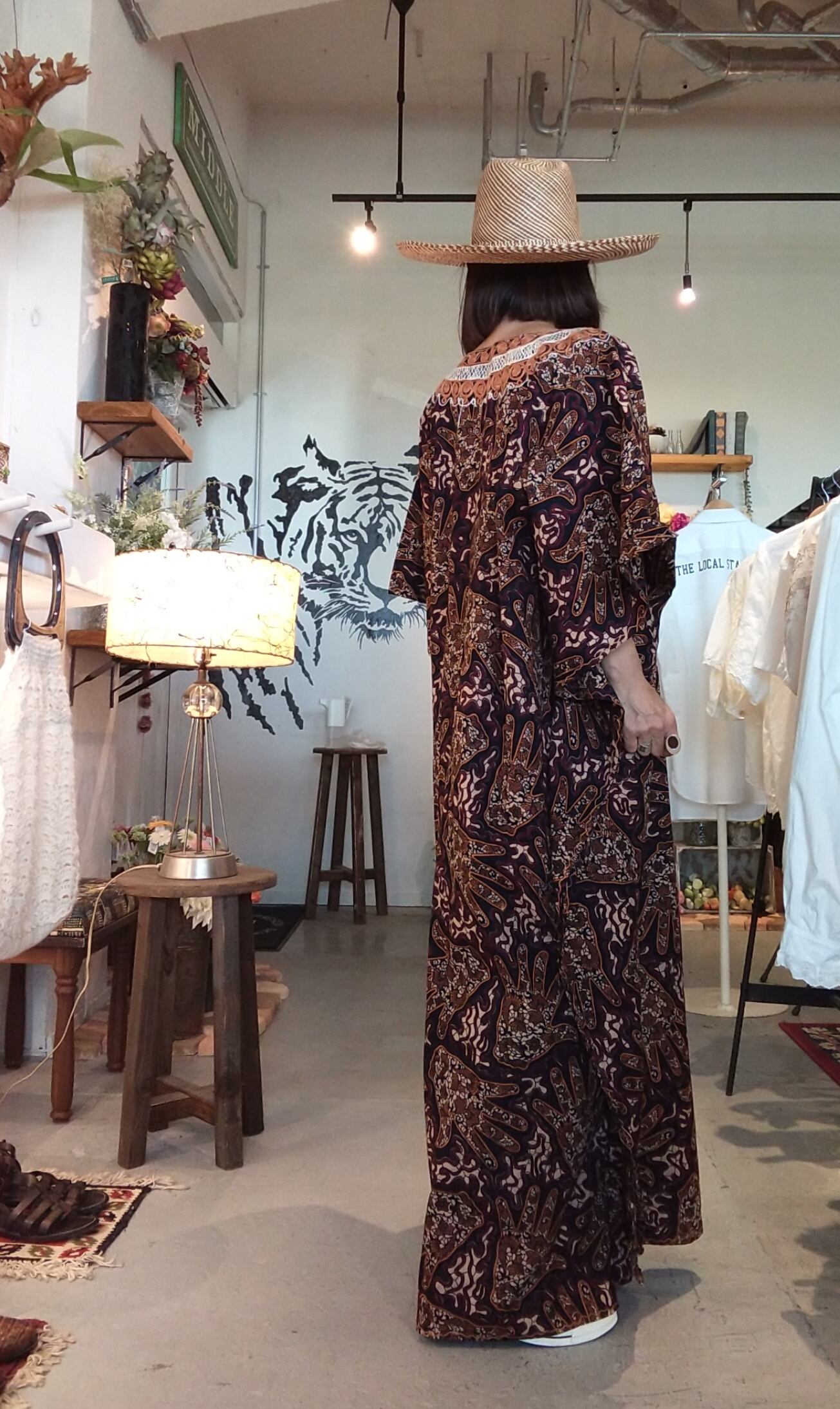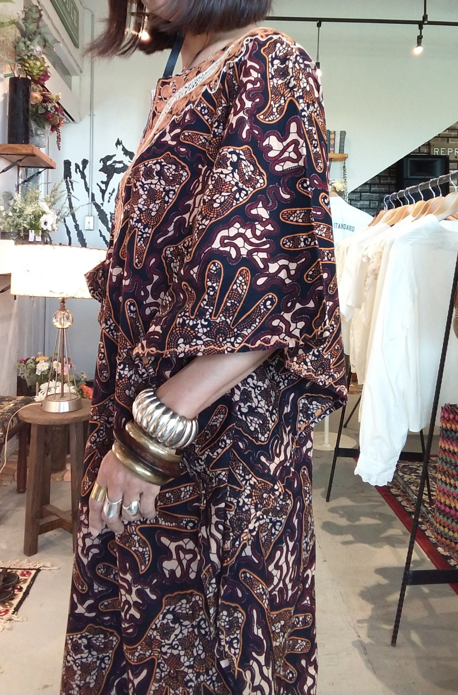ヴィンテージの刺繍入りカフタンドレス。素材表記はありませんがコットンのようです。透け感は無く1枚で着られる素材てす。締め付け感無く、風の通る涼しくストレスフリーなデザイン。