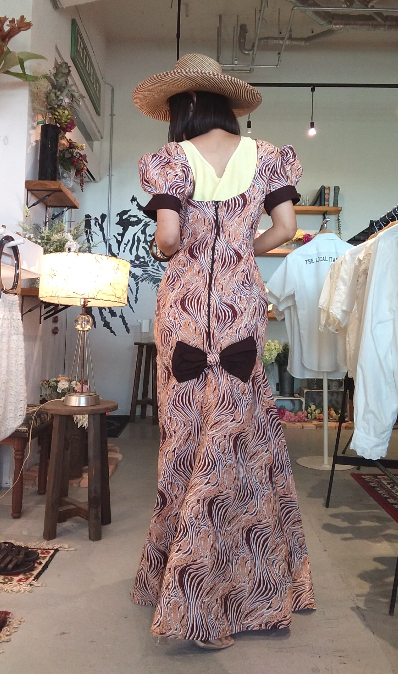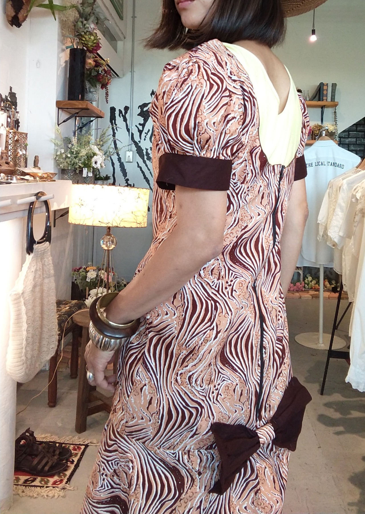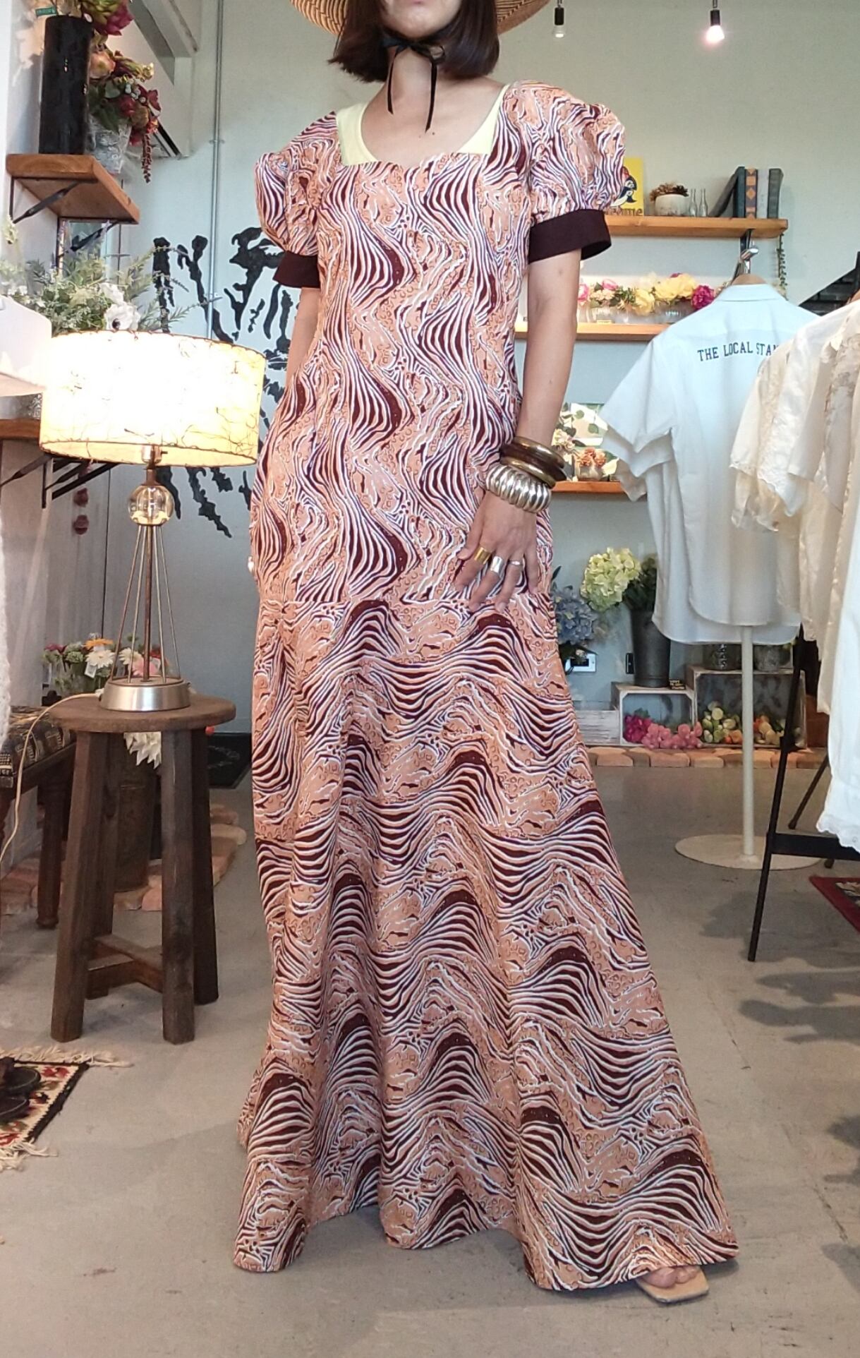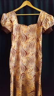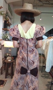 アフリカンプリントのデザインマキシドレス。素材表記はありませんが張りのあるコットンのようです。透け感はありません。大きく開いたバックに低い位置でのリボンがアクセント。体の線に沿うシルエットから膝下で広がるマーメイドラインが美しいドレスです。