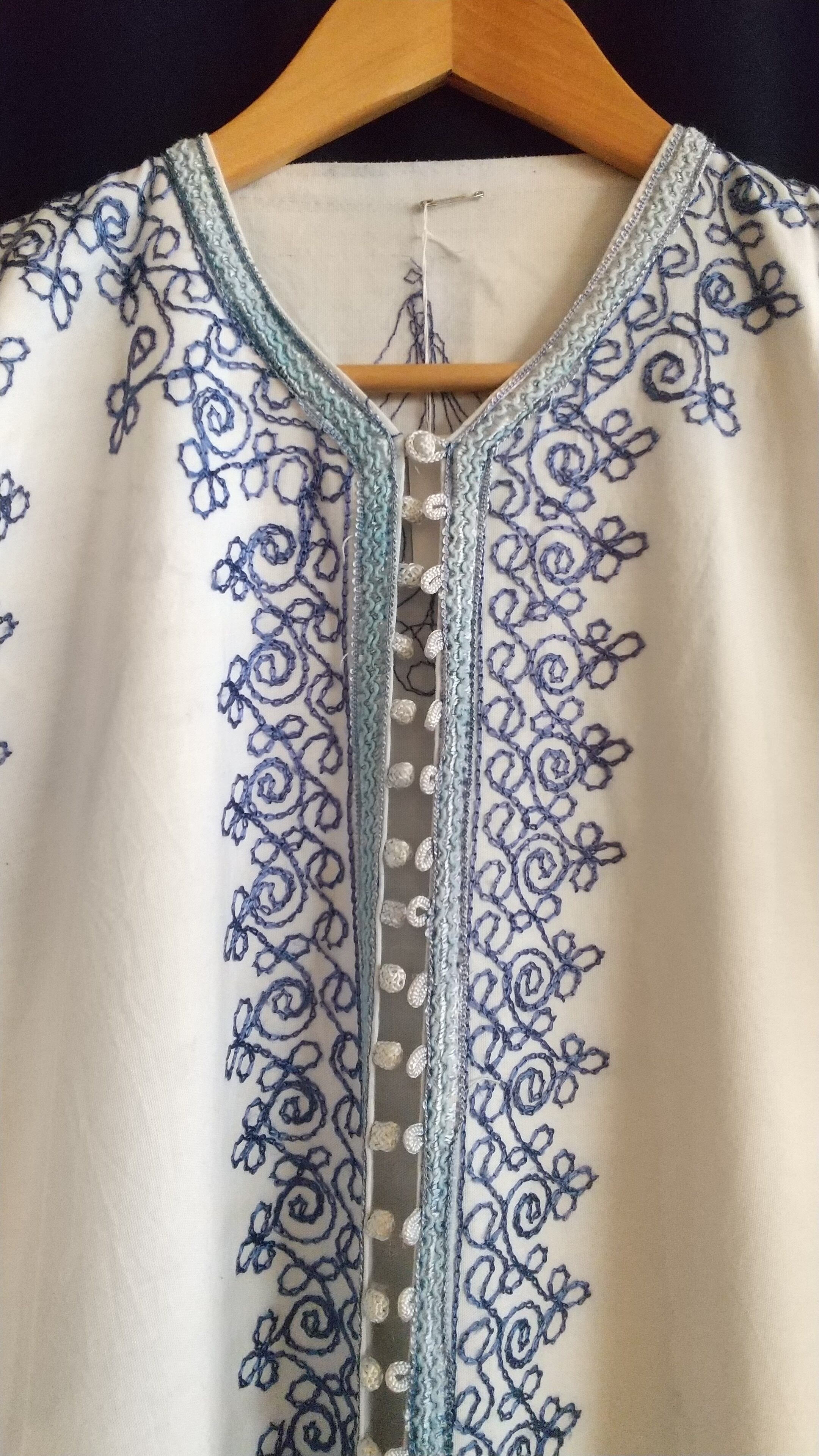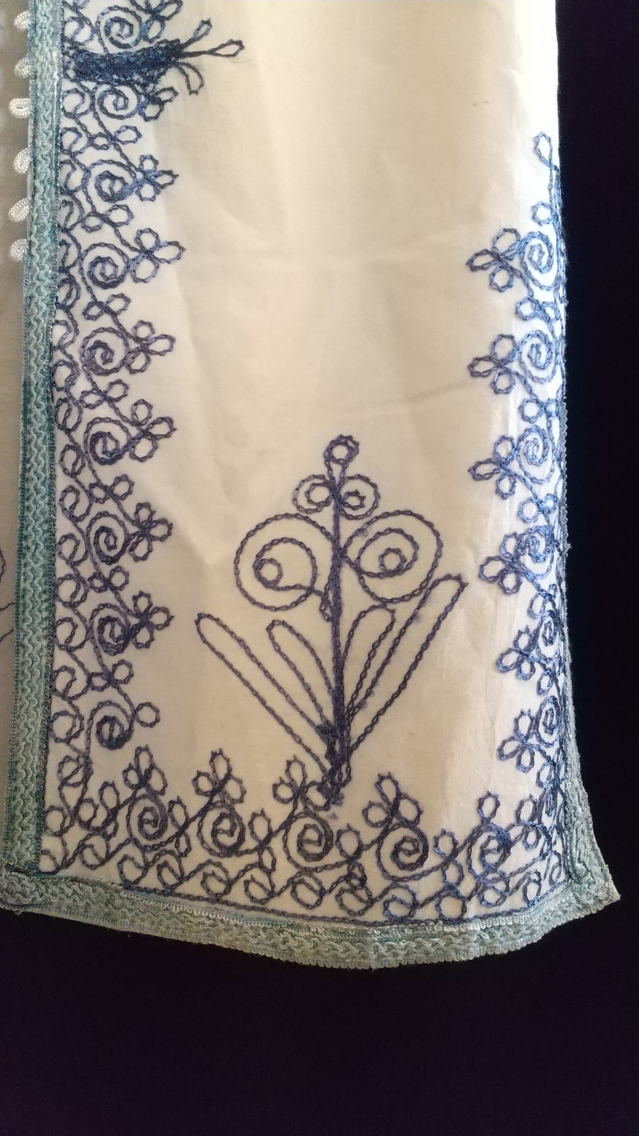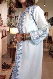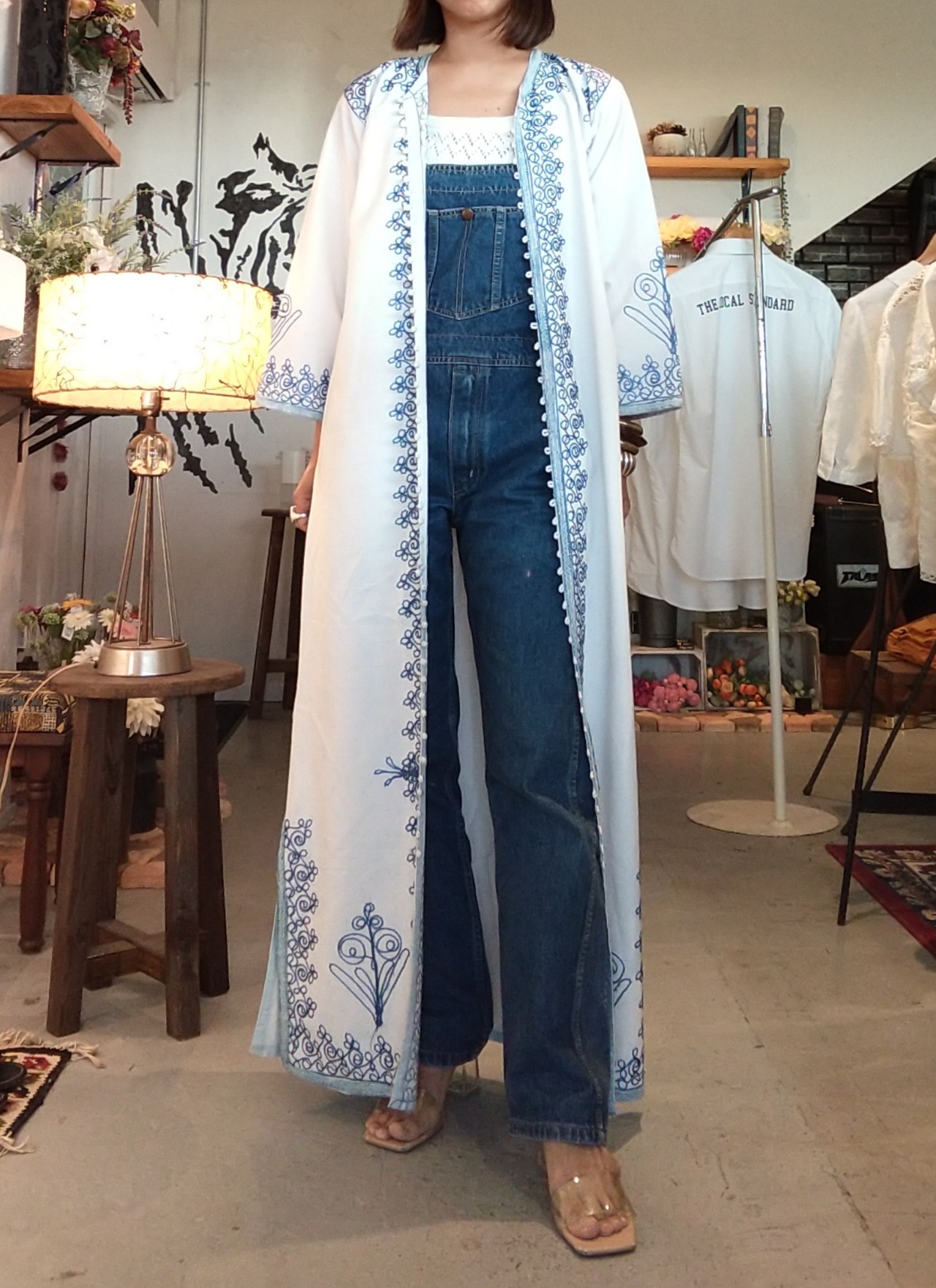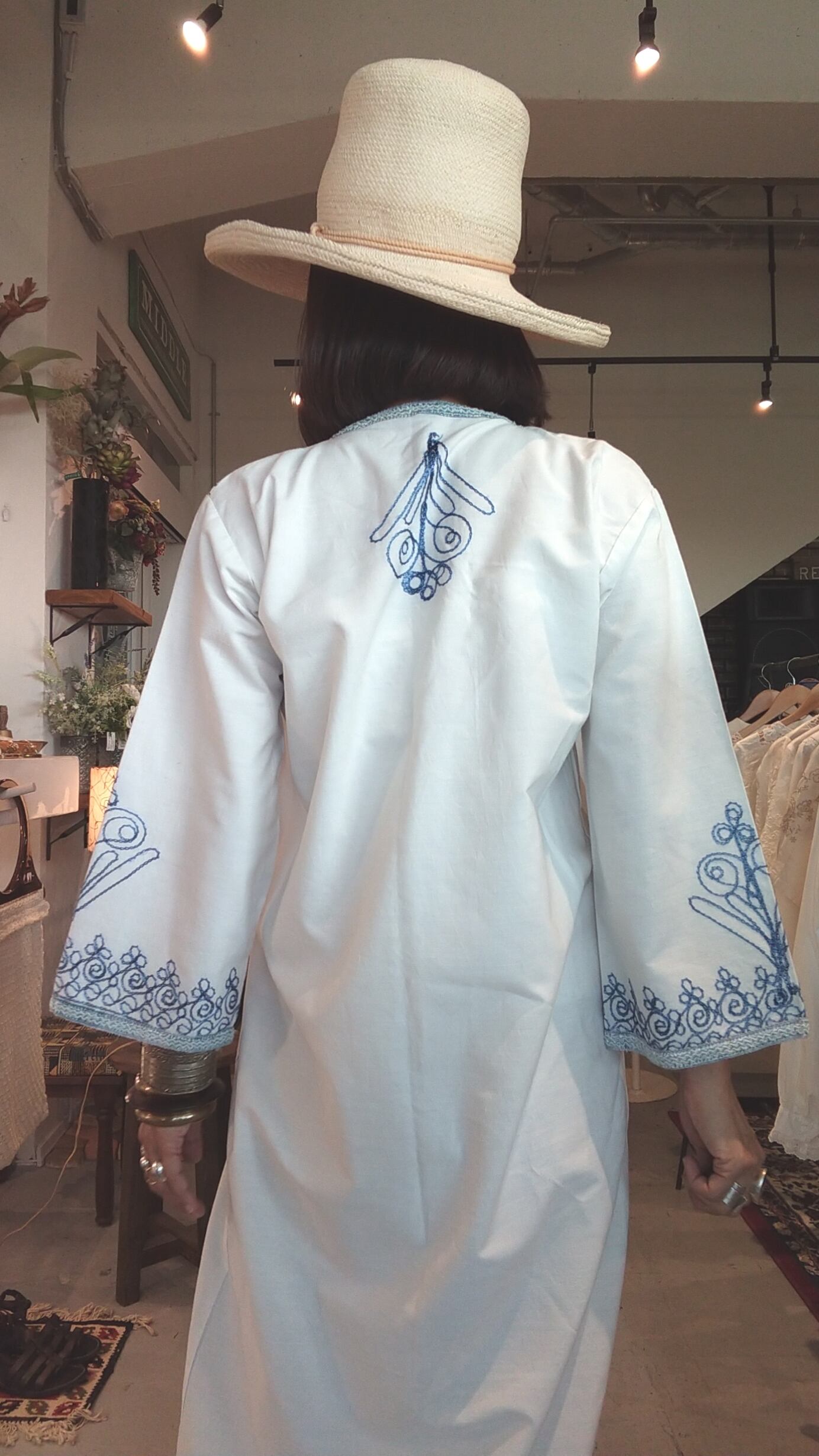白地に薄いブルーの刺繍が爽やかなモロッコのヴィンテージロングガウン。素材表記はありませんがコットンのようです。さらりとした肌触りでやや張り感があります。透け感はありません。フロントにずらりと連なるボタンが圧巻。フロントオープンでさっと羽織れてシーズンレスで長く着られる1枚です。