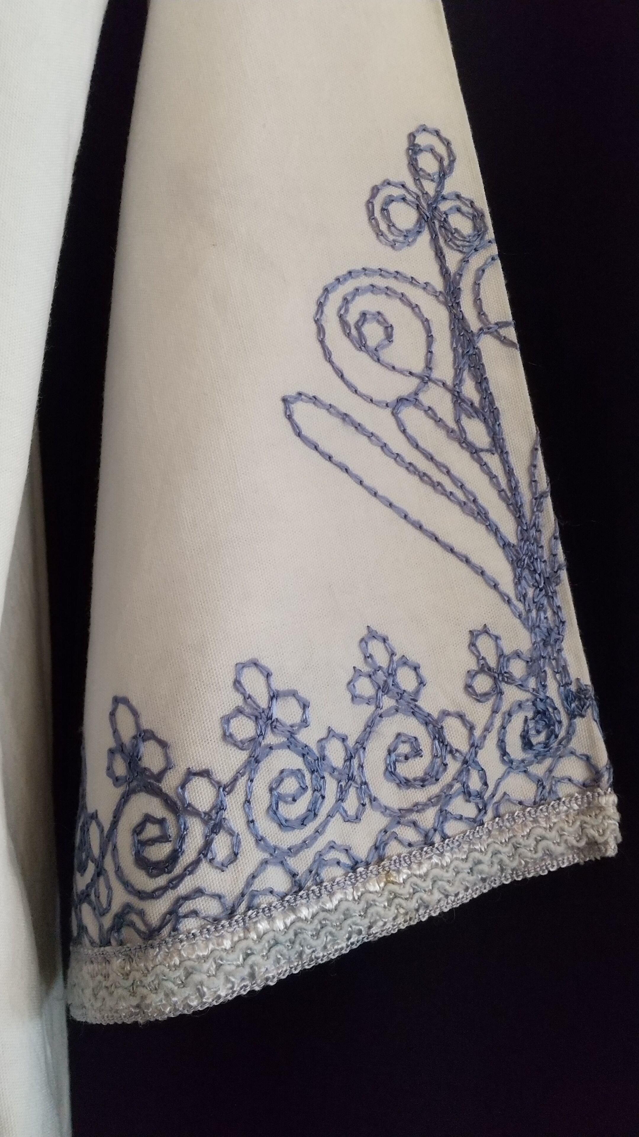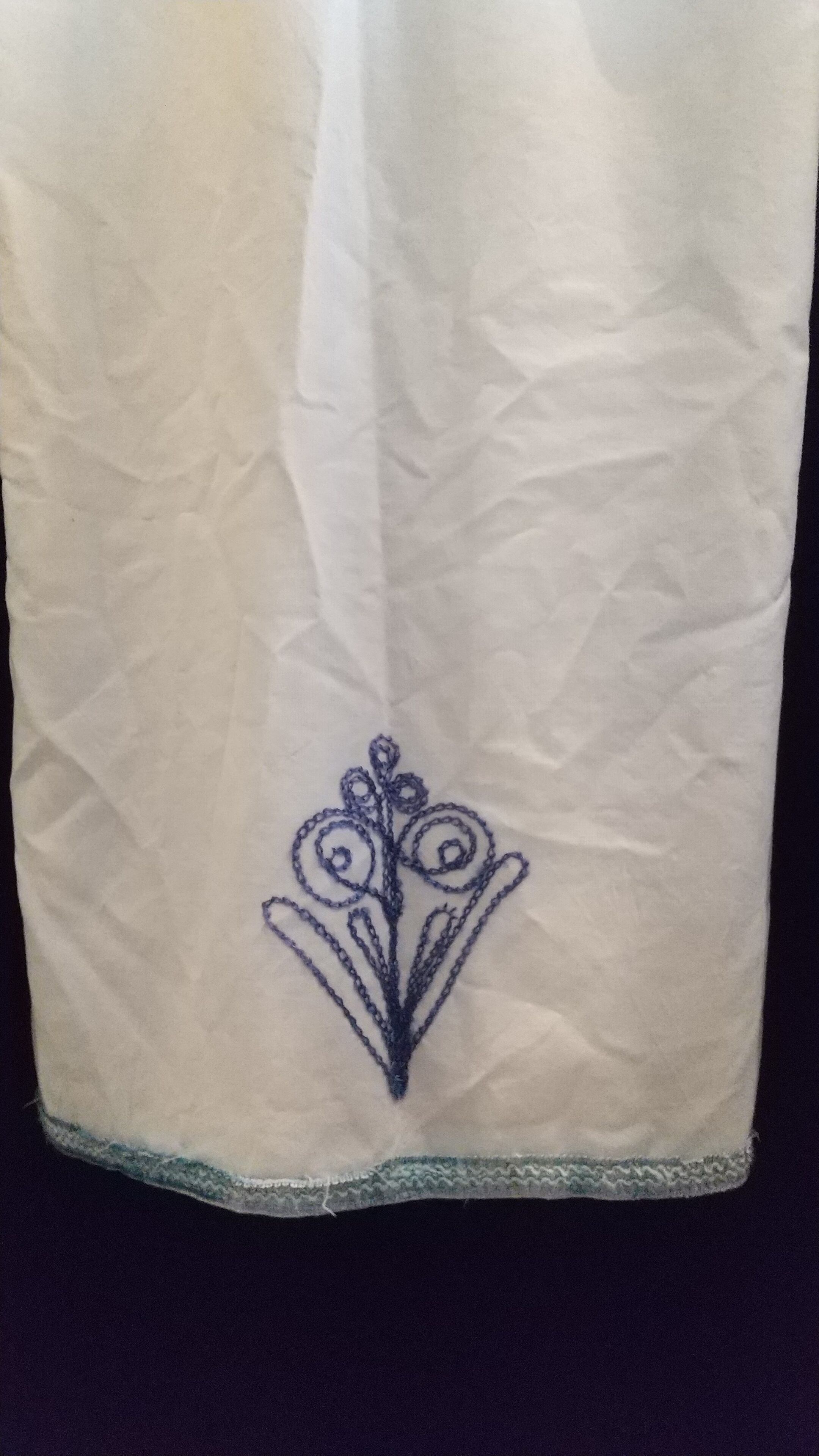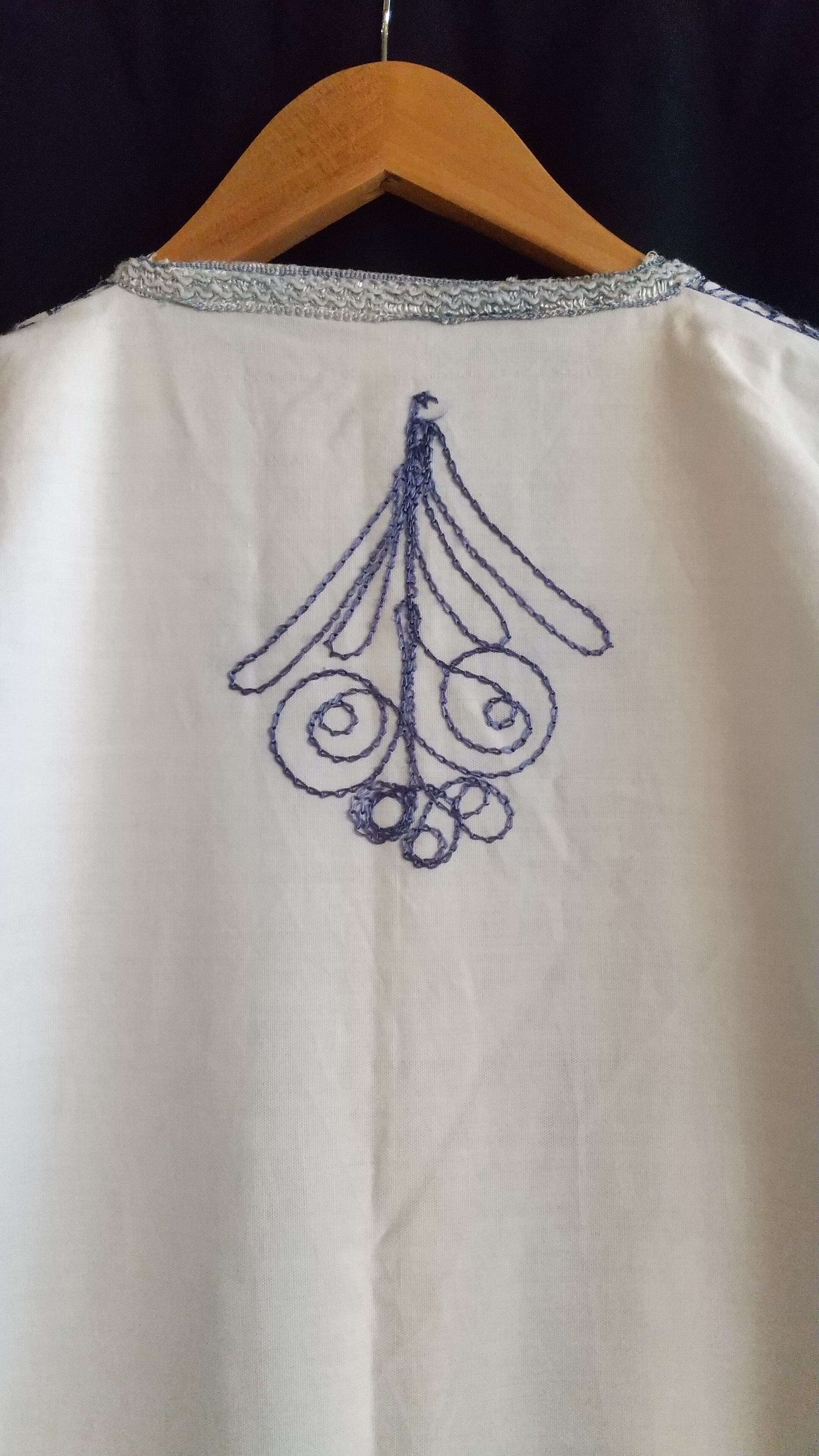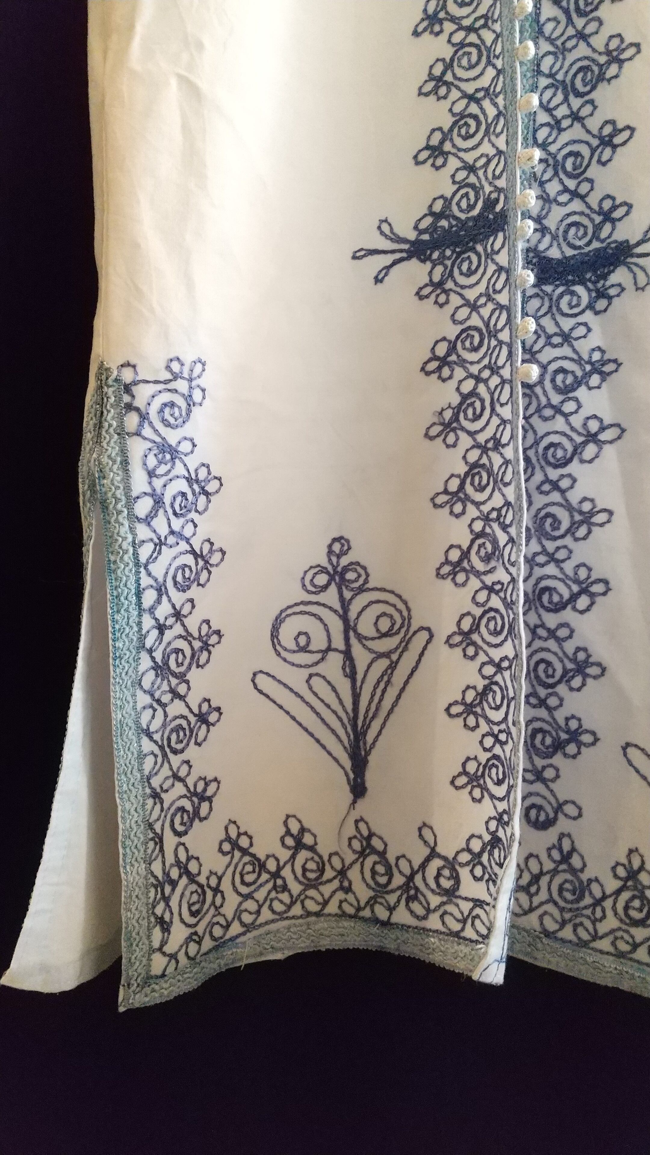白地に薄いブルーの刺繍が爽やかなモロッコのヴィンテージロングガウン。素材表記はありませんがコットンのようです。さらりとした肌触りでやや張り感があります。透け感はありません。フロントにずらりと連なるボタンが圧巻。フロントオープンでさっと羽織れてシーズンレスで長く着られる1枚です。