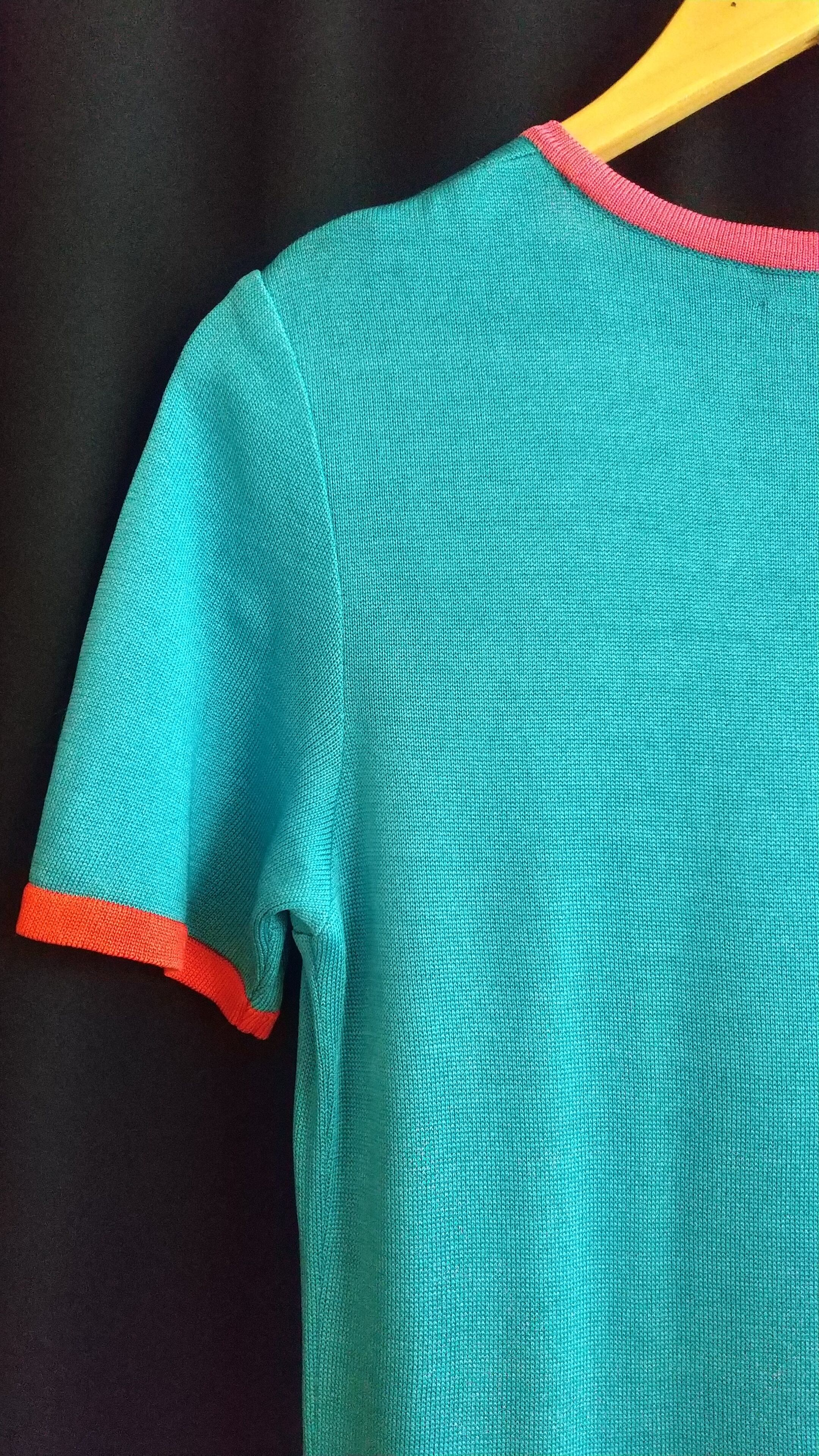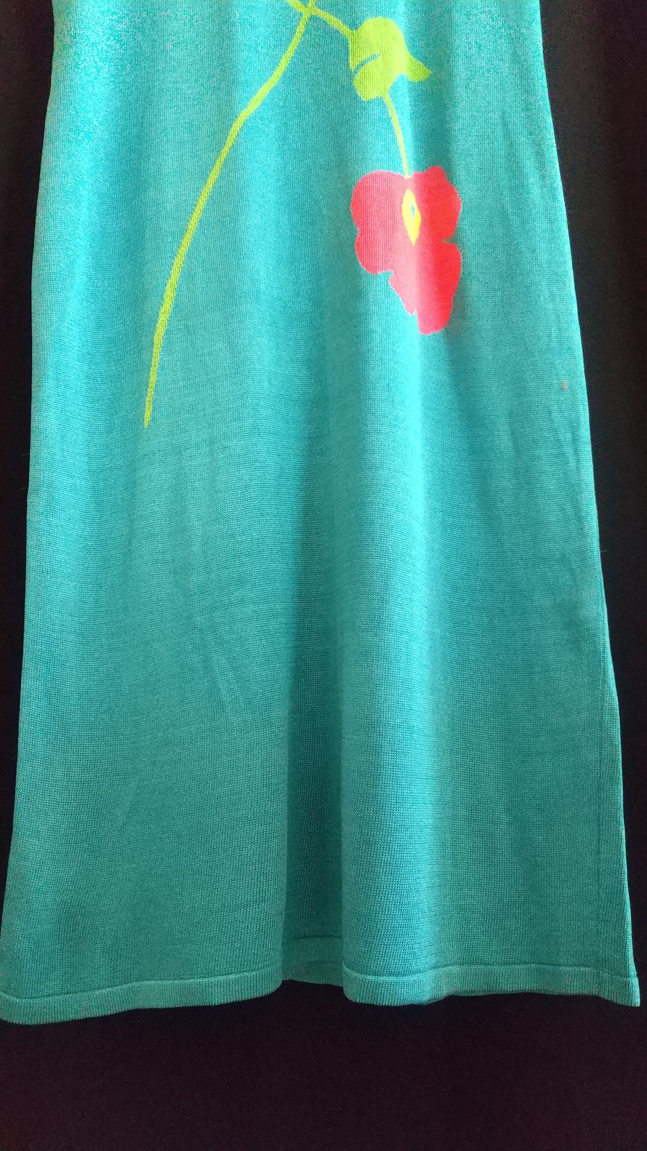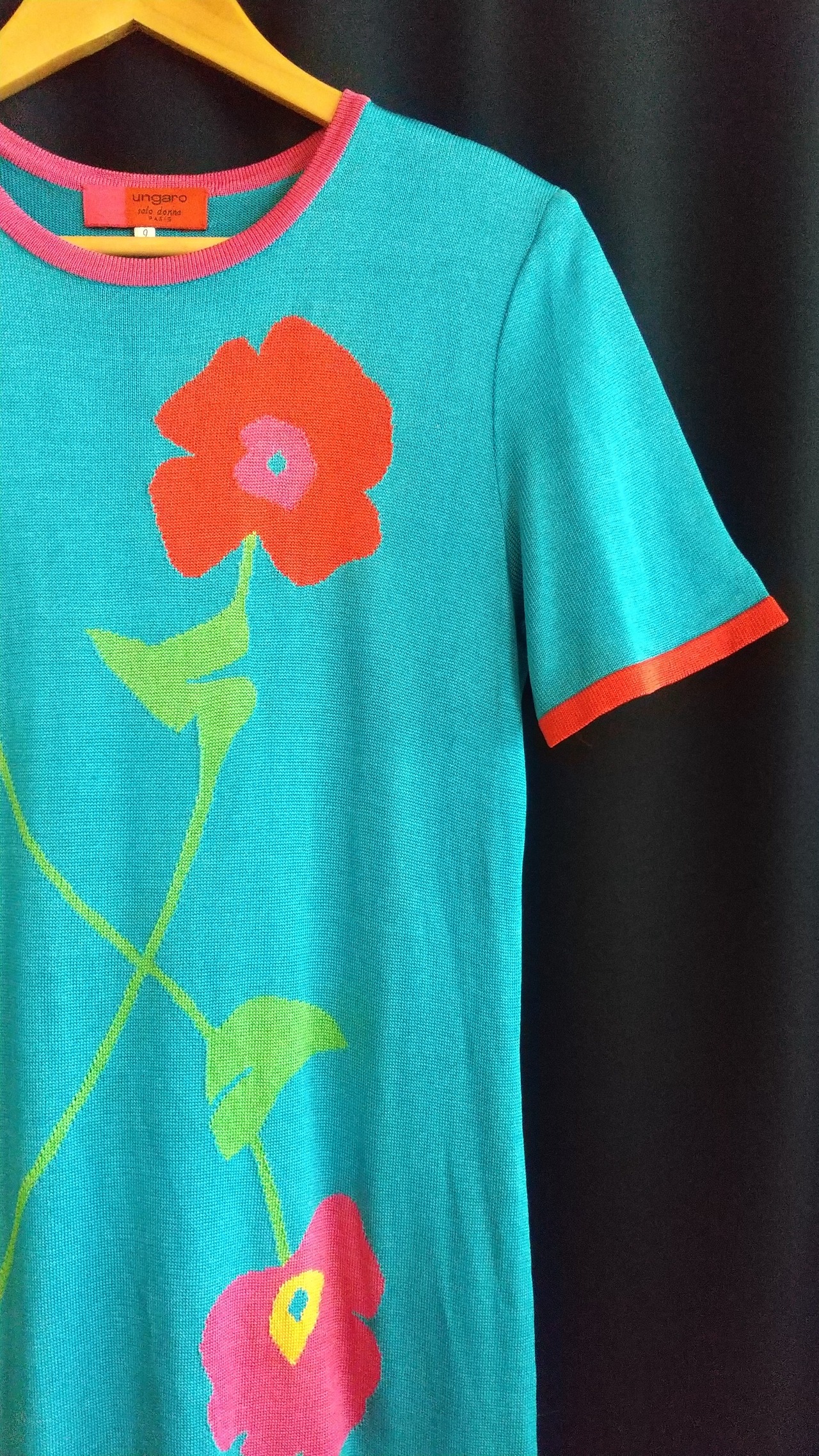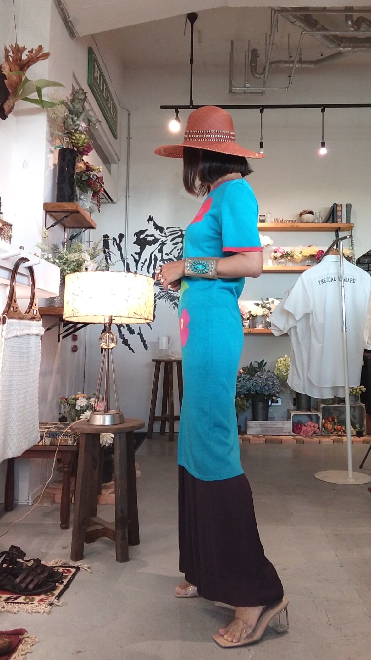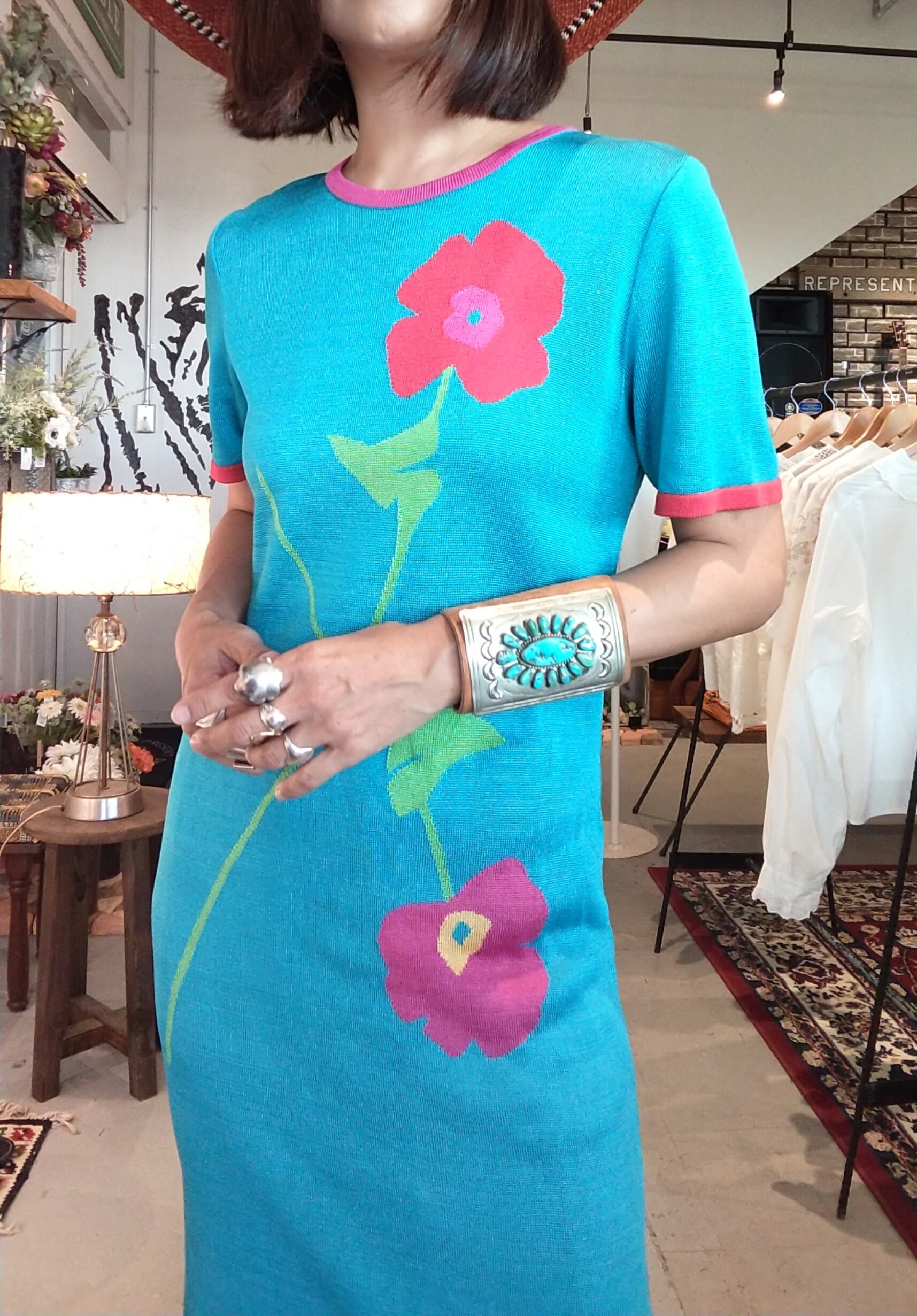 鮮やかなカラーに大きな花柄が目を引くungaroのヴィンテージニットワンピース。素材表記はありませんがツルッと冷感があり伸縮性のあるニット素材です。透け感はありません。体にフィットし細見えするアイテムです。
