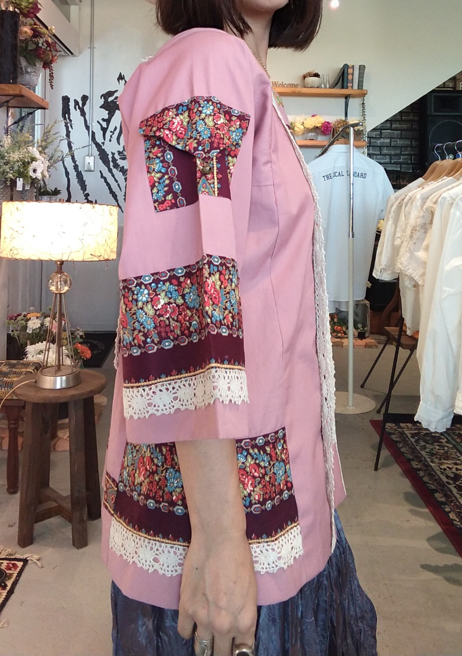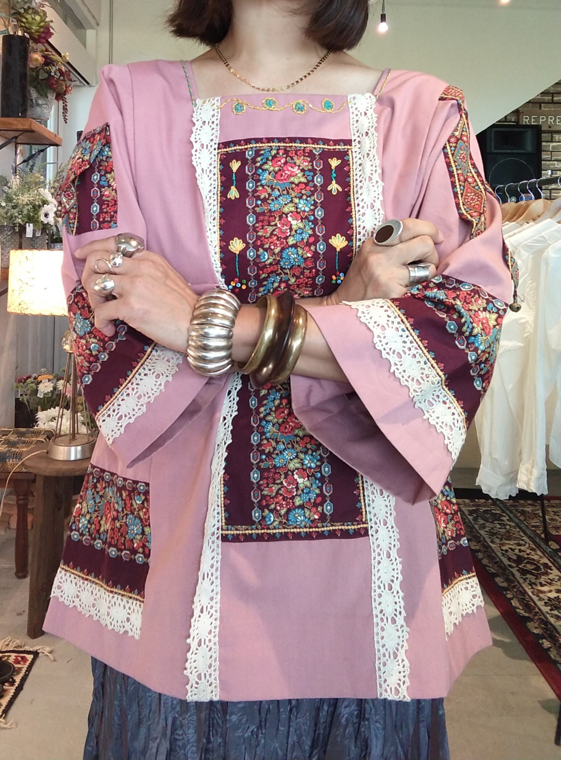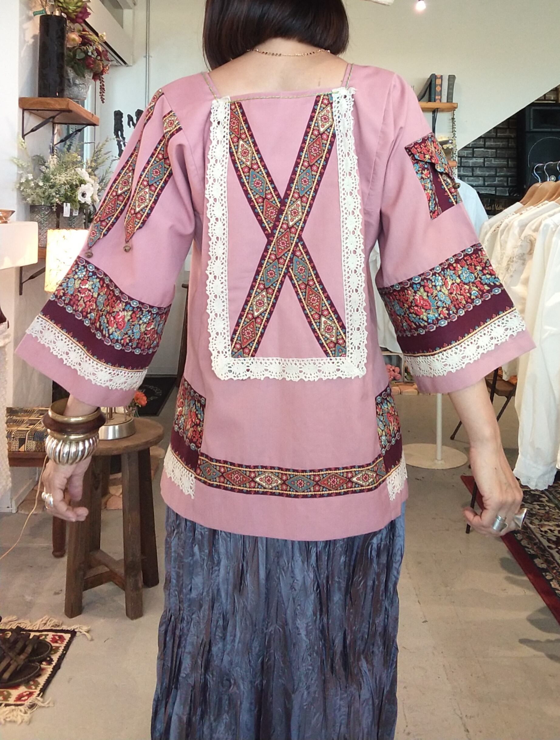 フォークロアムードたっぷりのヴィンテージトップス。素材表記はありませんがコットンとポリエステルの混紡素材のようなさらりとした肌触りです。ハンドメイドのようです。右の袖にはミニポケット、左の袖には鈴、刺繍にパッチワークと、既製品には無い凝ったディテールのスペシャルな1枚。
