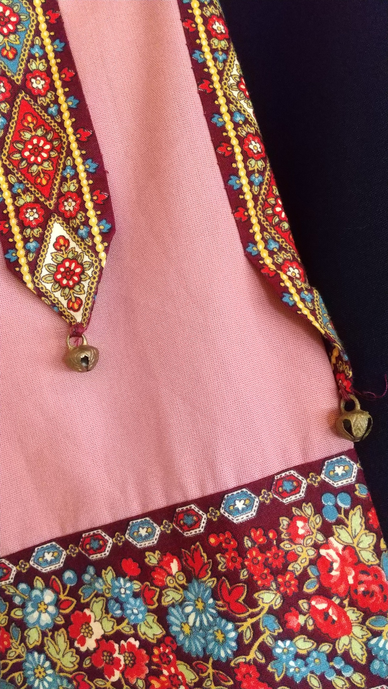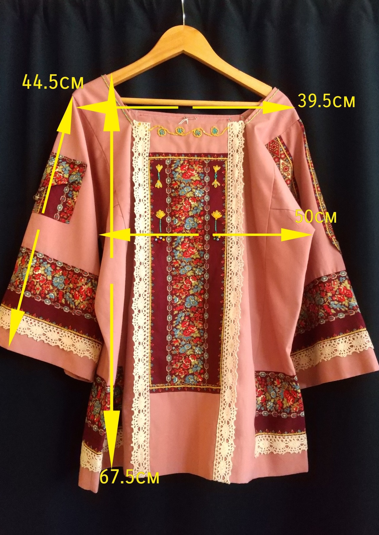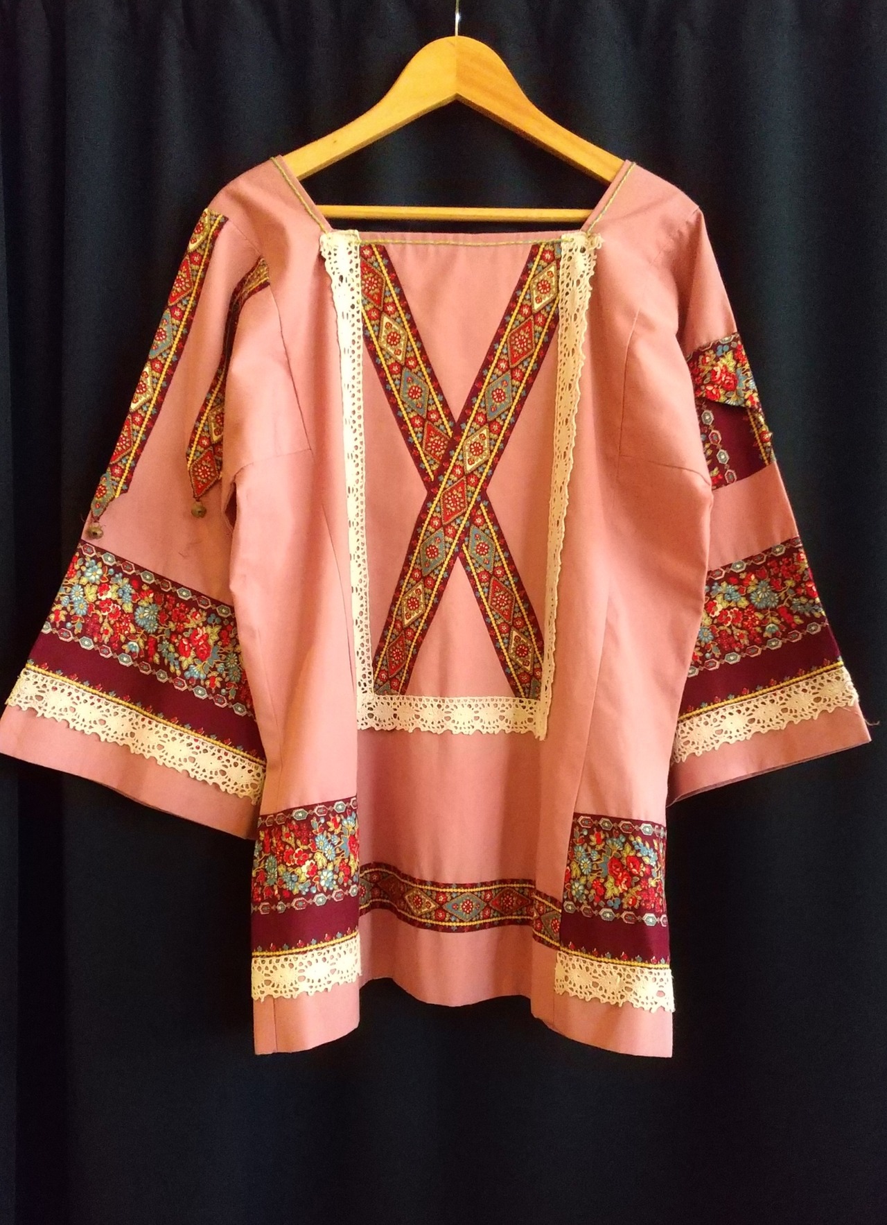 フォークロアムードたっぷりのヴィンテージトップス。素材表記はありませんがコットンとポリエステルの混紡素材のようなさらりとした肌触りです。ハンドメイドのようです。右の袖にはミニポケット、左の袖には鈴、刺繍にパッチワークと、既製品には無い凝ったディテールのスペシャルな1枚。
