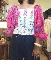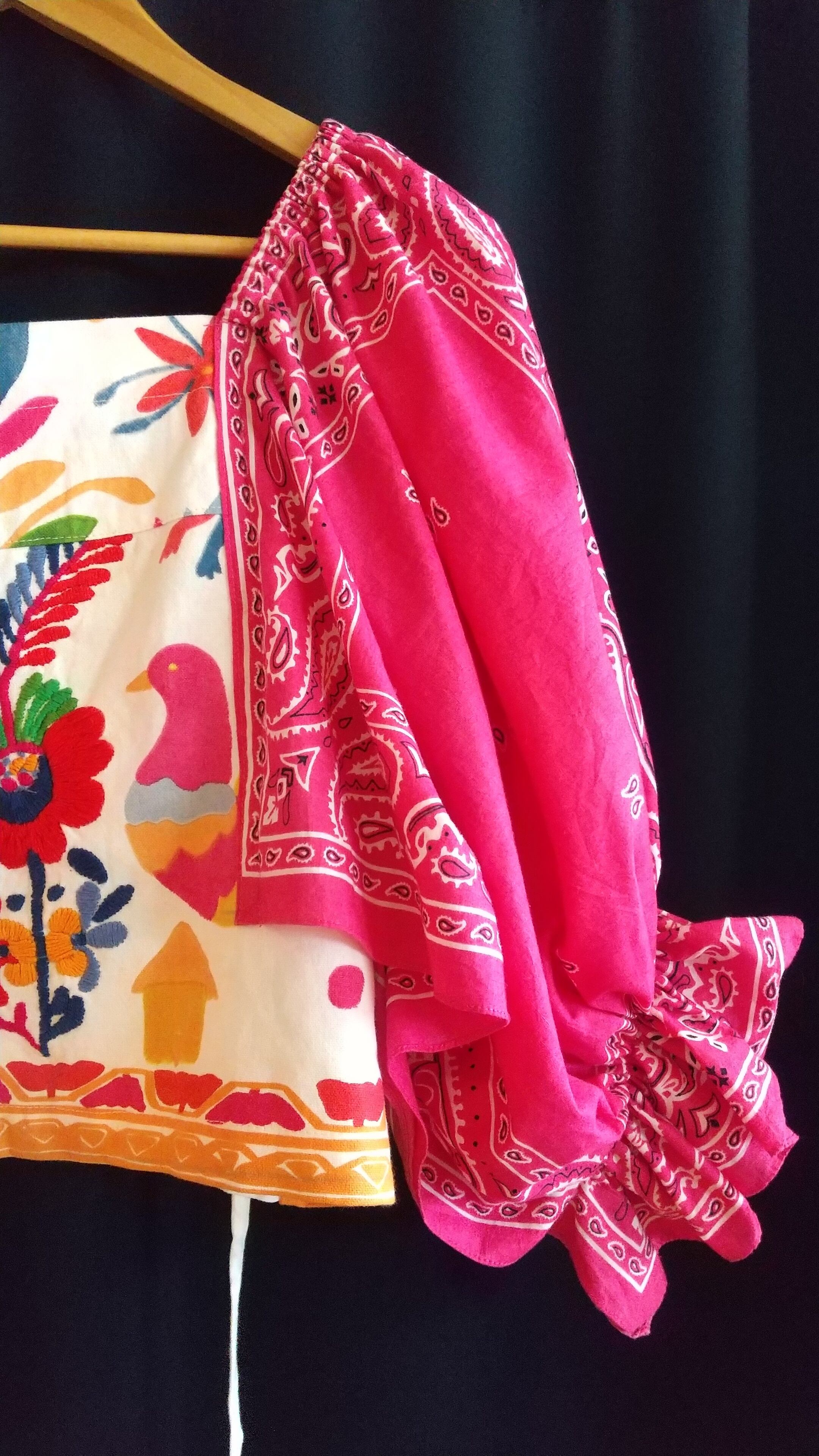 ヴィンテージクロスとバンダナを使用したリメイクトップス。素材はコットンです。プリントの一部が刺繍になります。直線的なデザインで前後どちらでも着用可能な2wayです。クロップト丈のためハイウエストのボトムとの相性抜群です。