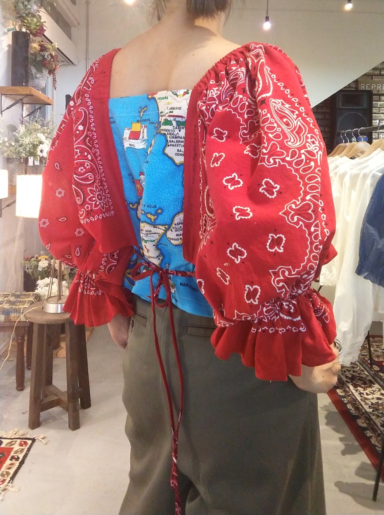 ヴィンテージクロスとバンダナを使用したリメイクトップス。素材はコットンです。前後どちらでも着用可能な2way仕様。クロップト丈のためハイウエストのボトムとの相性抜群です。