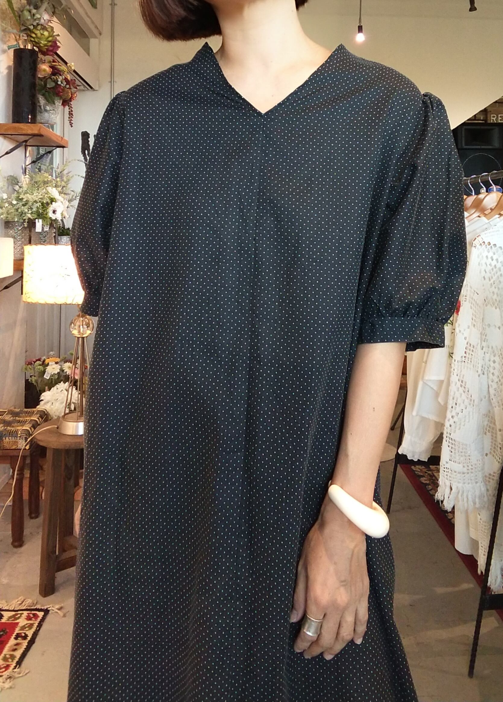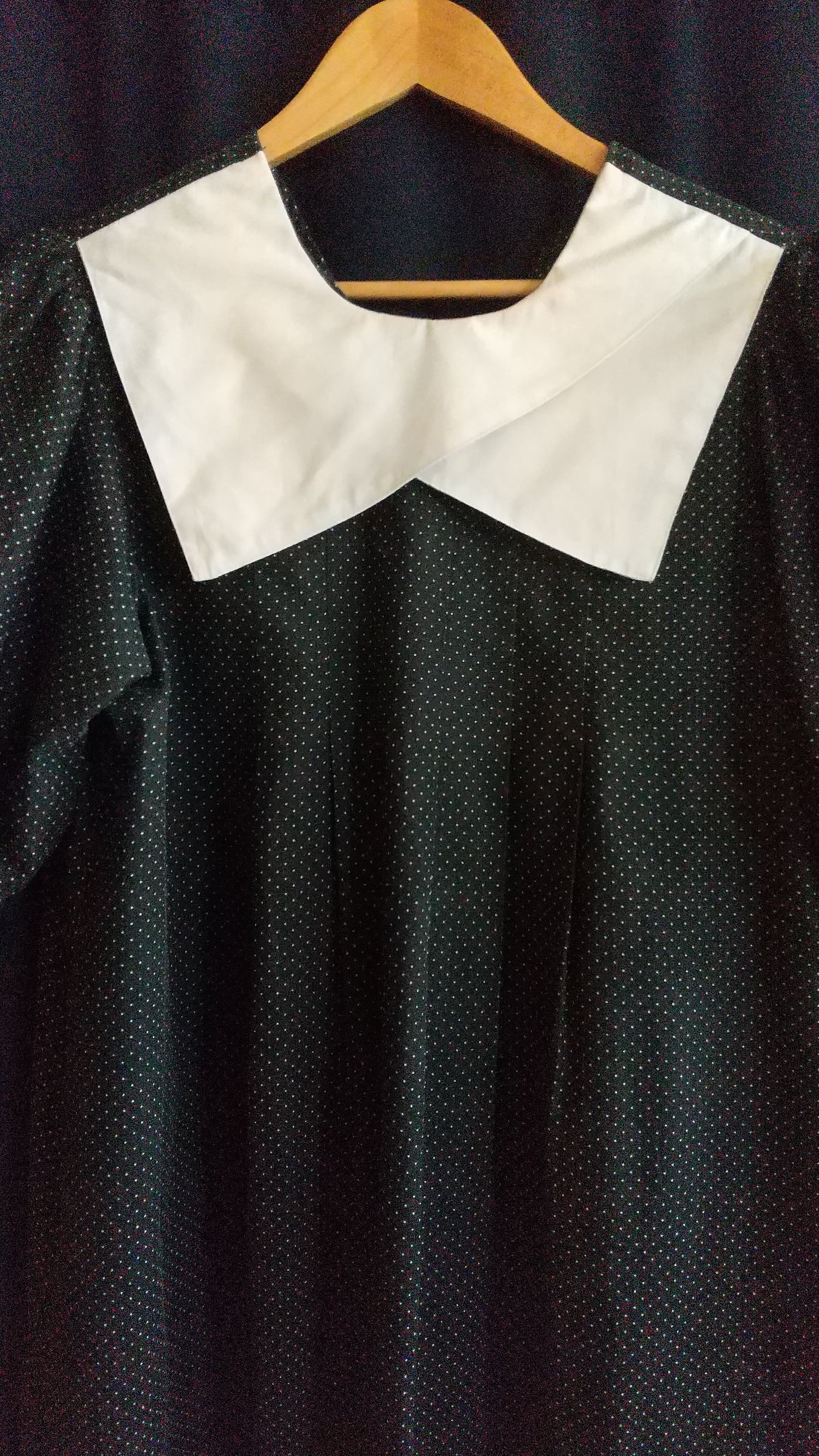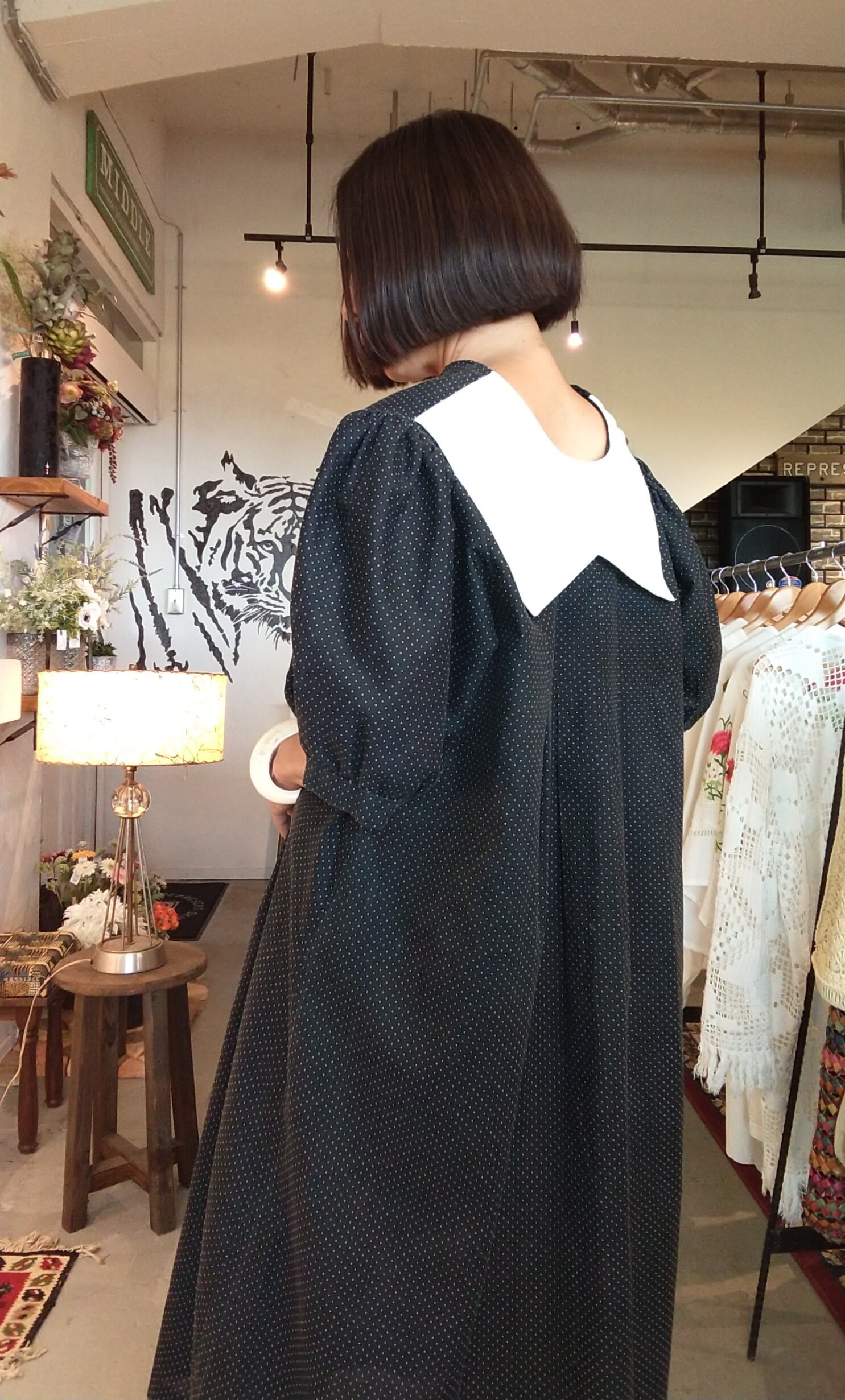 大きな白い襟が可愛らしいヴィンテージワンピース。素材表記はありませんが張りのあるコットンのようです。裏地は付いておらず、透け感はありません。前後どちらでも着られる2wayです。体のラインを拾わないふんわりしたデザイン。秋冬はタートルニットをインナーに着たり、ボトムにパンツをレイヤードしても素敵です。