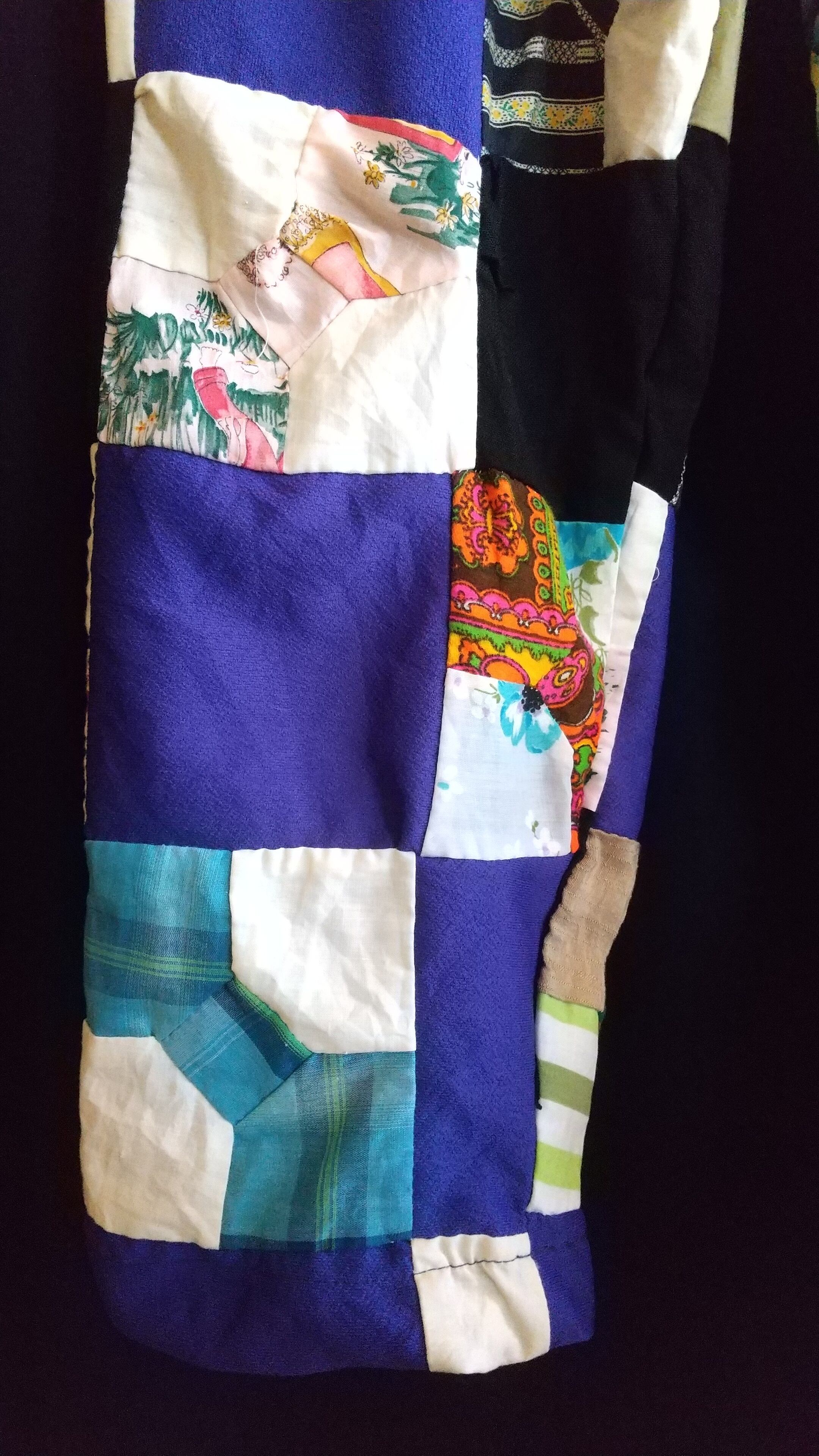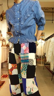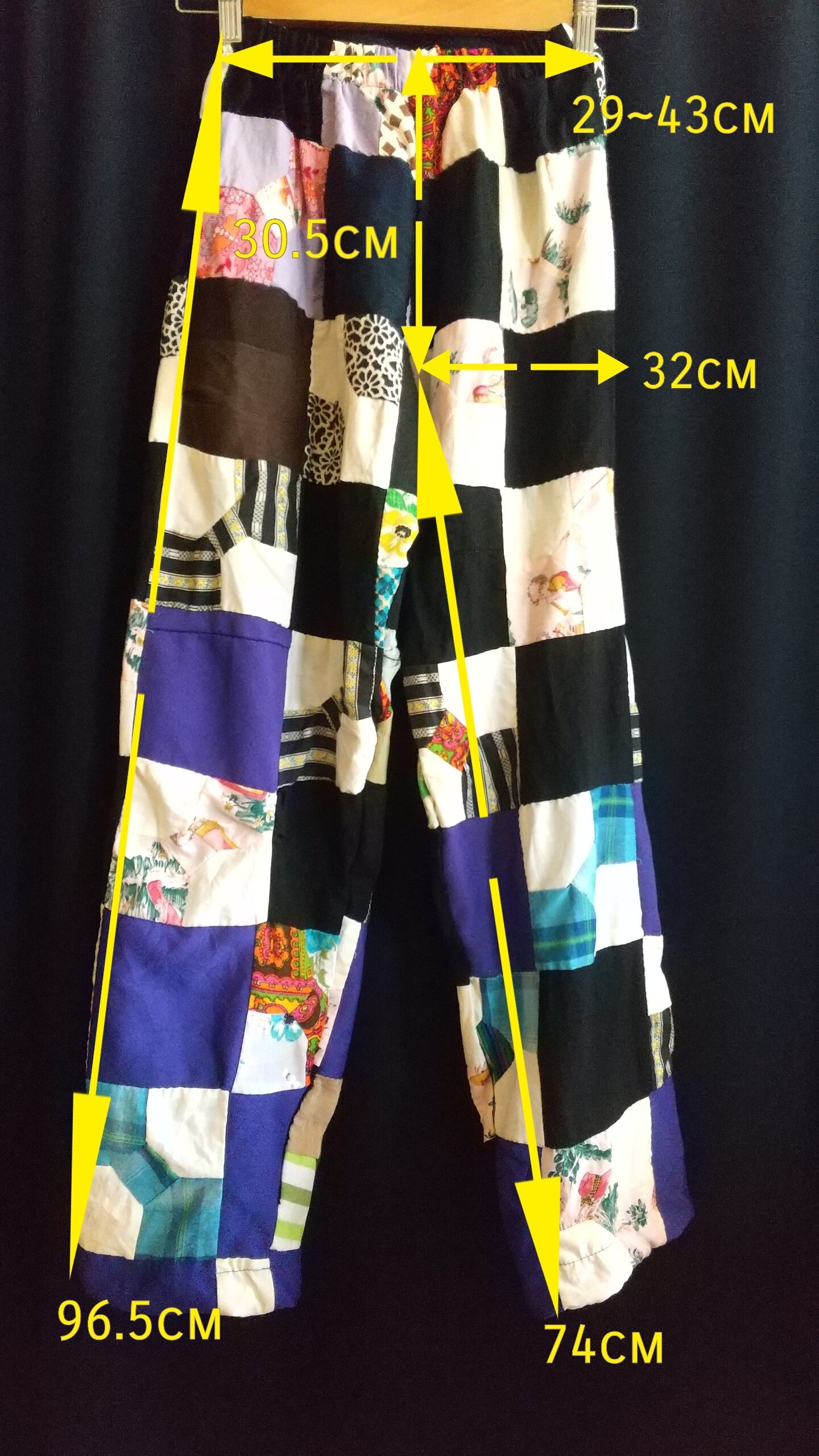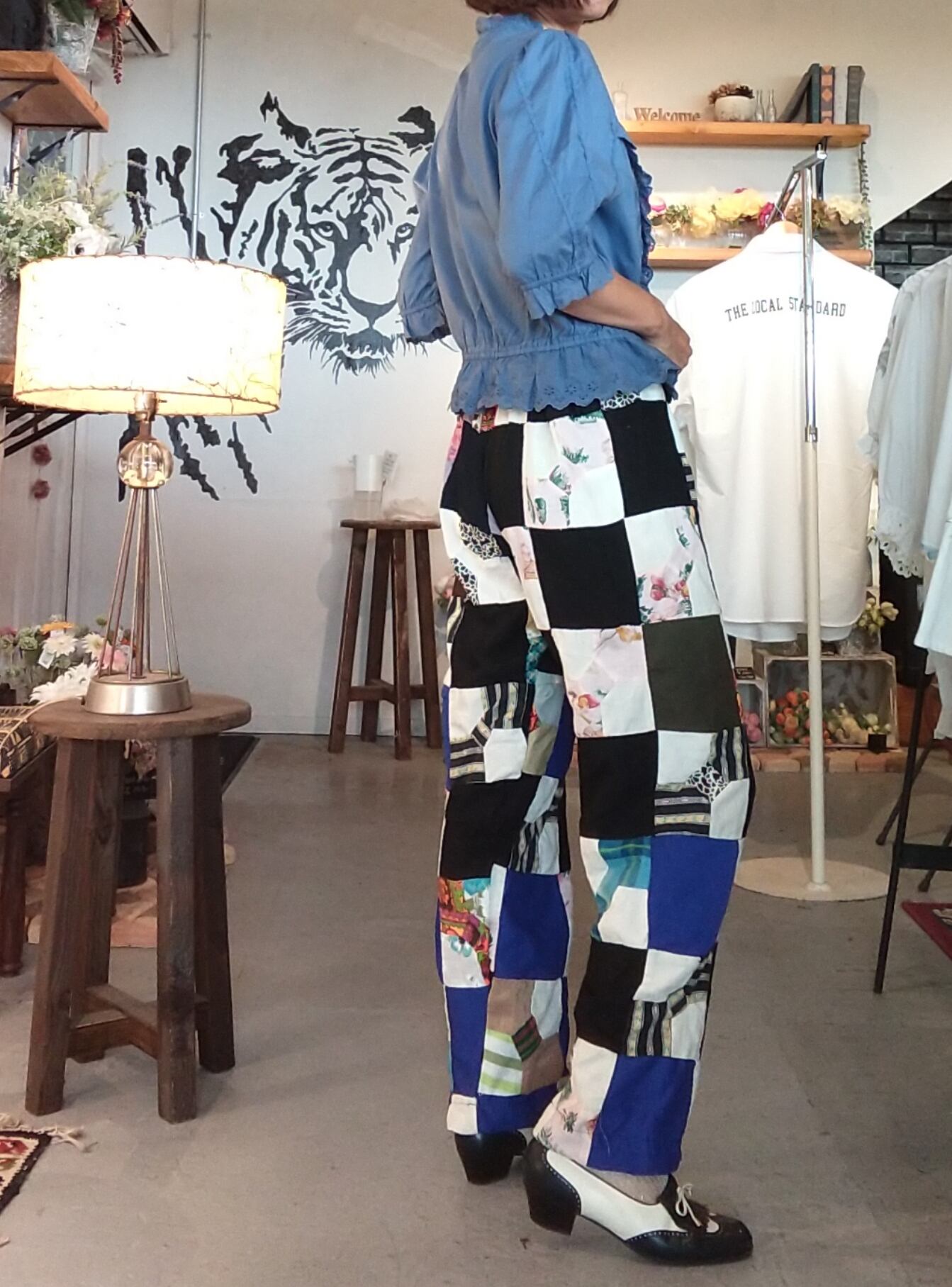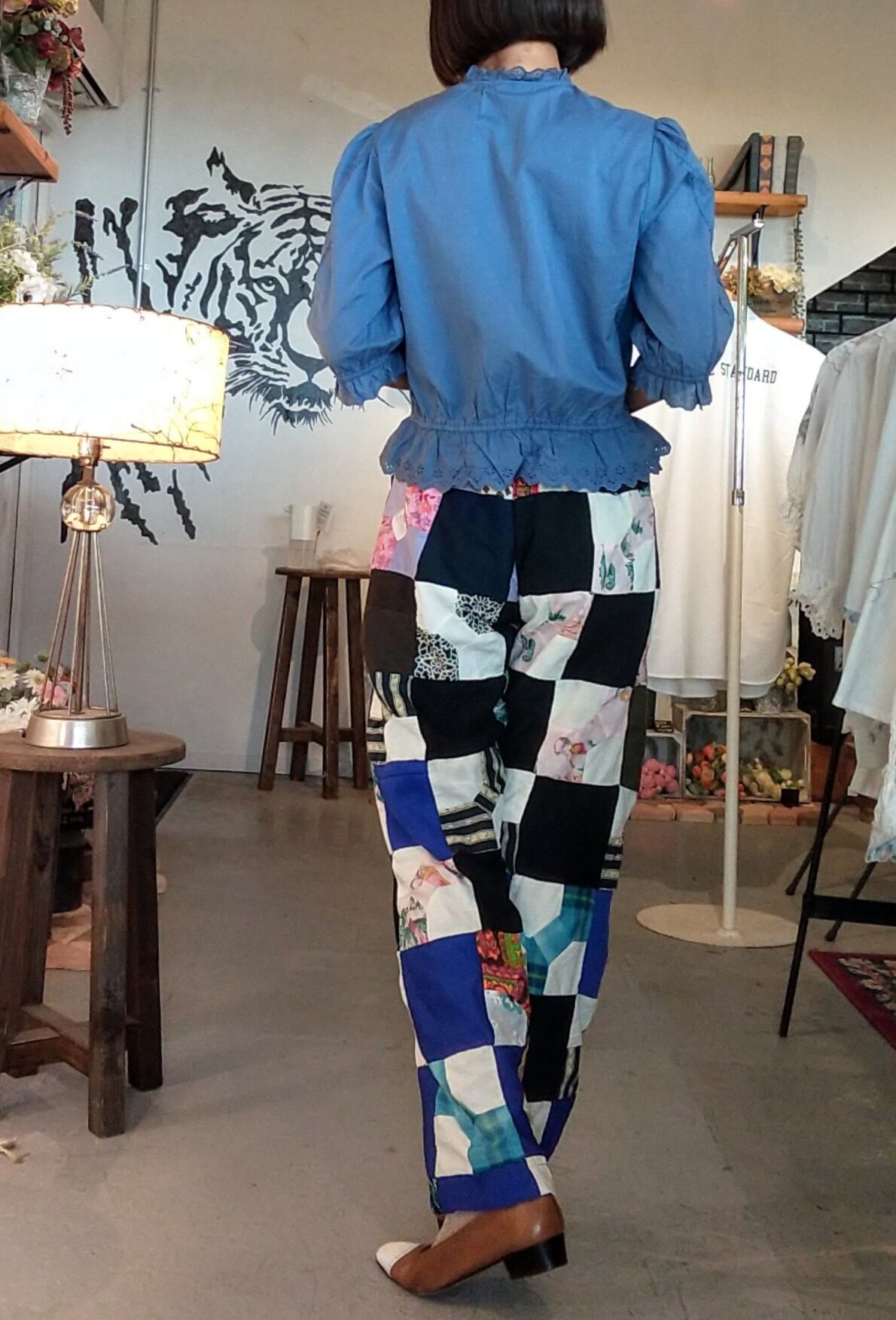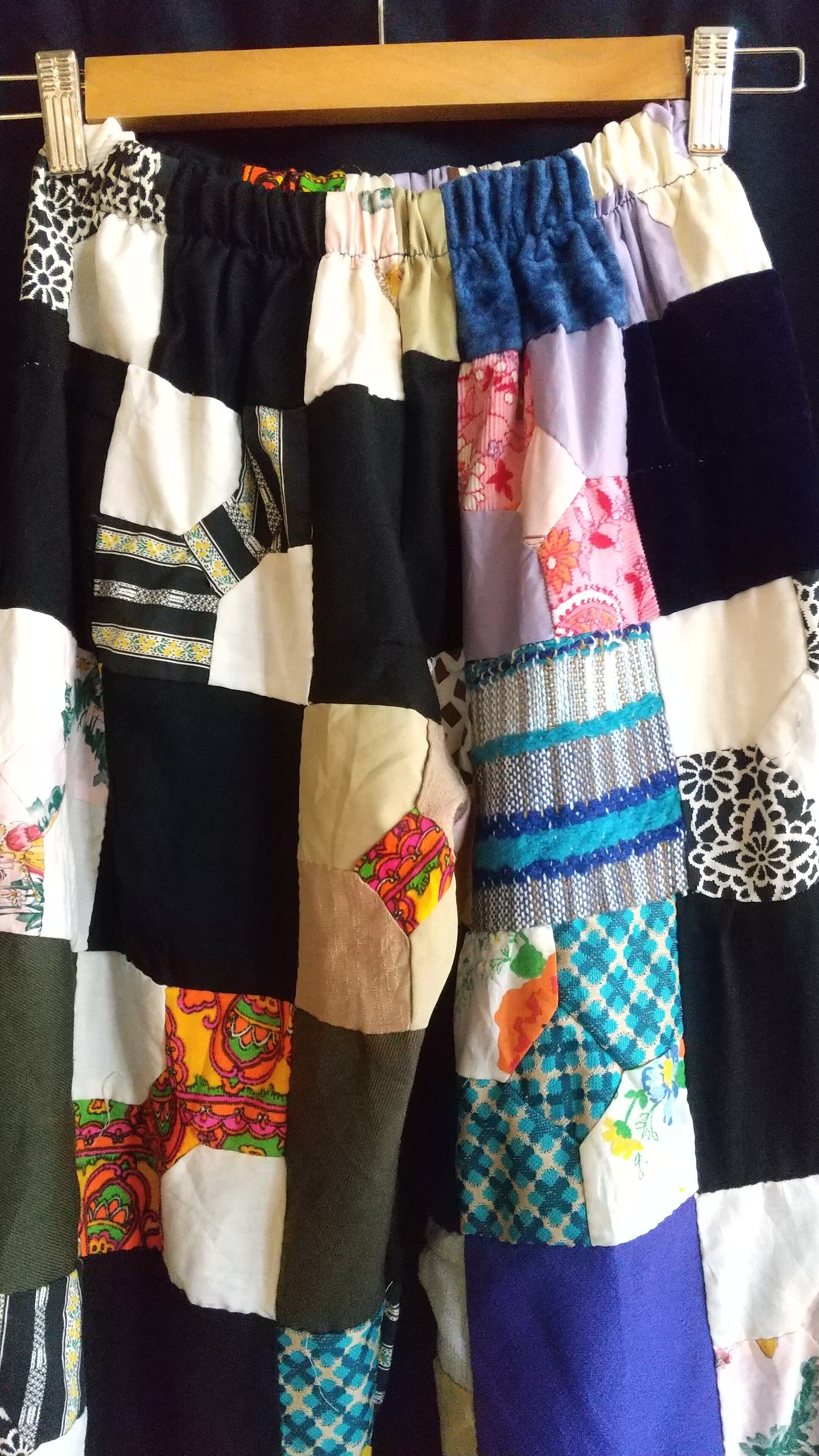 ヴィンテージのパッチワークパンツ。色々な素材と柄の細かい布片をハンドパッチワークによりパンツに仕立てた1枚です。裏地はありません。ウエストゴム仕様。ハンドメイドのため縫い目の緩い部分がありますが着用に支障の無い程度です。ヴィンテージ、ハンドメイドの味わいとしてご理解いただける方へおすすめいたします。
