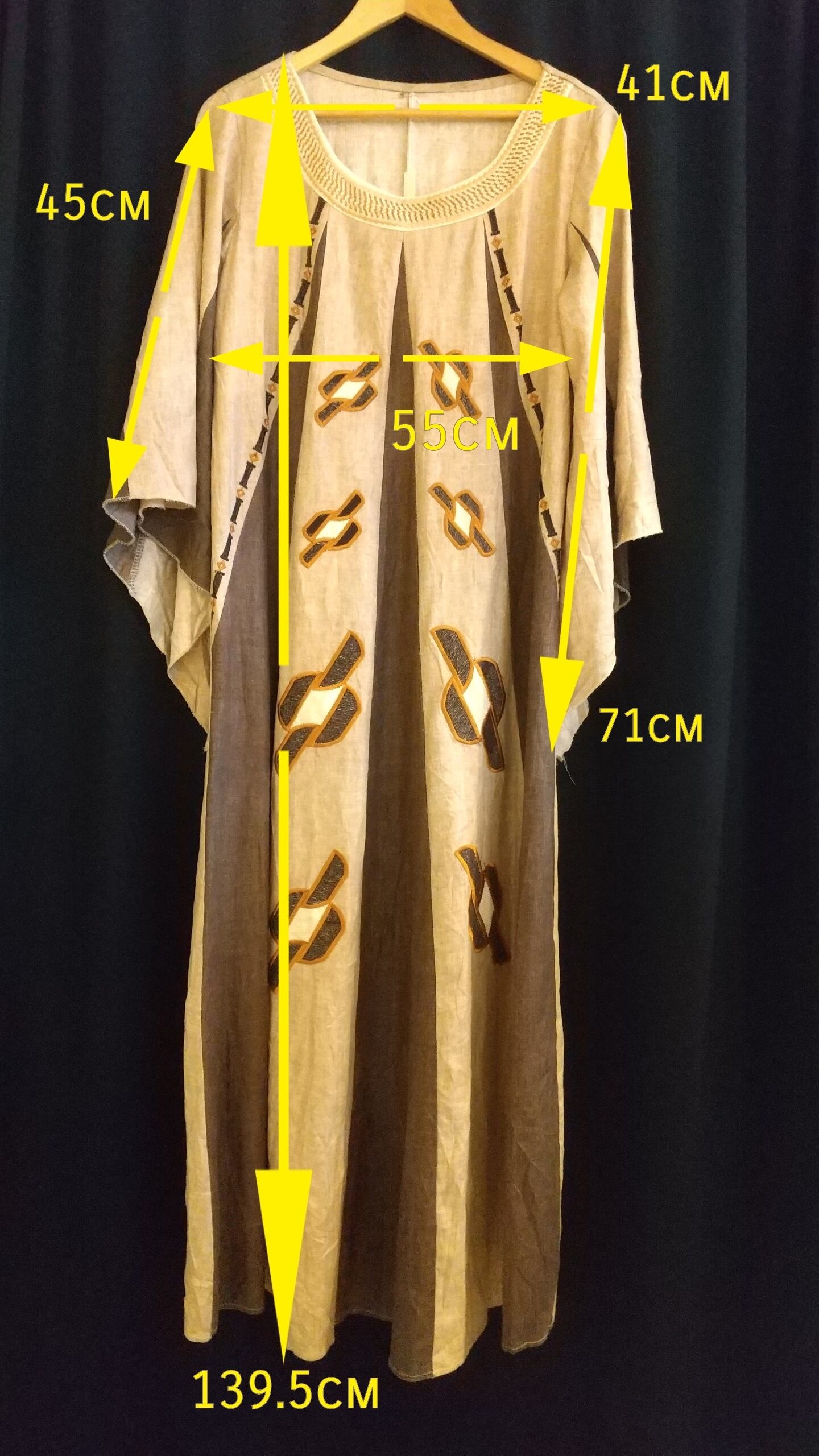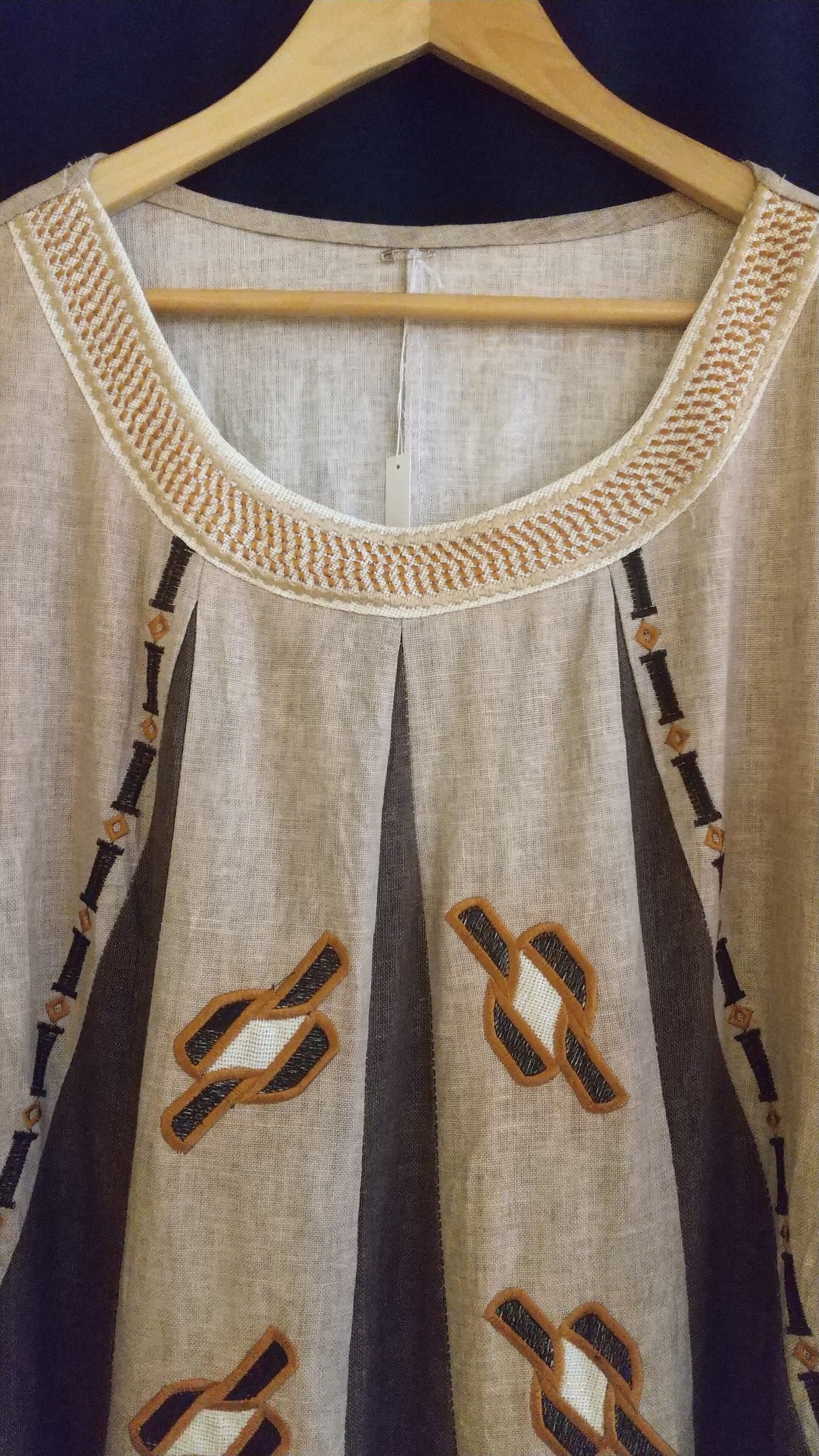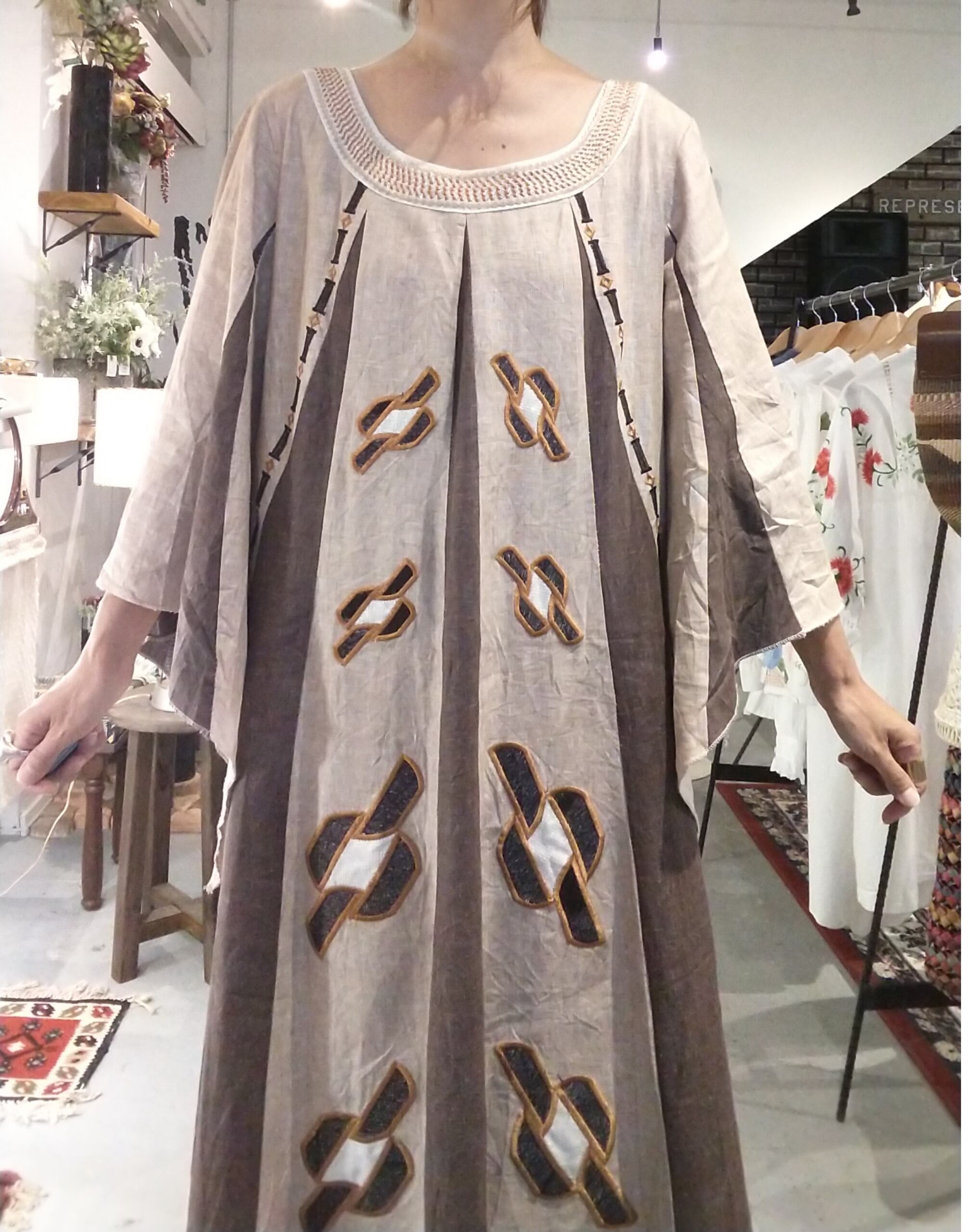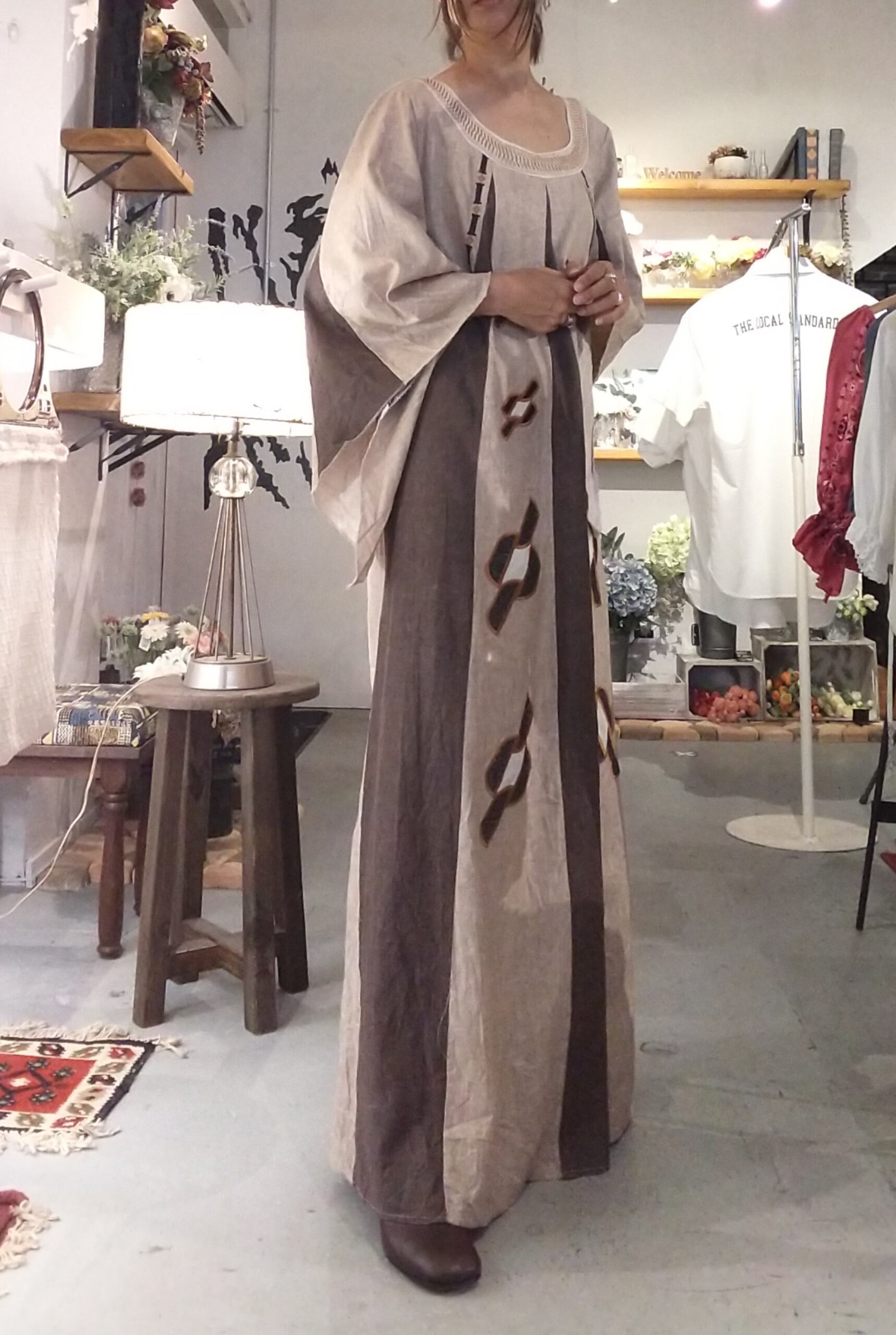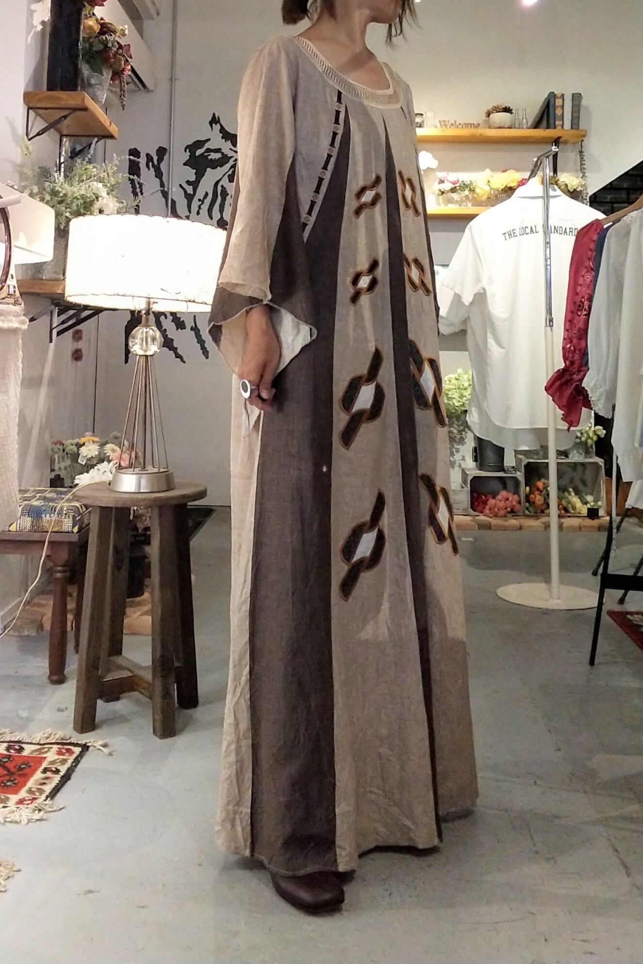 ディテールが素敵なヴィンテージマキシドレス。素材表記はありませんが上質なリネンのようです。落ち感がありシャリッとした肌触りです。エスニックムード溢れる刺繍やフレアスリーブデザイン、落ち着いた色味にたっぷりの丈感。大人にぴったりのヴィンテージドレスです。