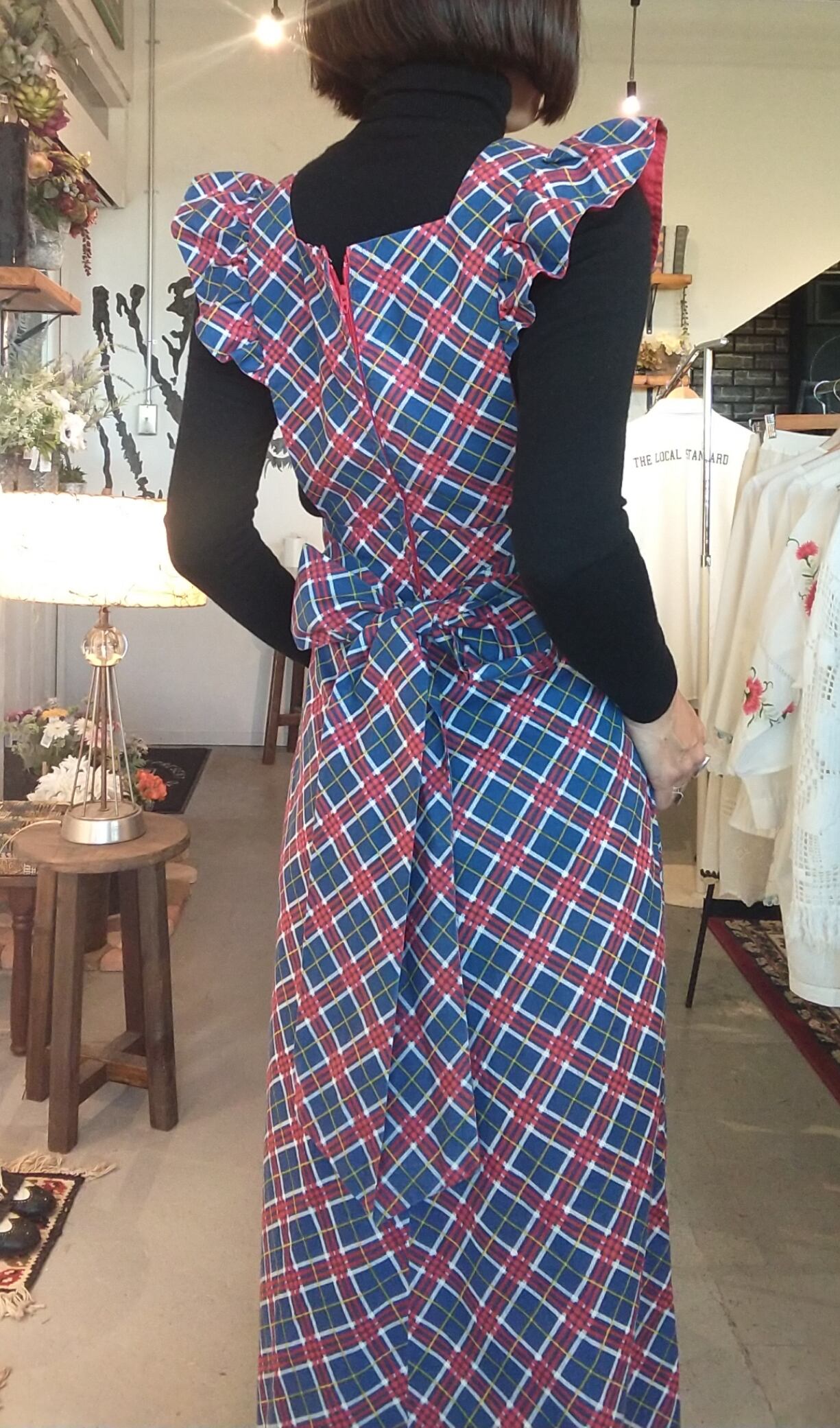 デザインと色合いが可愛いヴィンテージのエプロンマキドレス。ノスタルジックな雰囲気でありながらも美しいAラインとたっぷりのマキシ丈が子供っぽくならない絶妙なバランスの一着です。