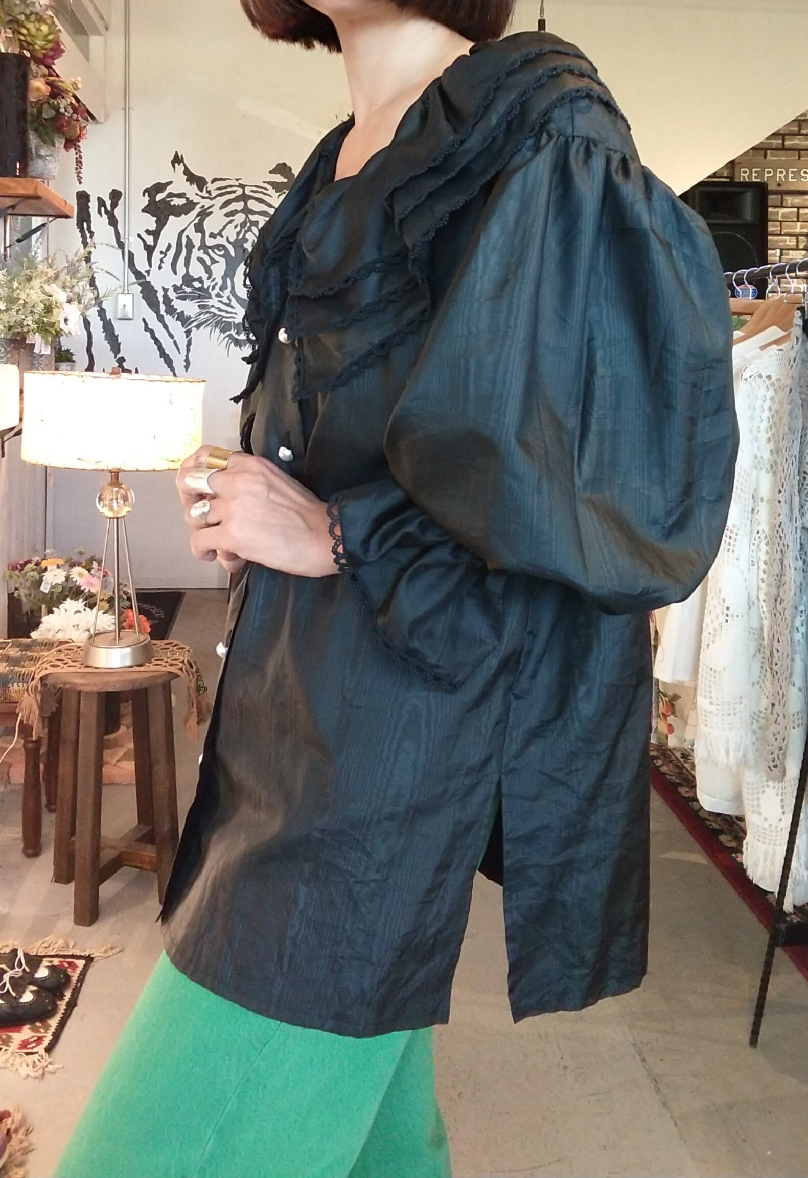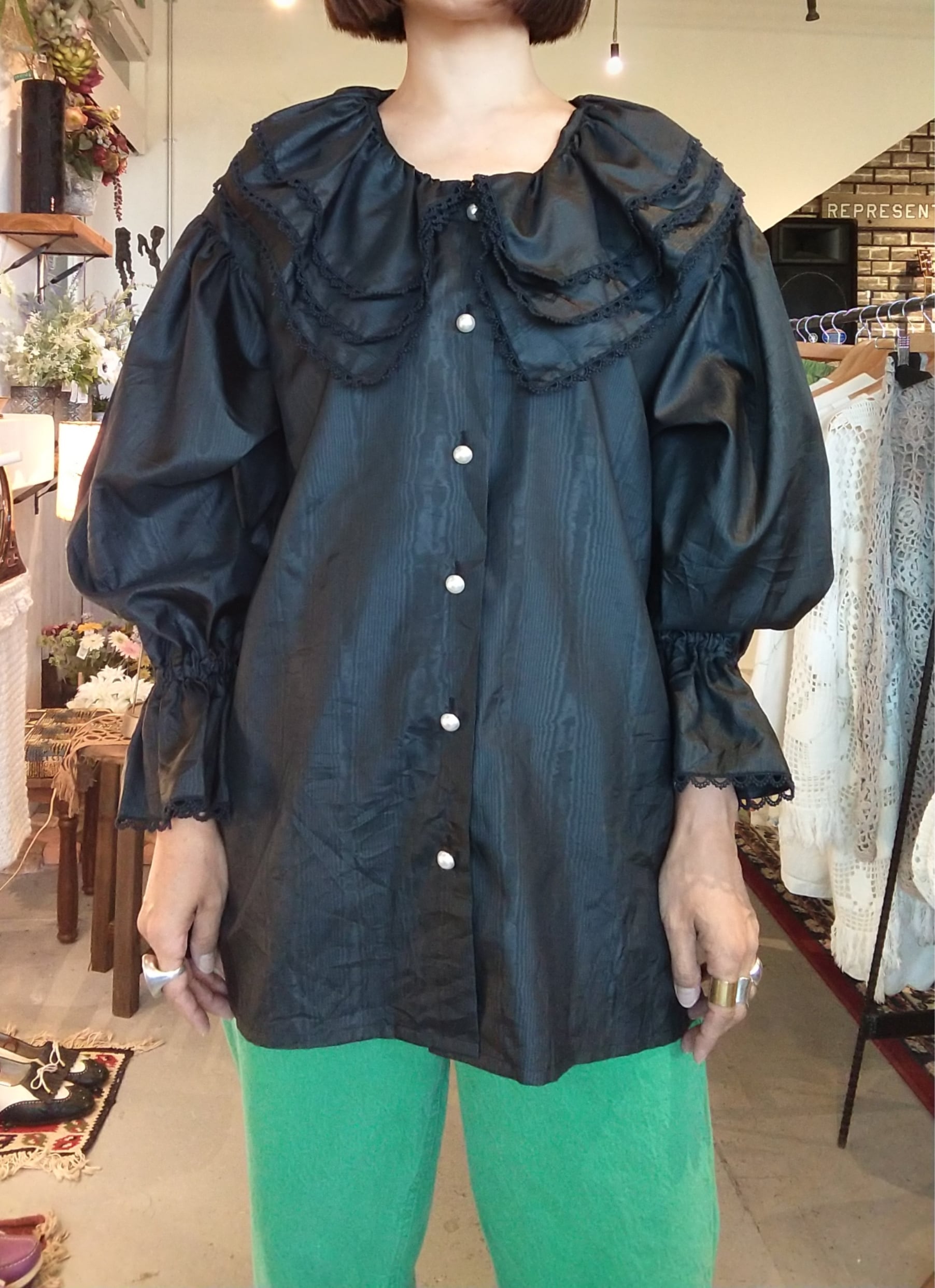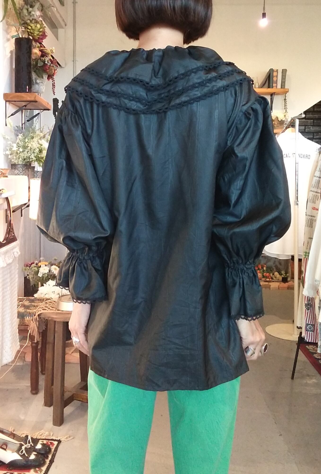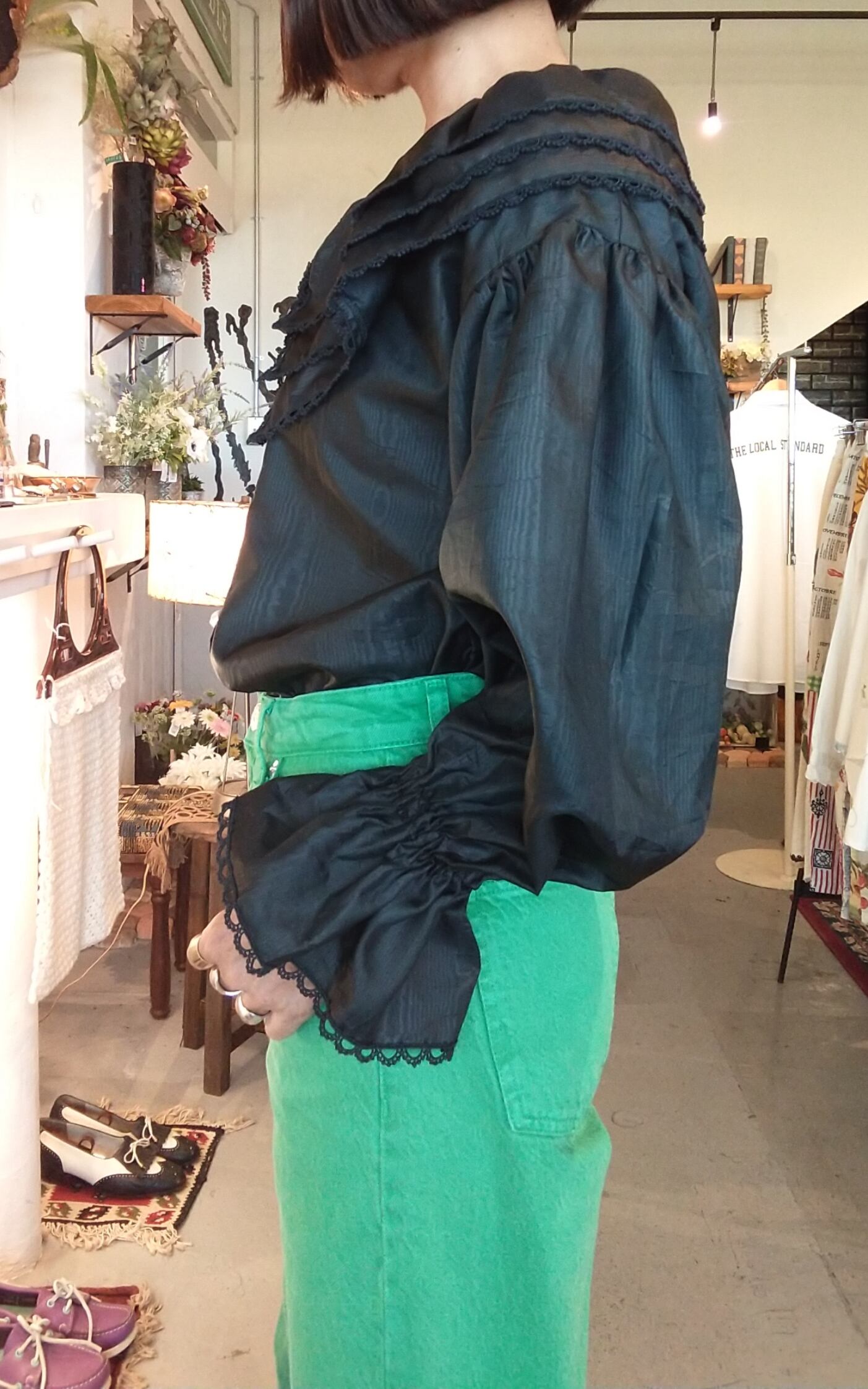 たっぷりのボリューム感が魅力のヴィンテージブラウス。素材表記はありませんがポリエステルのようです。シャリ感があります。透け感はありません。ブラック単色ながら主役級の存在感のあるブラウスです。ボリュームがあるためボトムはすっきりシンプルなシルエットのパンツやスカートを合わせるのがおすすめです。