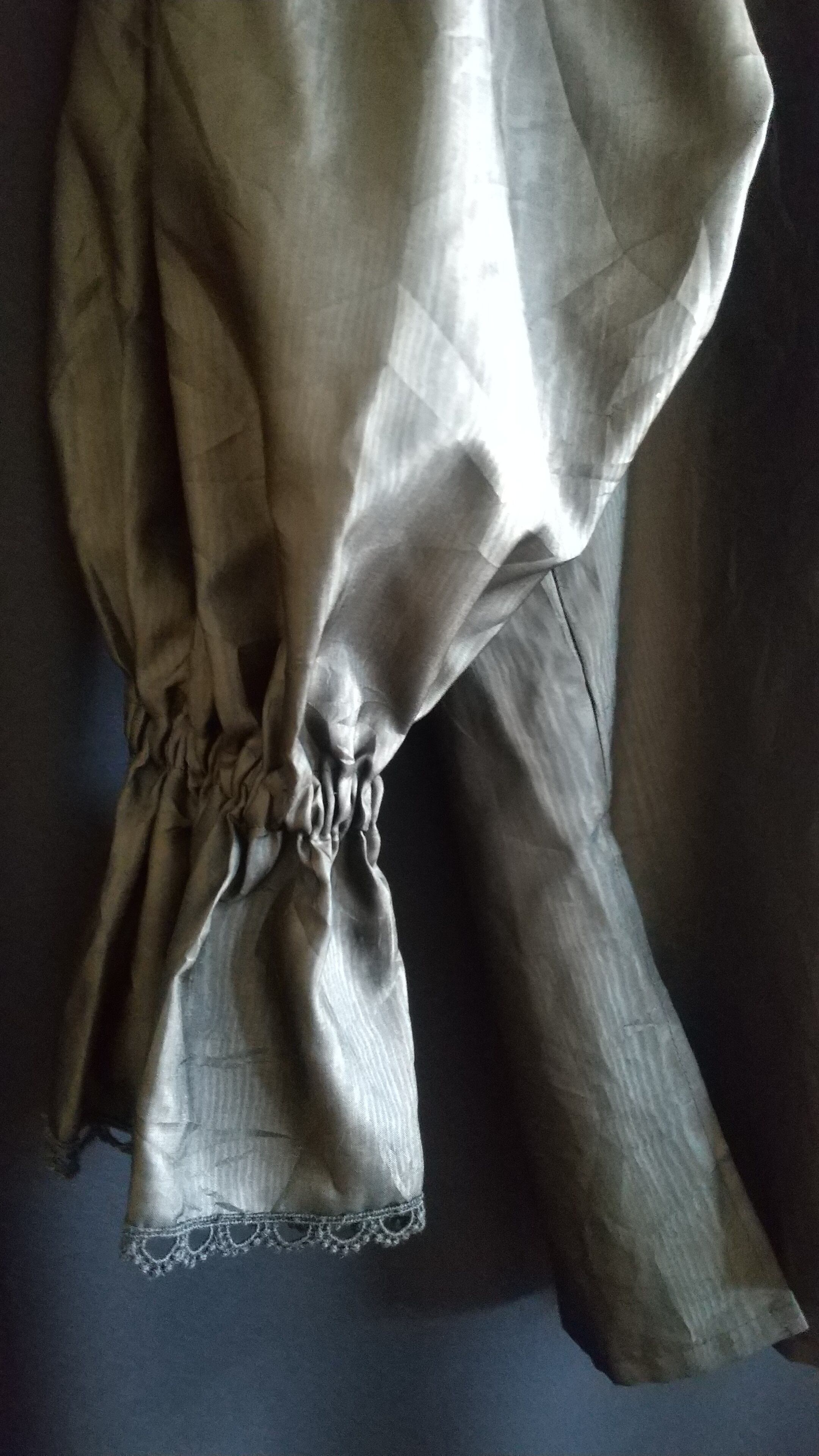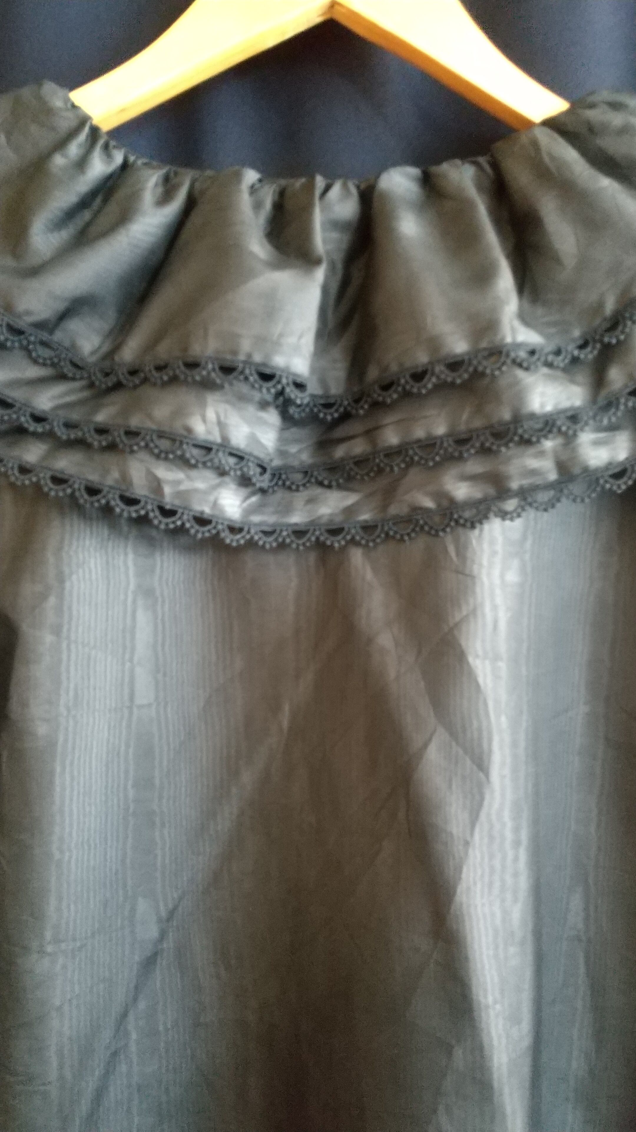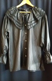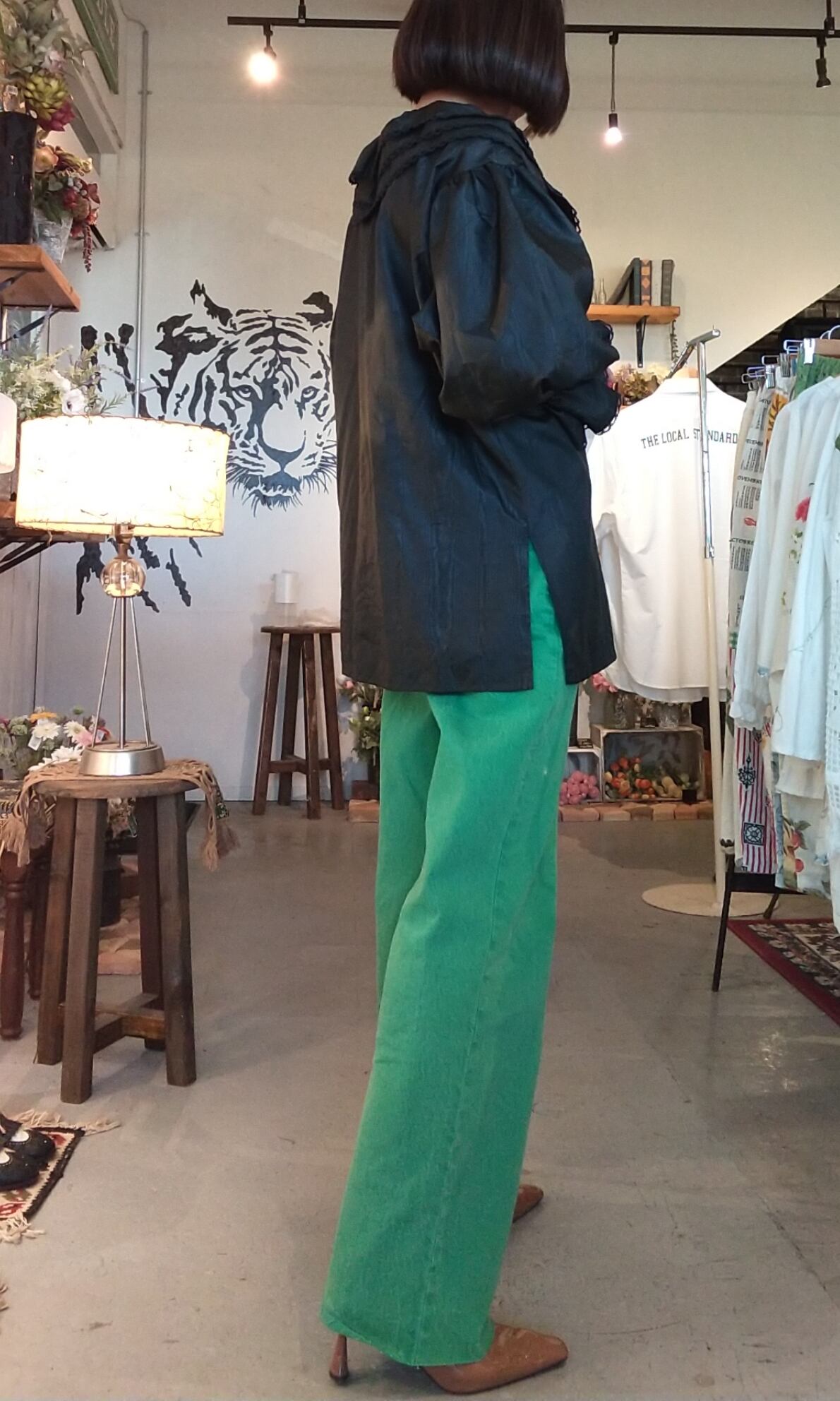たっぷりのボリューム感が魅力のヴィンテージブラウス。素材表記はありませんがポリエステルのようです。シャリ感があります。透け感はありません。ブラック単色ながら主役級の存在感のあるブラウスです。ボリュームがあるためボトムはすっきりシンプルなシルエットのパンツやスカートを合わせるのがおすすめです。