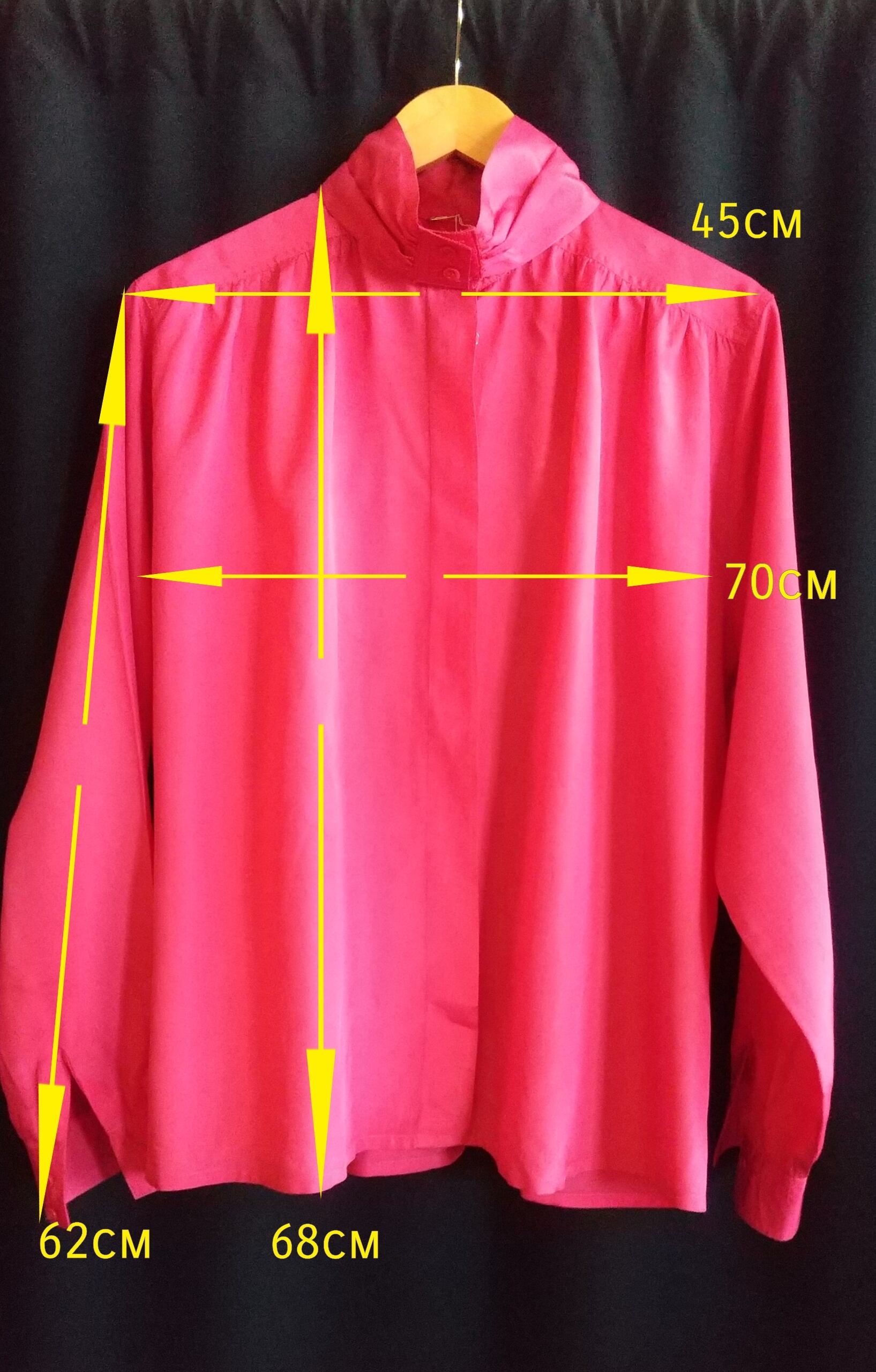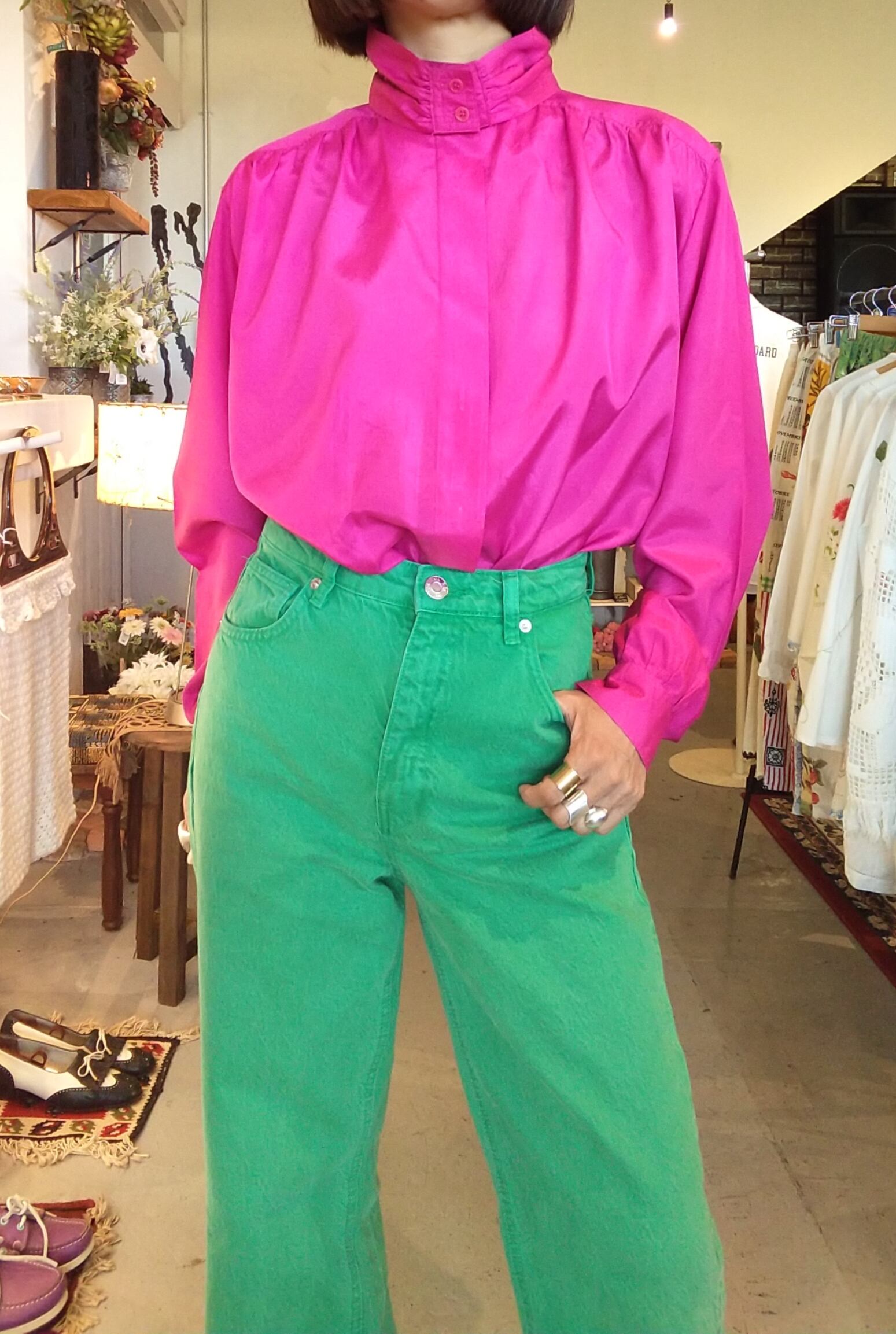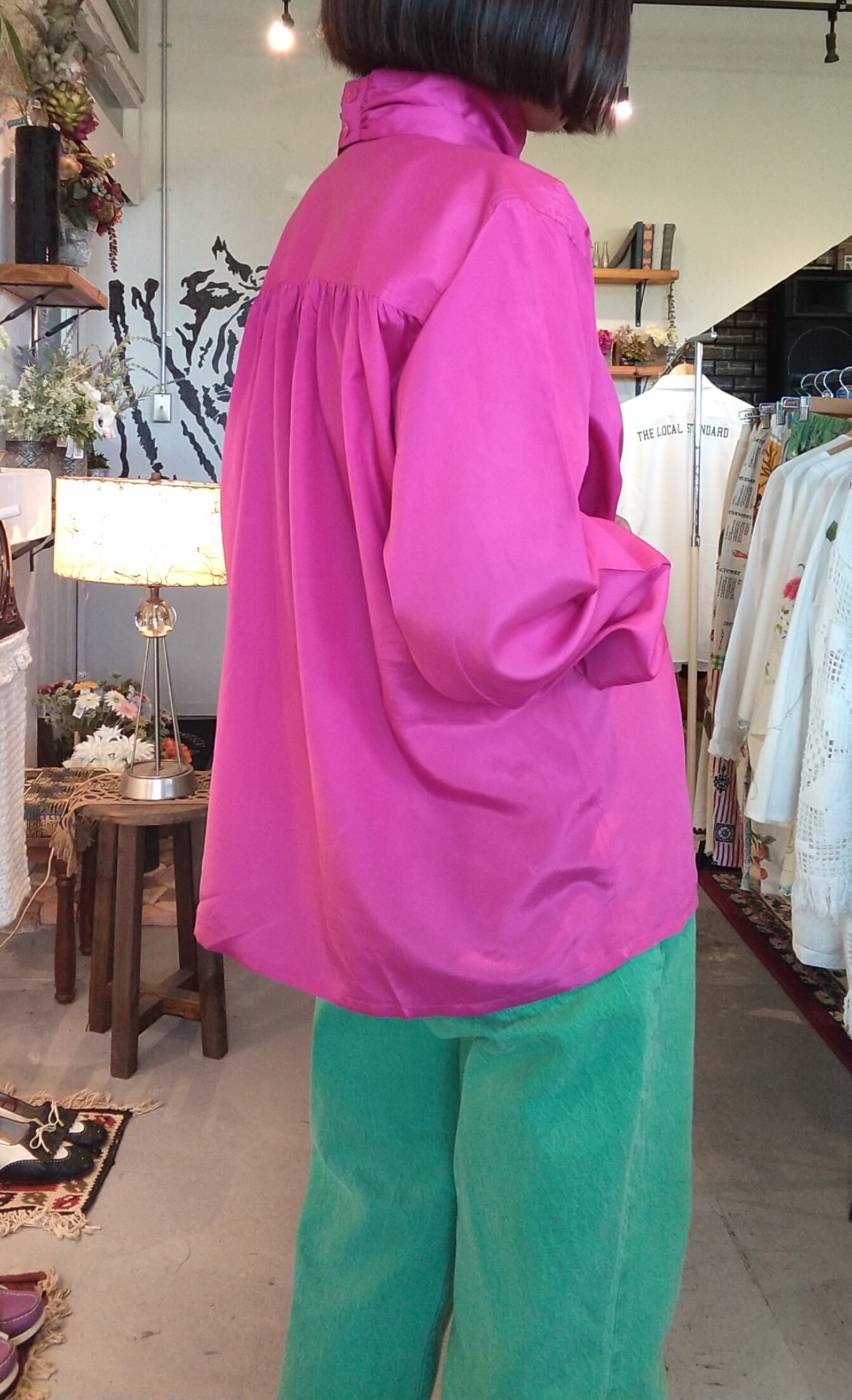 フュシャピンクが目を引くヴィンテージブラウス。素材表記はありませんがポリエステルのようです。伸縮性、透け感はありません。ハイネック部分は取り外し可能な飾りパーツになっていてとてもユニークなデザイン。ジャケットやニットの中に首元を見せて着ると素敵です。暗くなりがちな冬の装いの差し色にぴったりです。