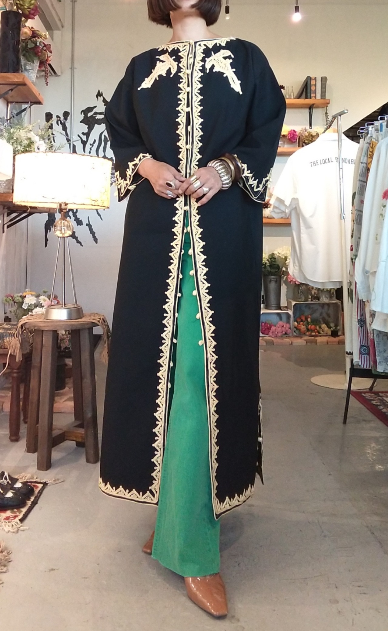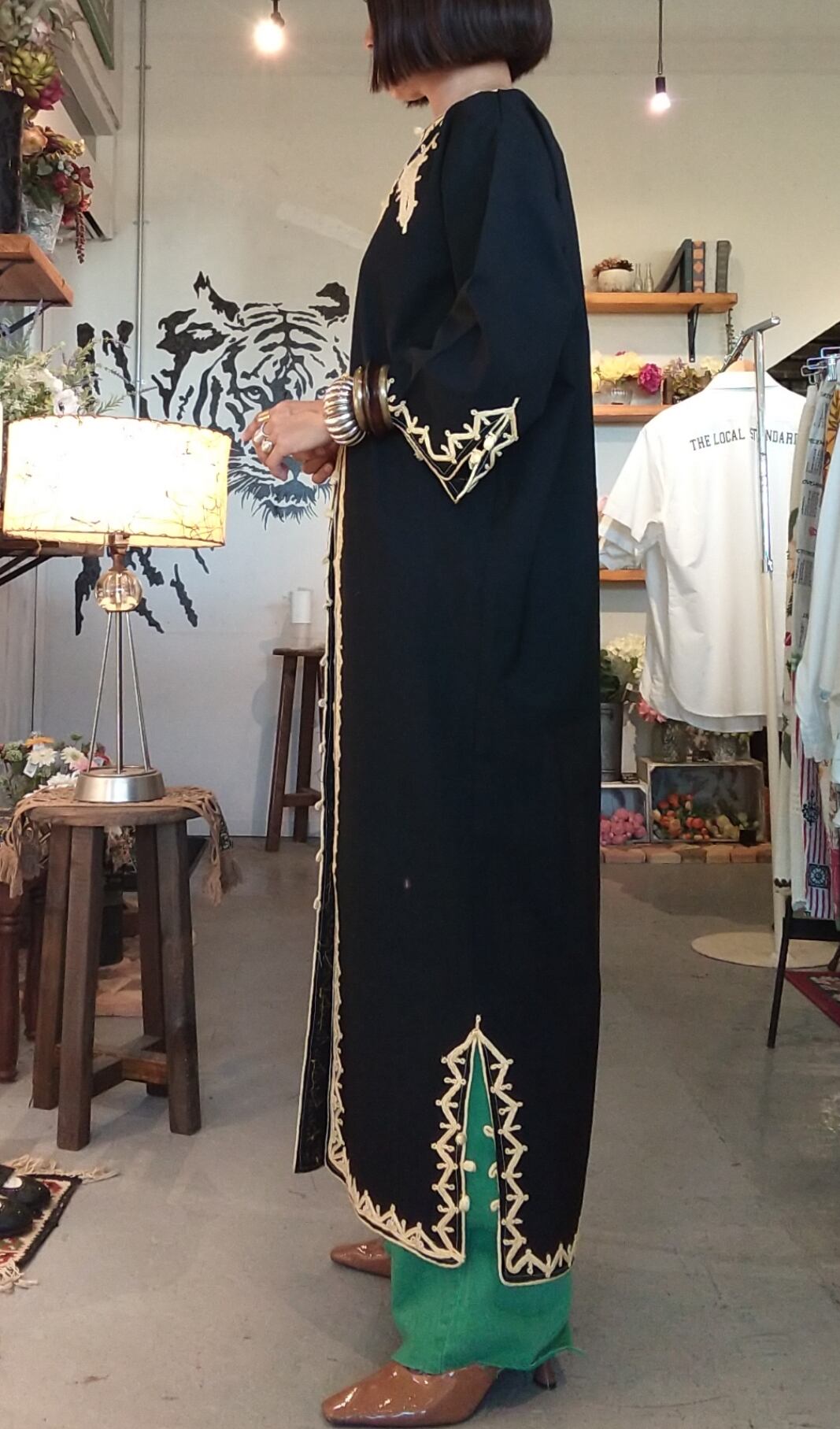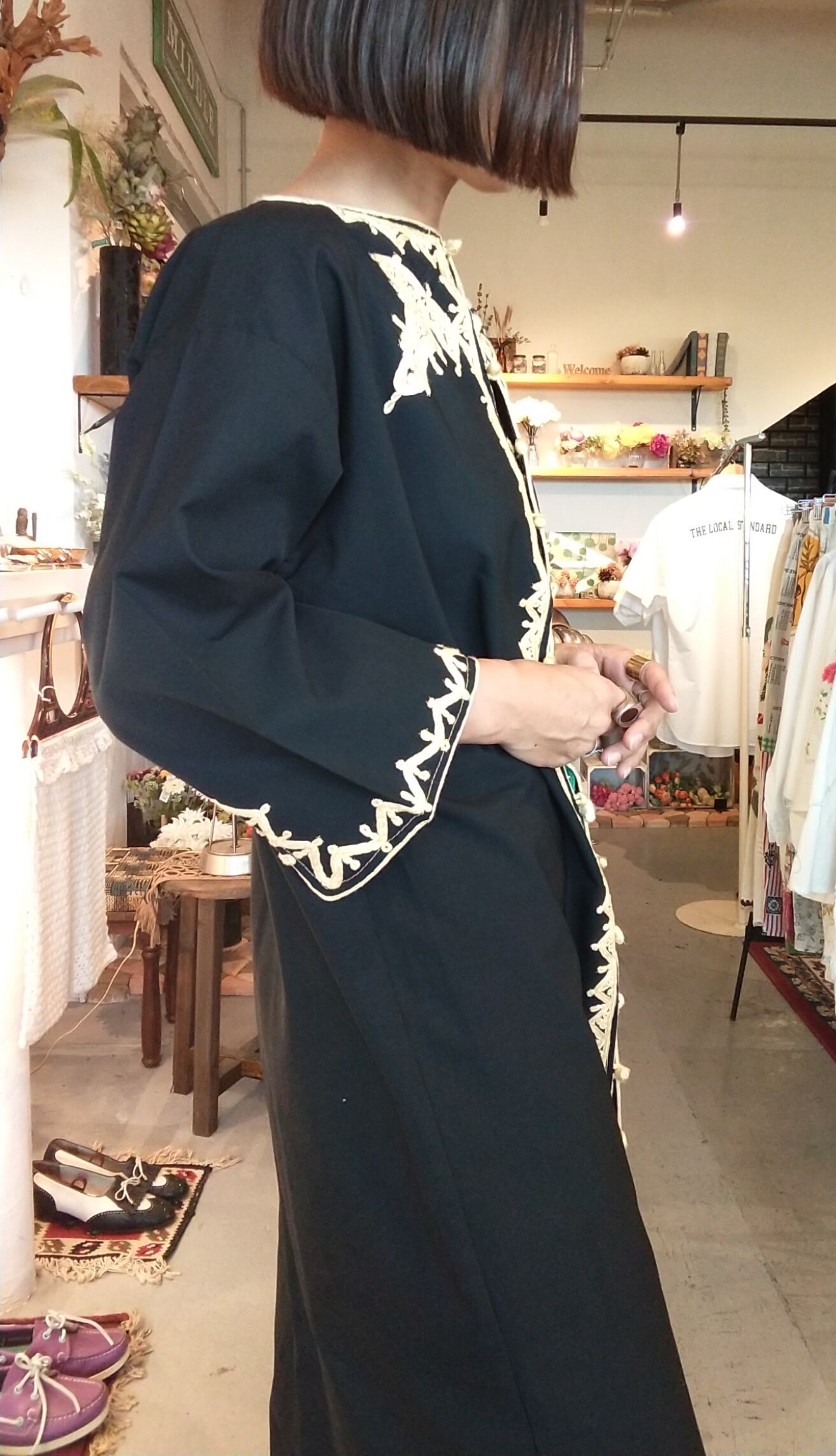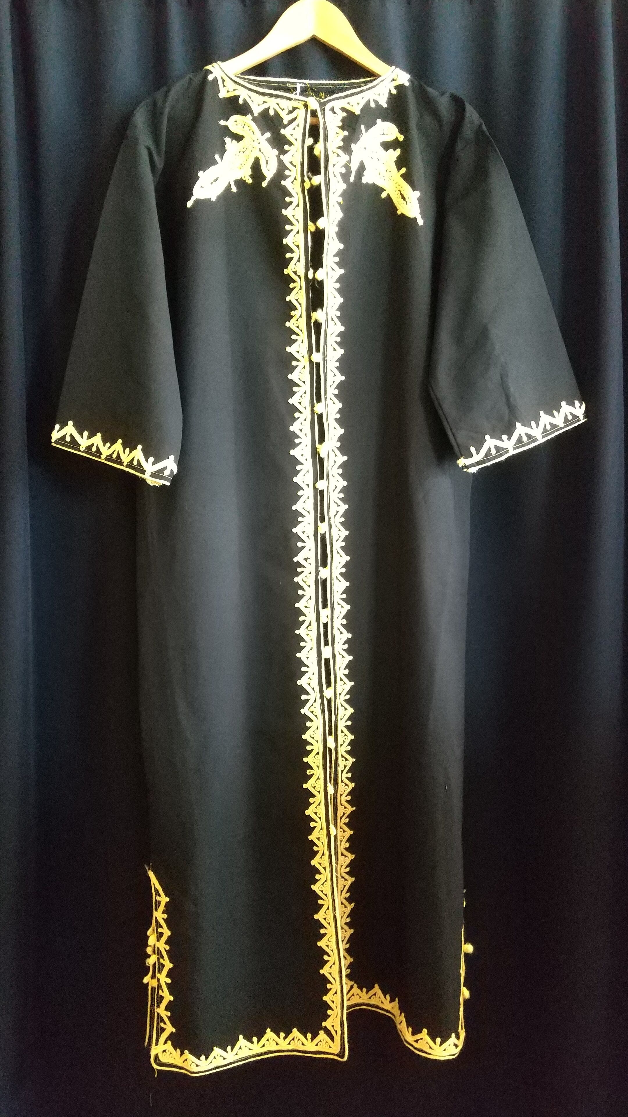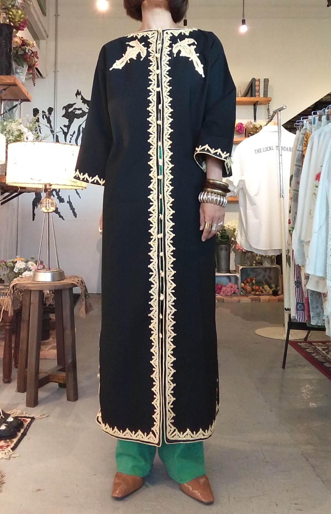 黒字にレモンイエローの刺繍が映えるヴィンテージのカフタンロングガウン。素材表記はありませんがコットンとポリエステルの混紡素材のようです。やや厚手のさらりとした肌触りで少しハリ感があります。透け感はありません。丈が長すぎないためパンツやスカートとのレイヤードが楽しい1枚。ボタンを数か所留めてワンピース風にも。