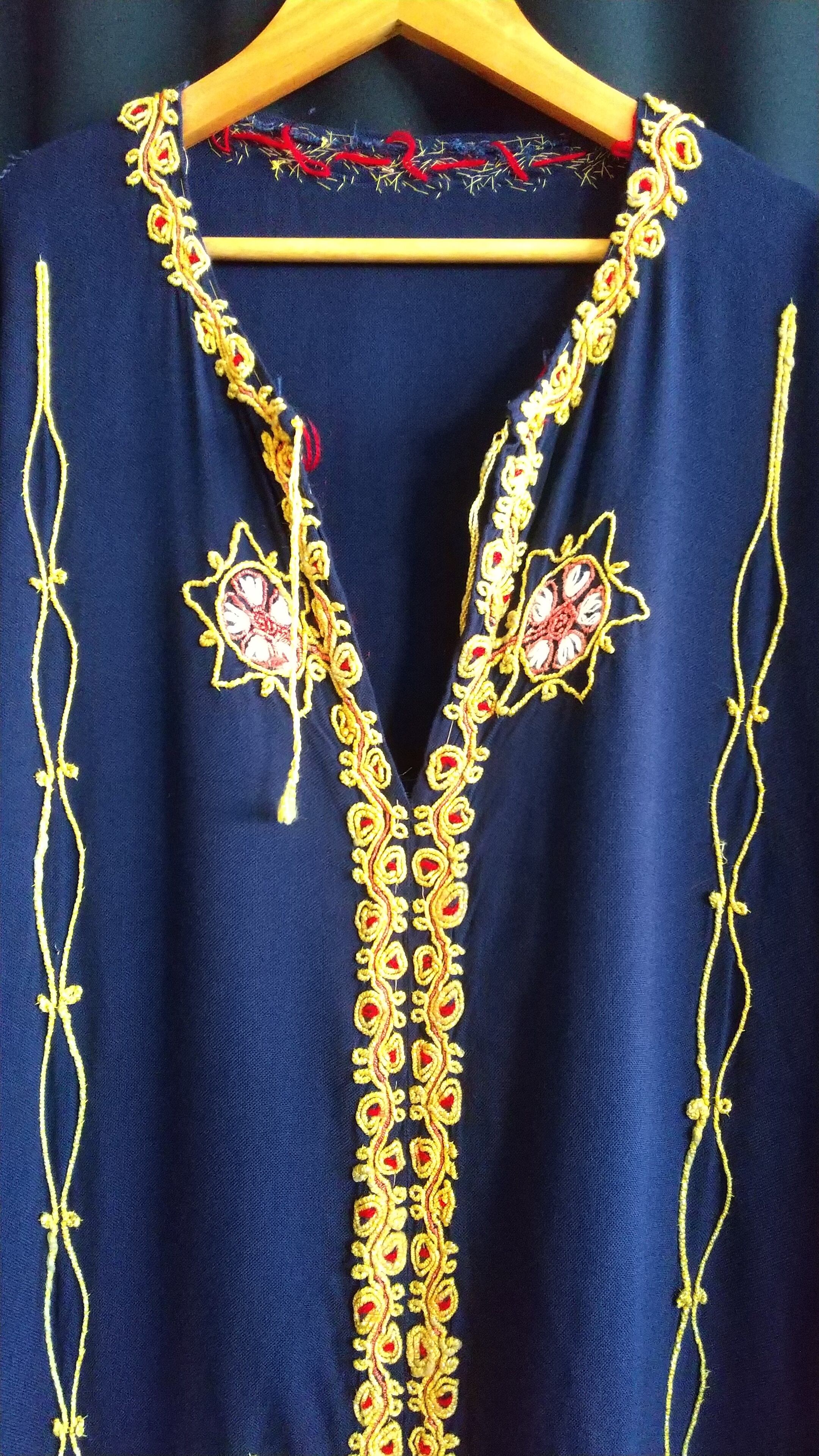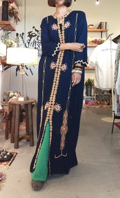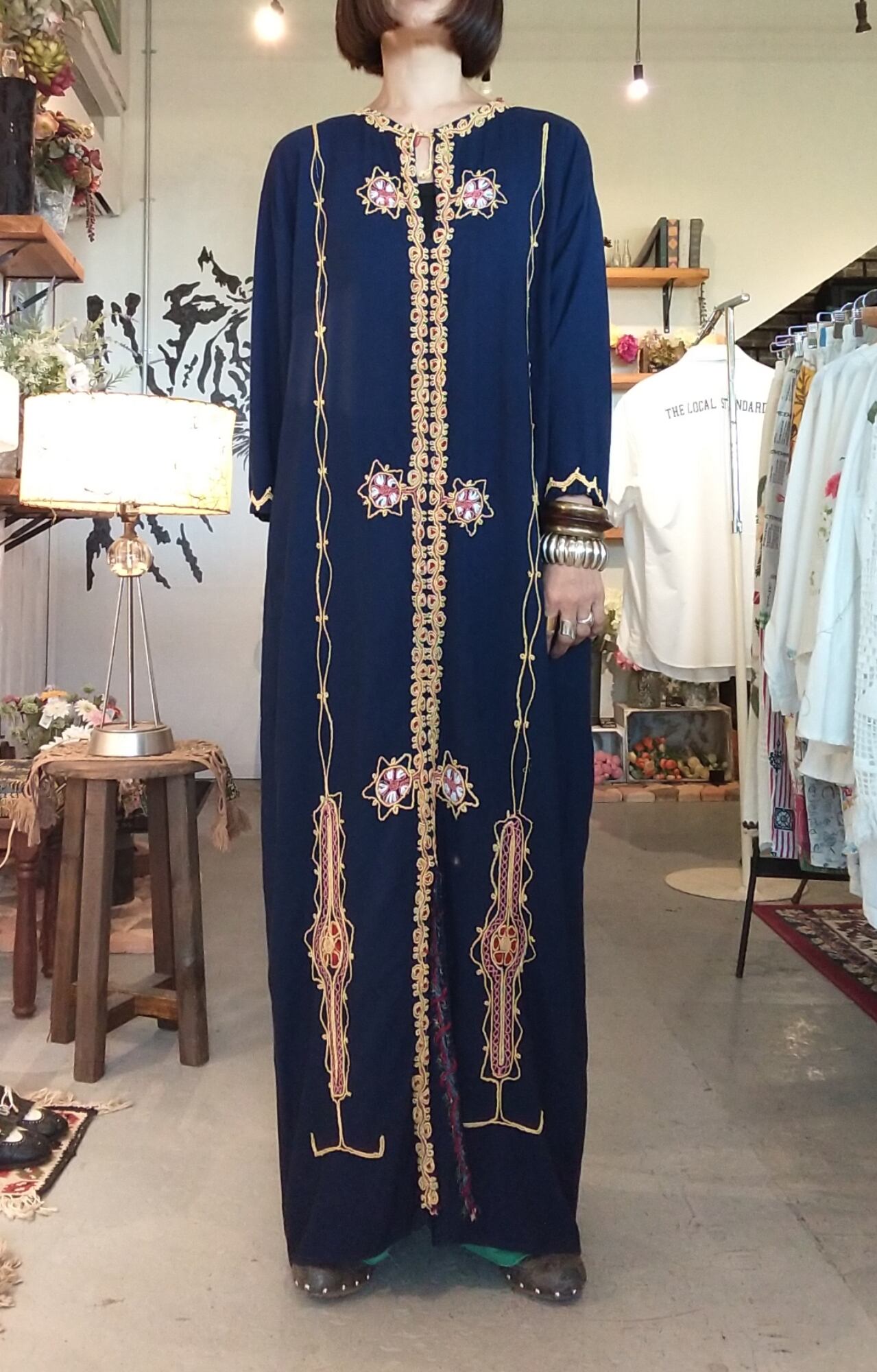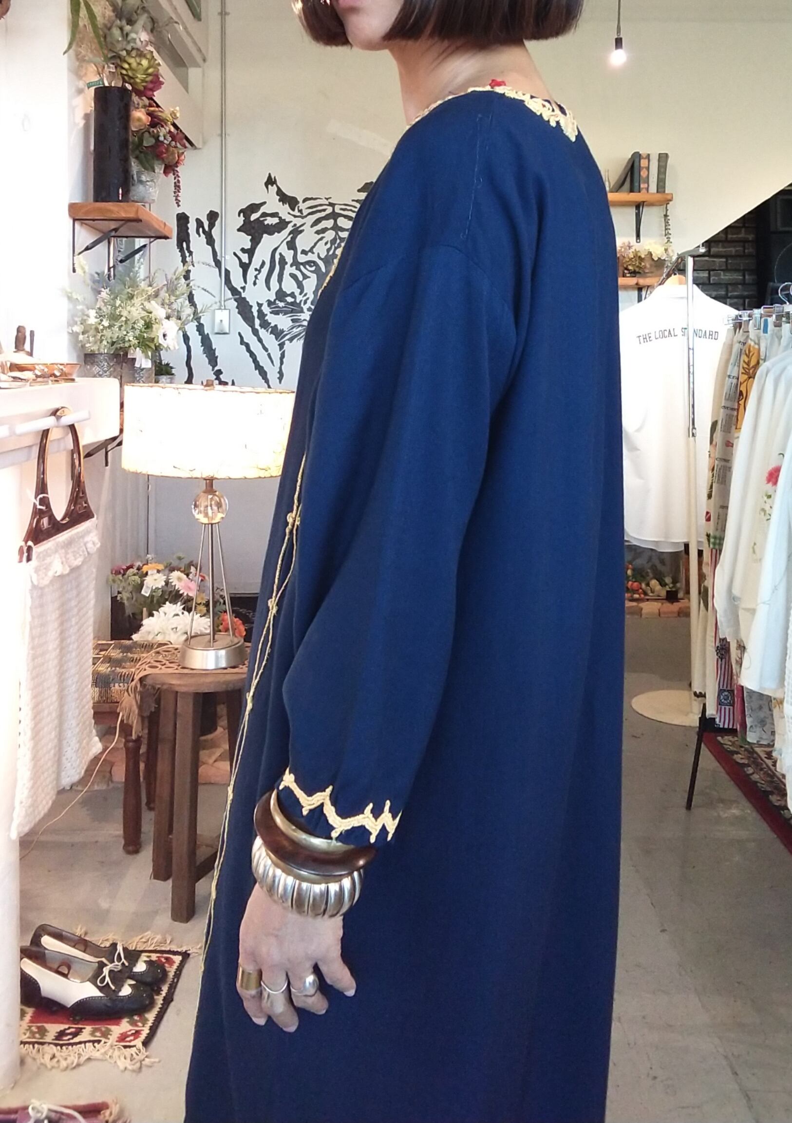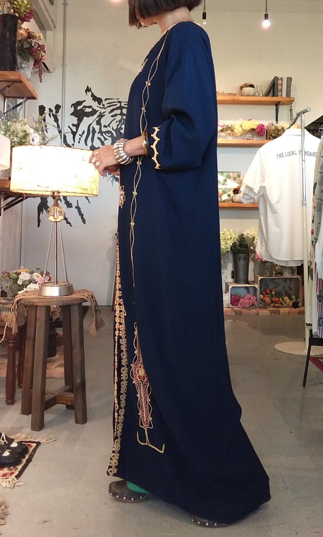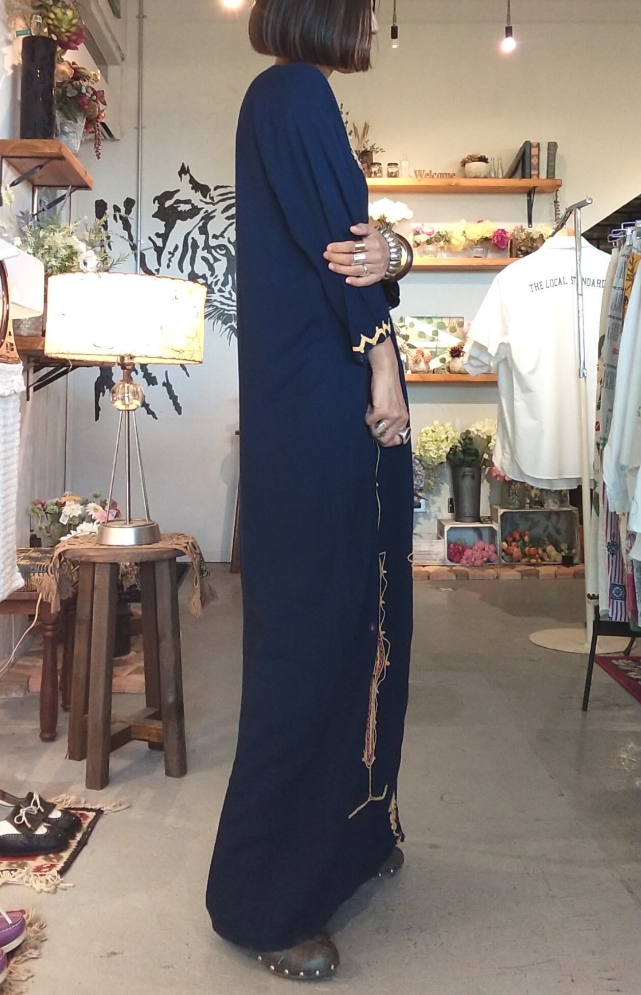 ネイビーにゴールドの刺繍が映えるヴィンテージのカフタンマキシドレス。素材表記はありませんがレーヨンのような素材感です。落ち感があり縦に美しいシルエットが叶います。透け感はありません。首元はVネック+紐で抜け感があります。1枚ですっきり着られてかっこいいドレスです。