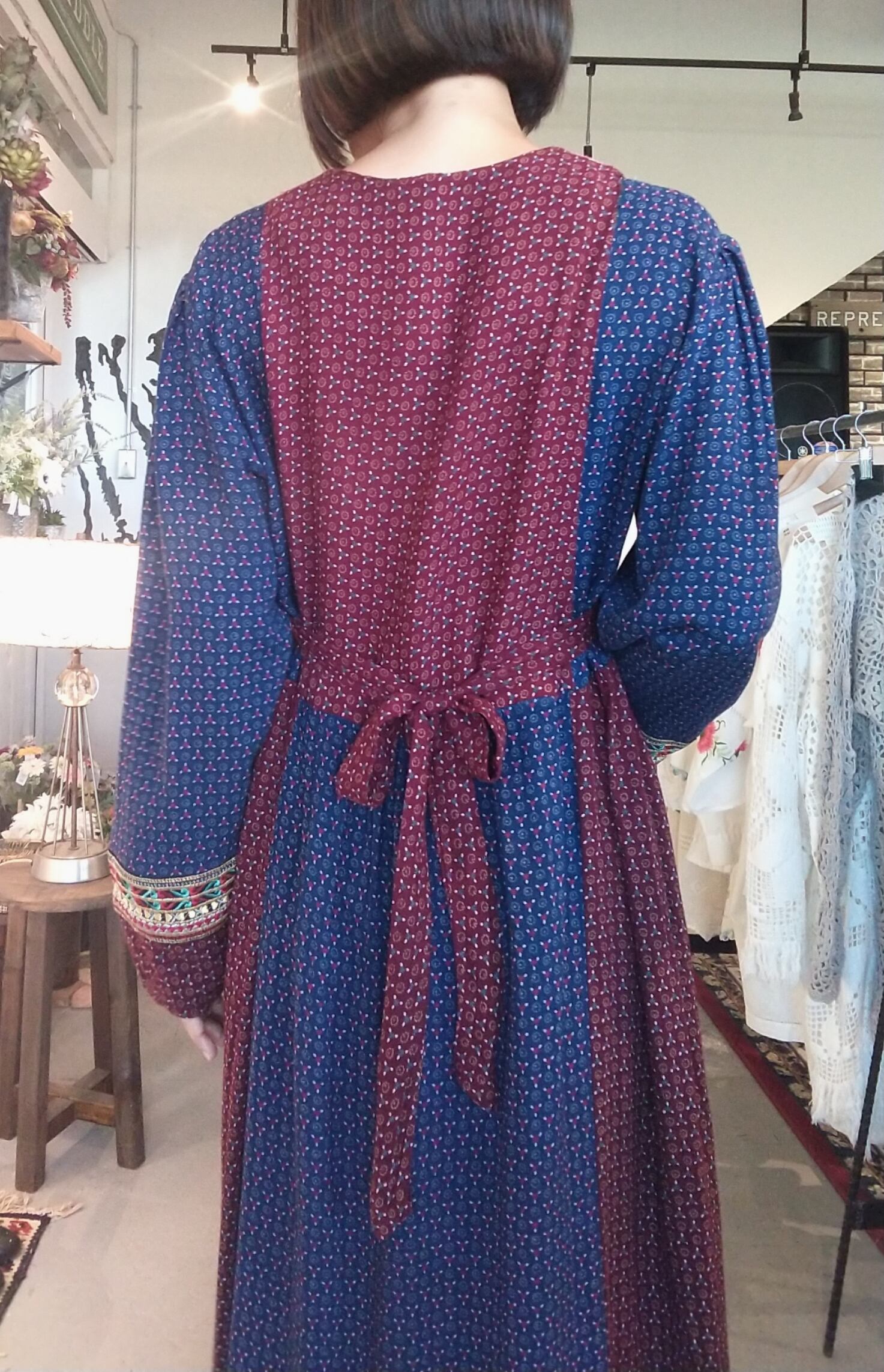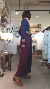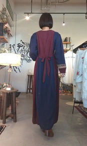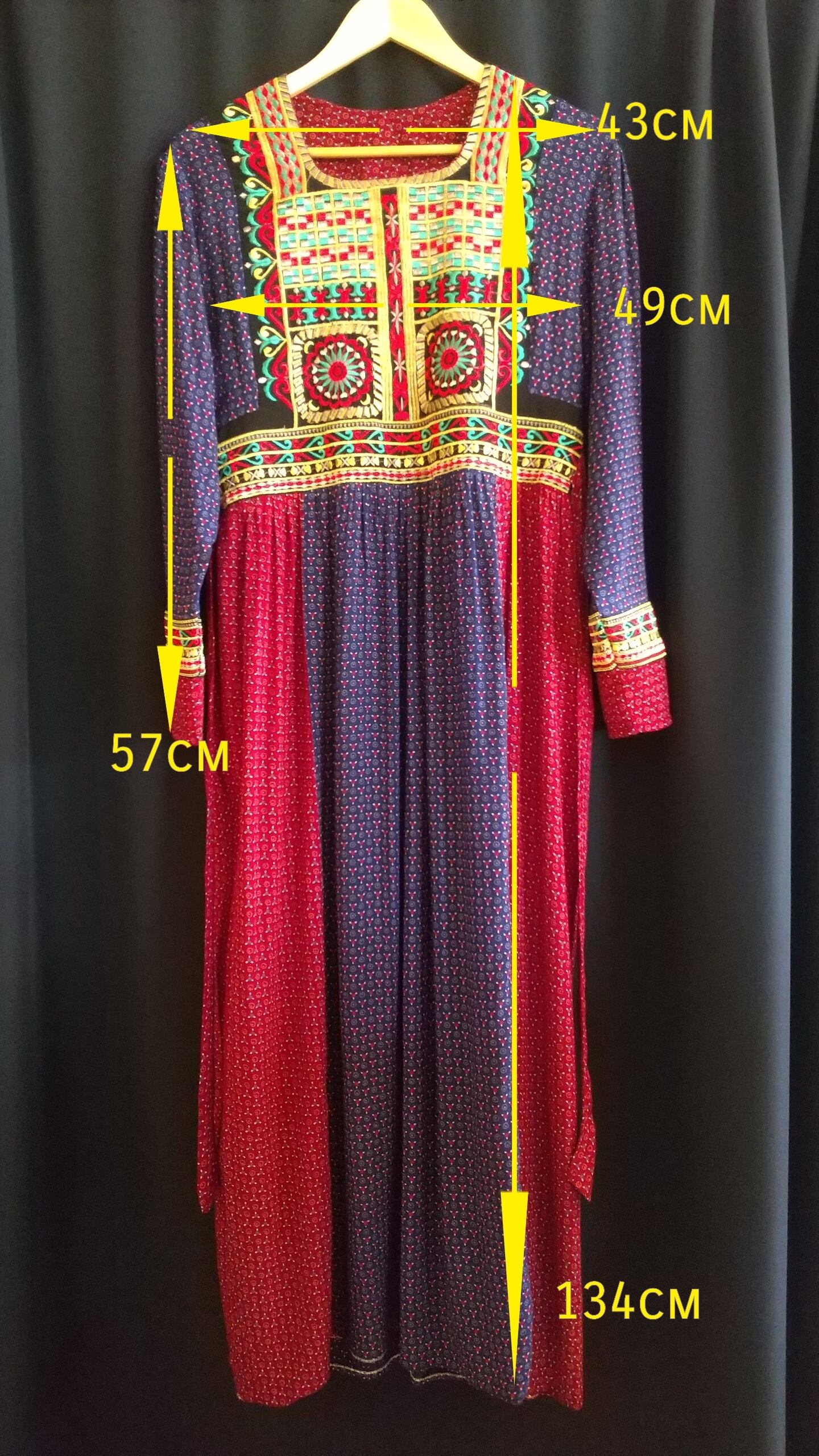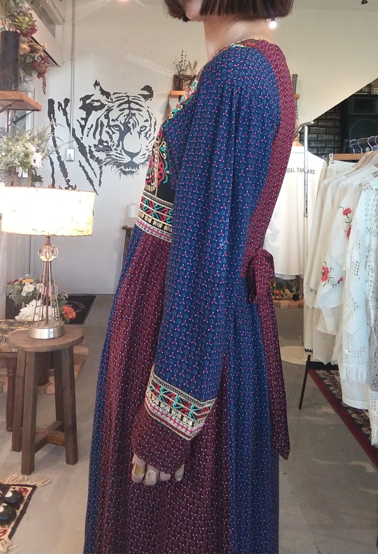 金糸入りの豪華な刺繍が魅力のヴィンテージのアフガンドレス。素材表記はありませんがレーヨンのような落ち感があります。透け感はありません。1枚で着られて華やかさのあるドレスです。