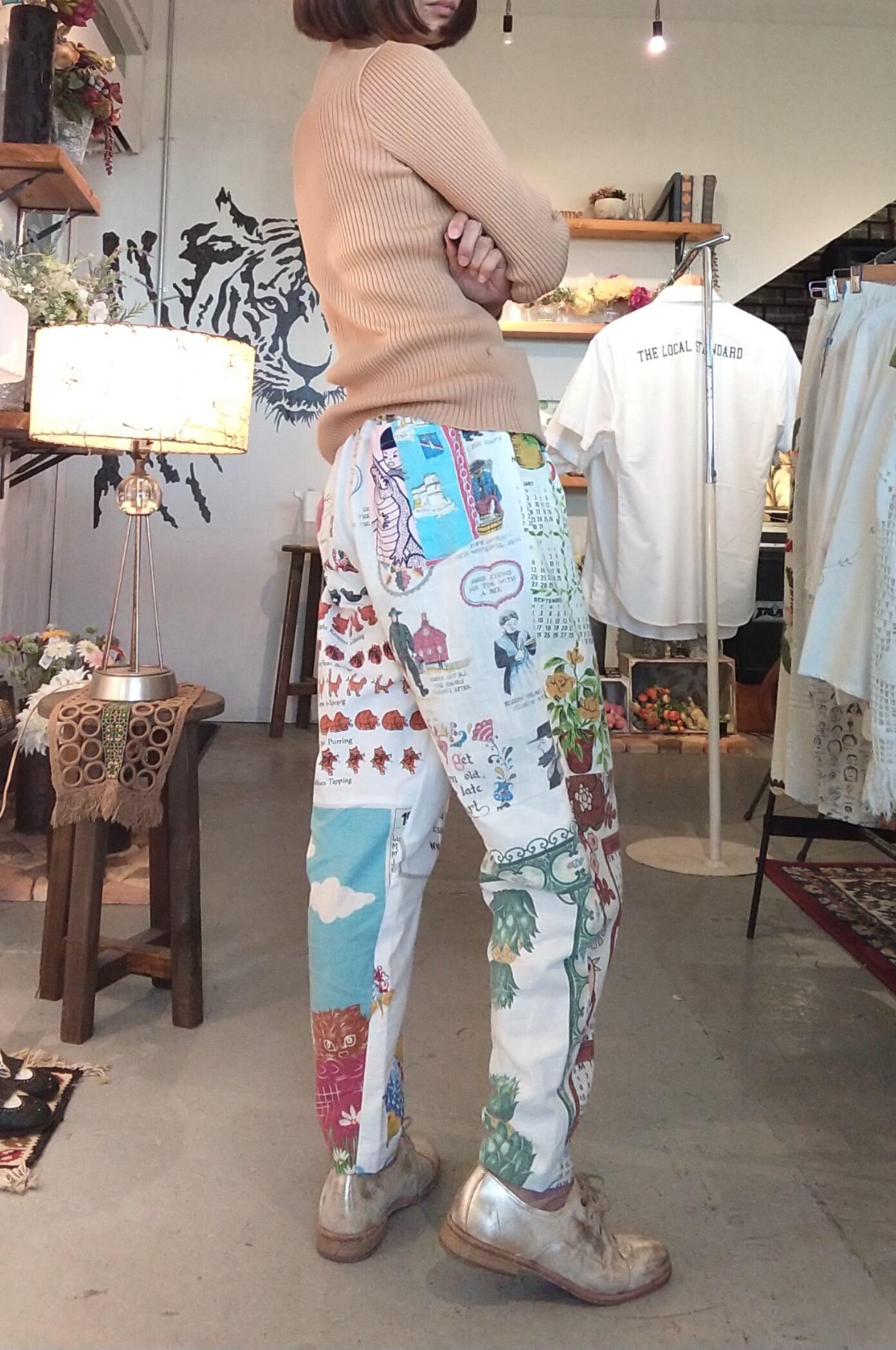 ヴィンテージクロスを使用したリメイクパンツ。素材はコットンです。わたり幅はゆったり、裾にかけて細くなるテーパードシルエットです。ウエストゴム仕様。