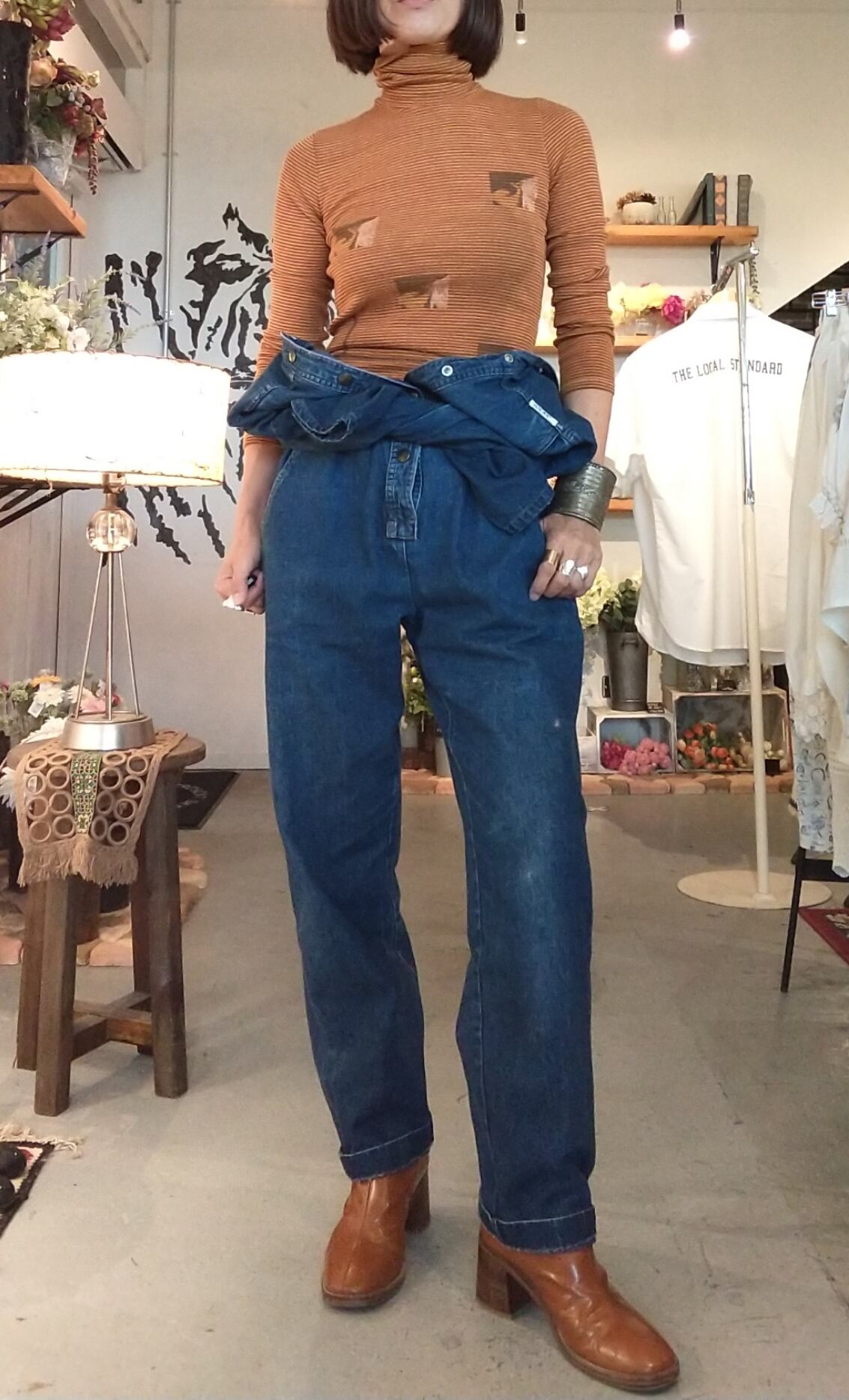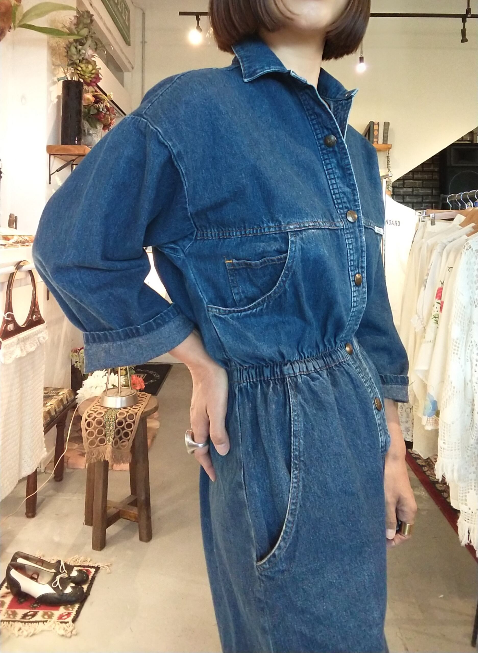 きれいに色の残ったデニムのヴィンテージジャンプスーツ。すっきり細身のシルエットで1枚でさらりと着てかっこいい優秀アイテムです。