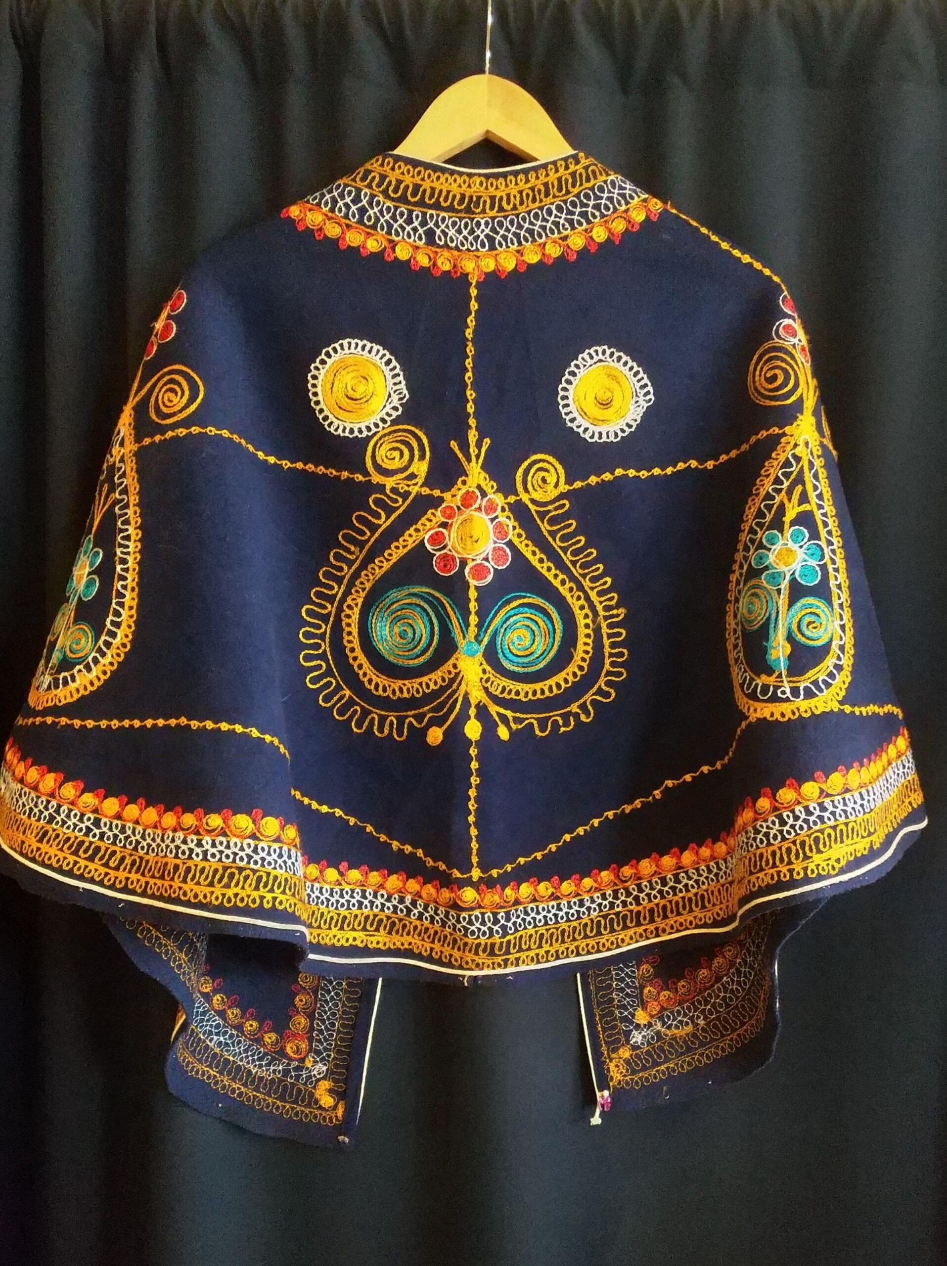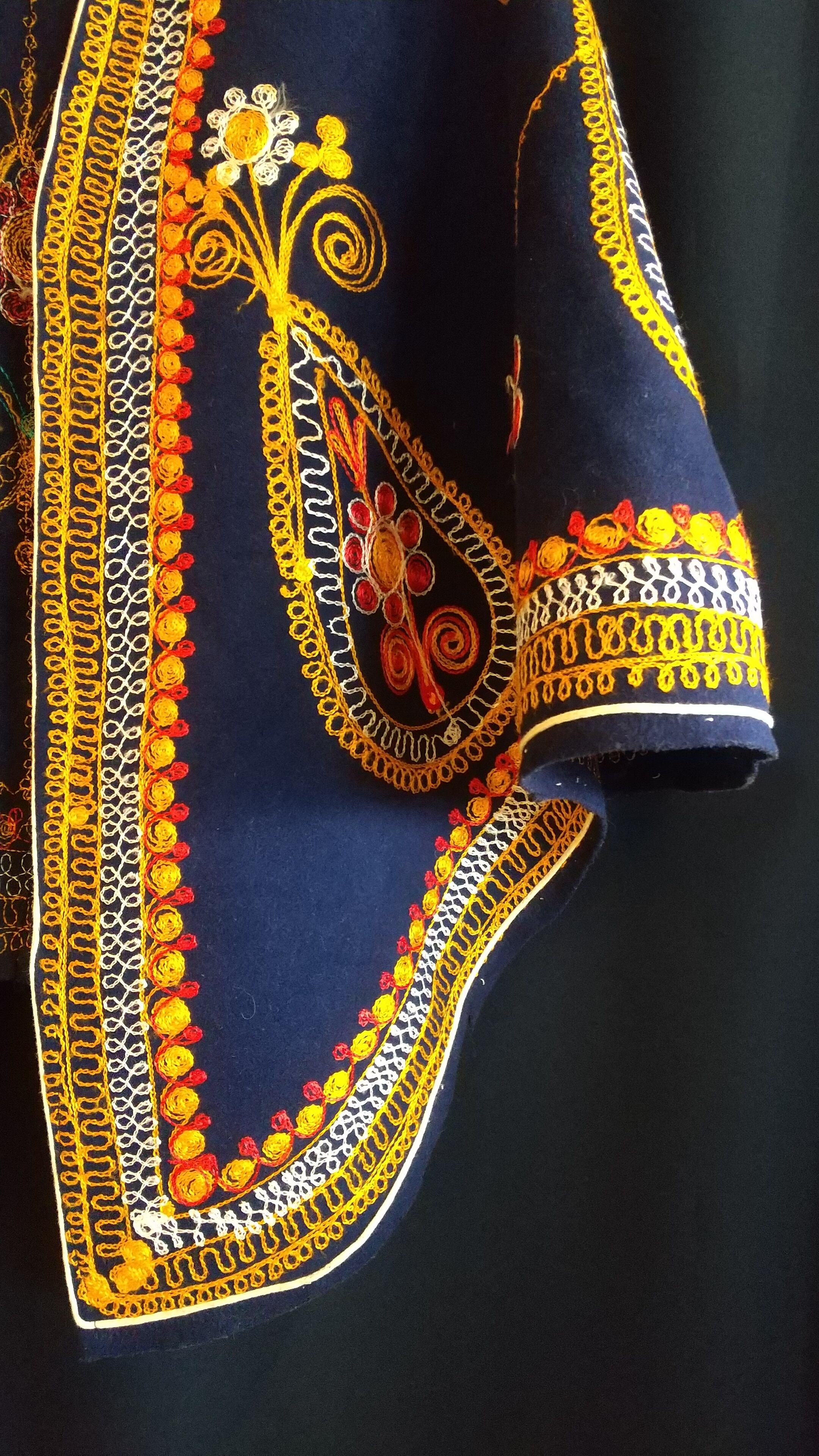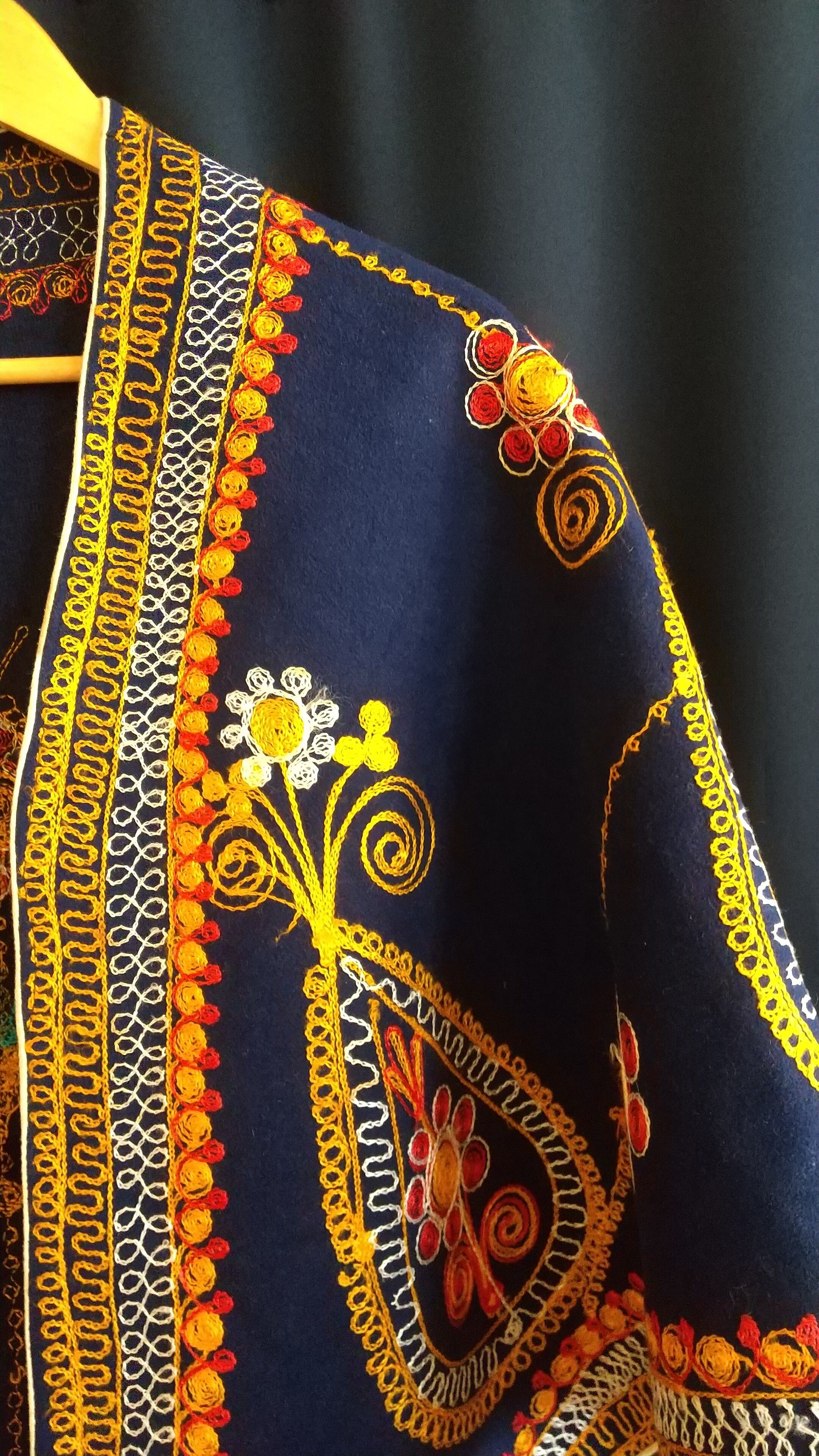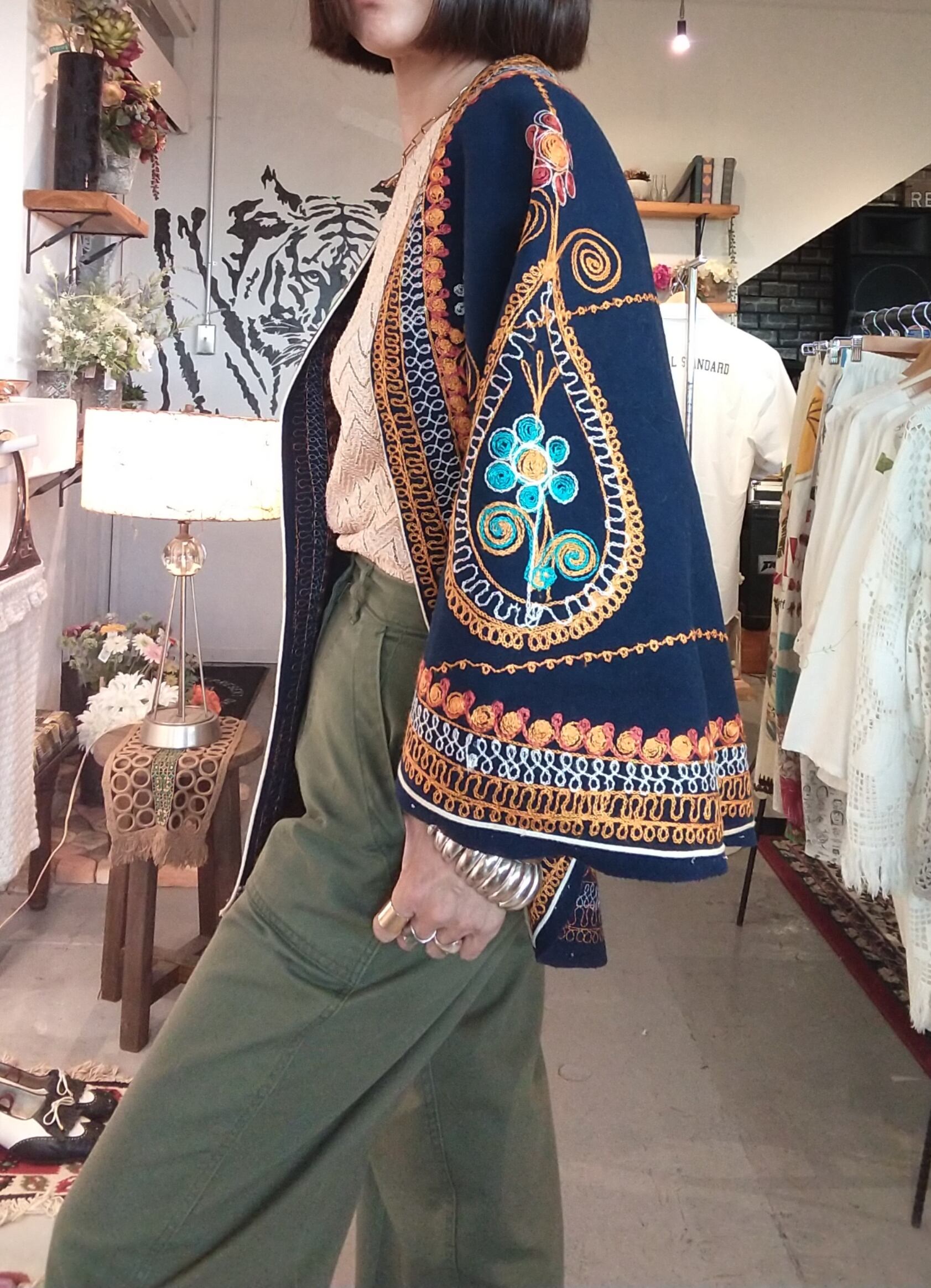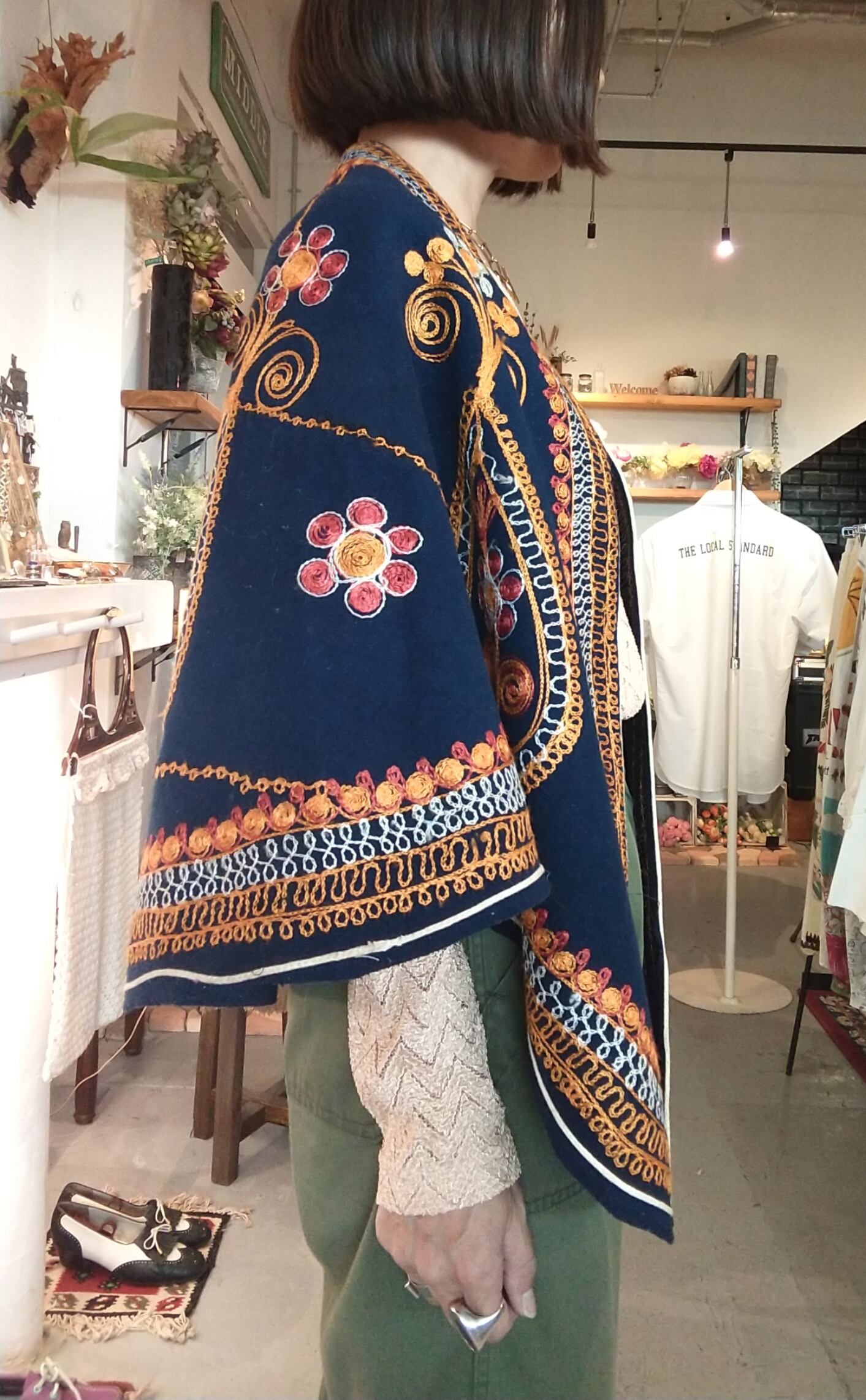 鮮やかな刺繍が目を引くヴィンテージケープ。素材表記はありませんがウールのようです。張り感がありきれいなシルエットが叶います。ホックや紐は付いておらず、フロントはフルオープンで肩にかけて羽織るタイプです。シンプルなワンピースの仕上げにさっと羽織るのも素敵です。
