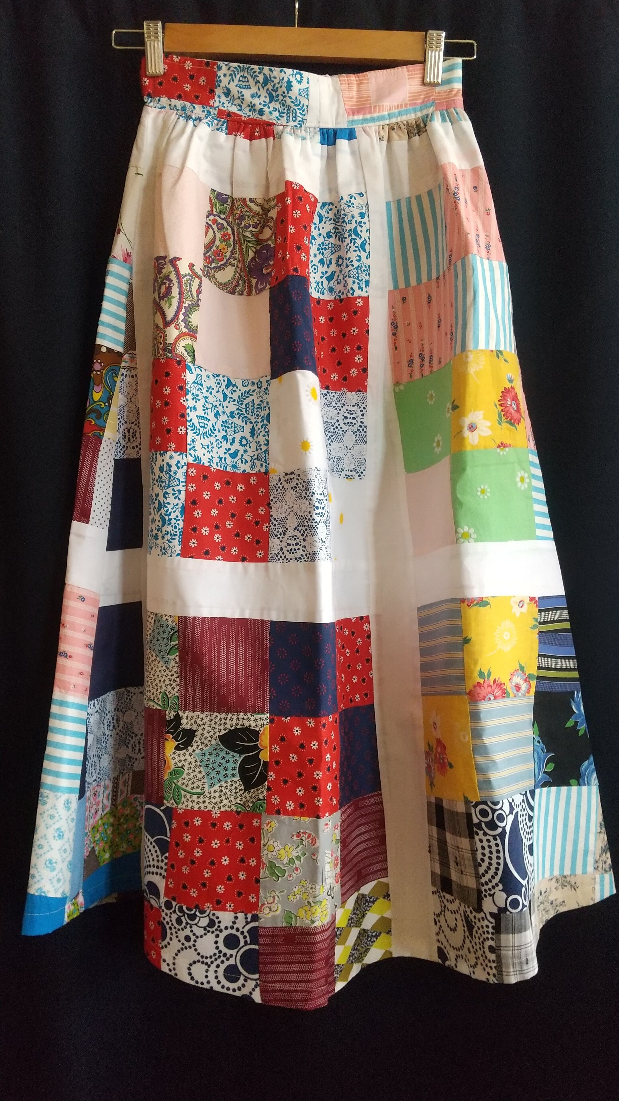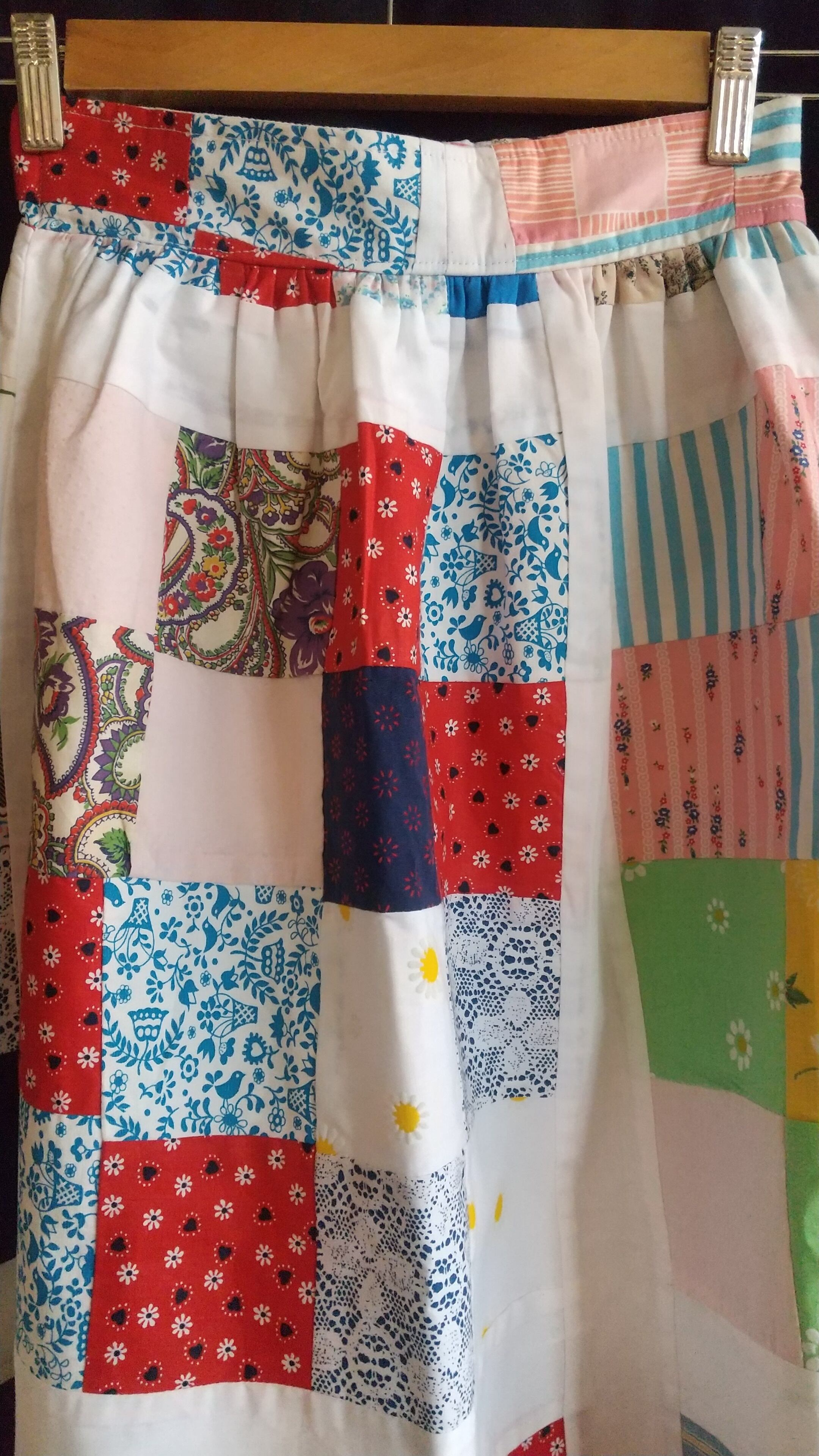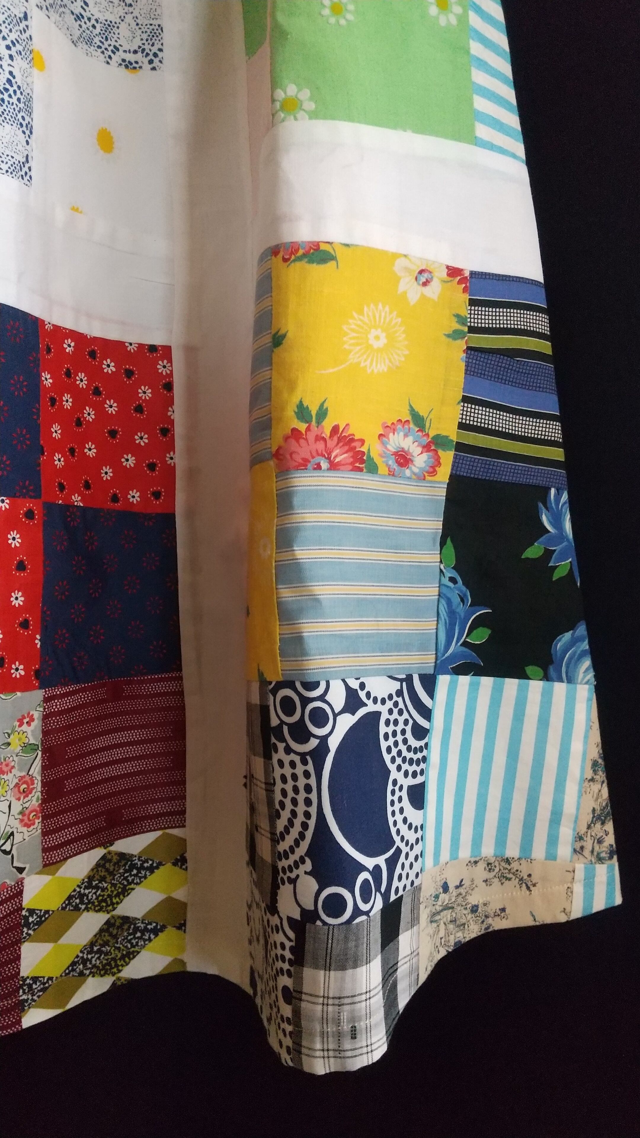 ヴィンテージのパッチワークキルト生地をたっぷり贅沢に使用したギャザースカート。当時の生地を使用してスカートに仕立てたリプロダクト商品の一点物となります。こちらは丈がやや短めになり小柄な方にもおすすめです。