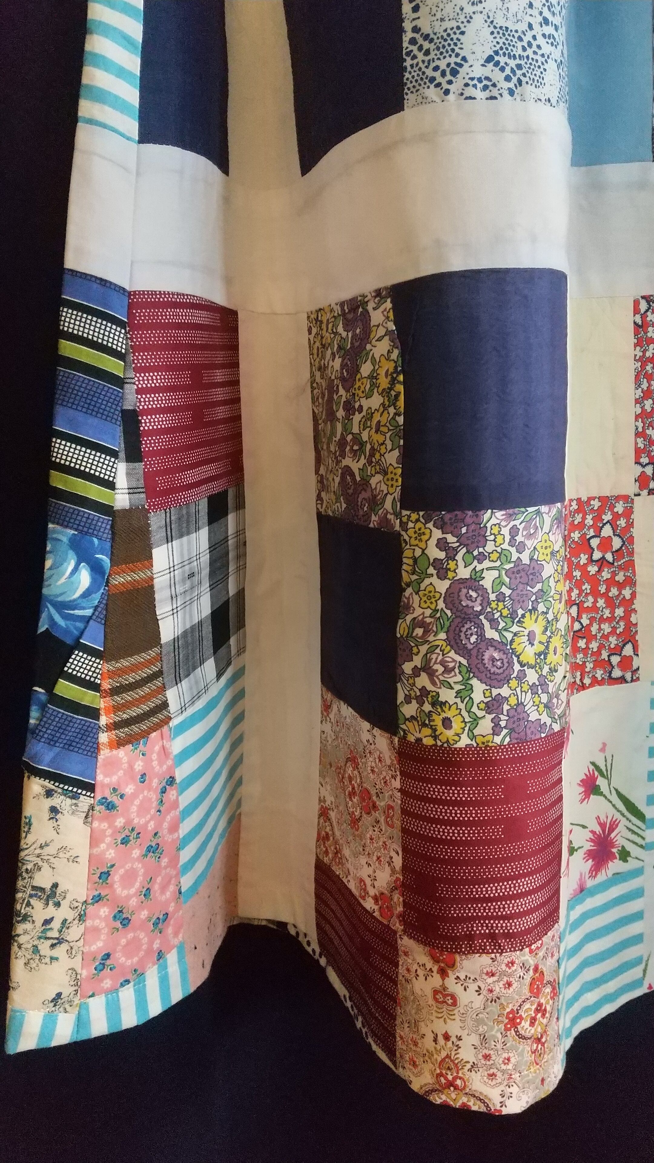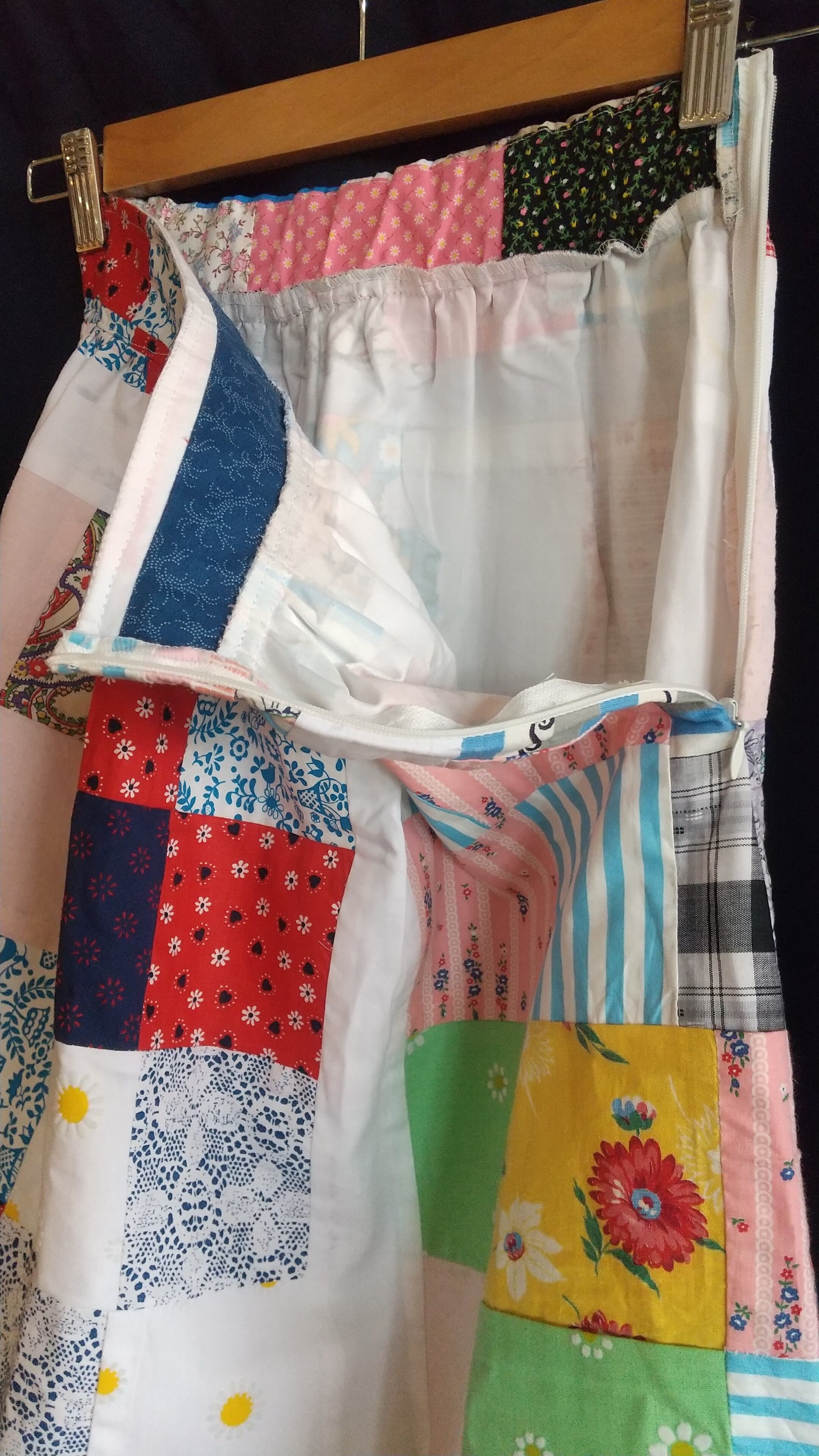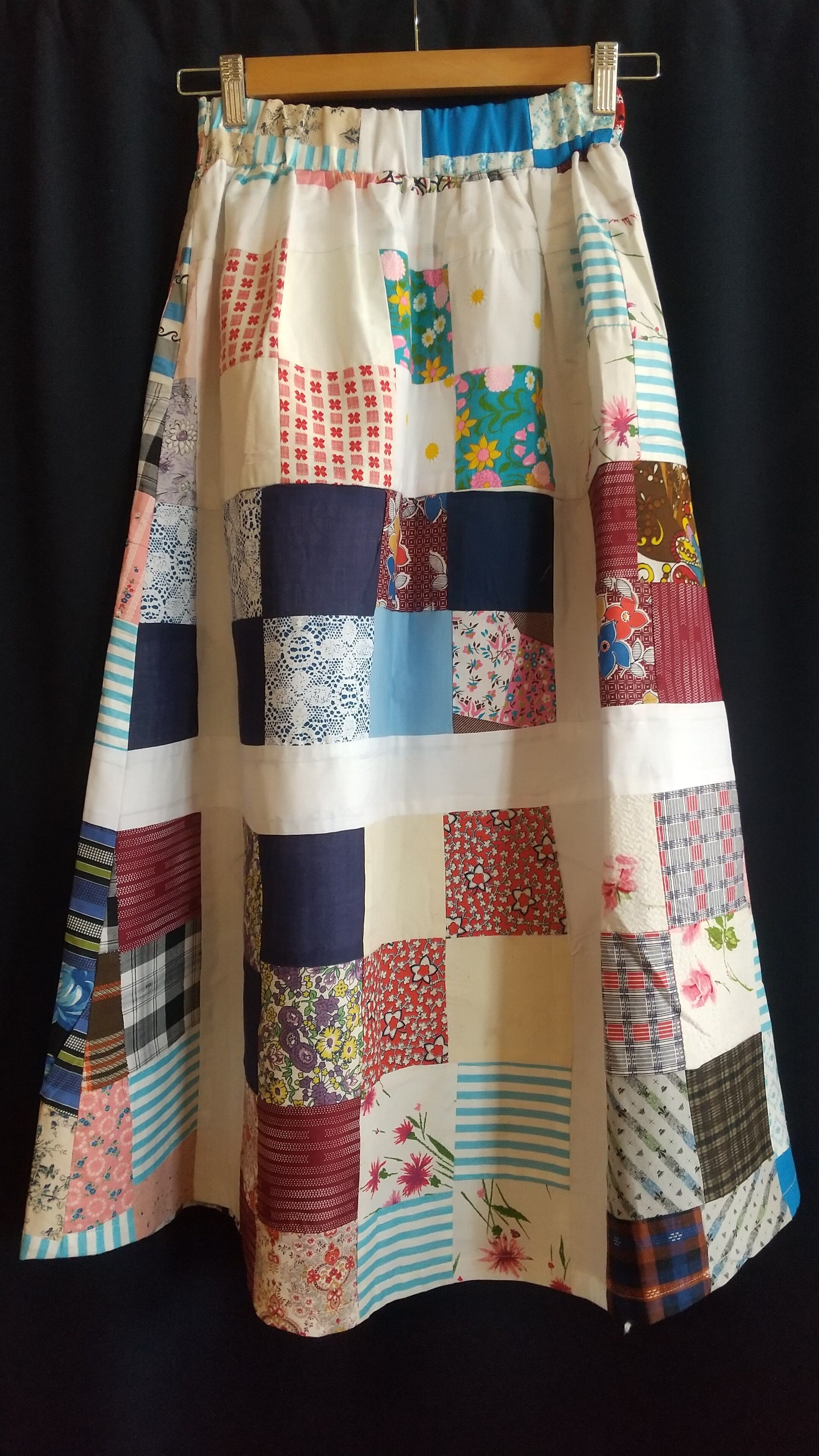 ヴィンテージのパッチワークキルト生地をたっぷり贅沢に使用したギャザースカート。当時の生地を使用してスカートに仕立てたリプロダクト商品の一点物となります。こちらは丈がやや短めになり小柄な方にもおすすめです。