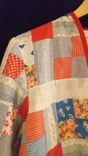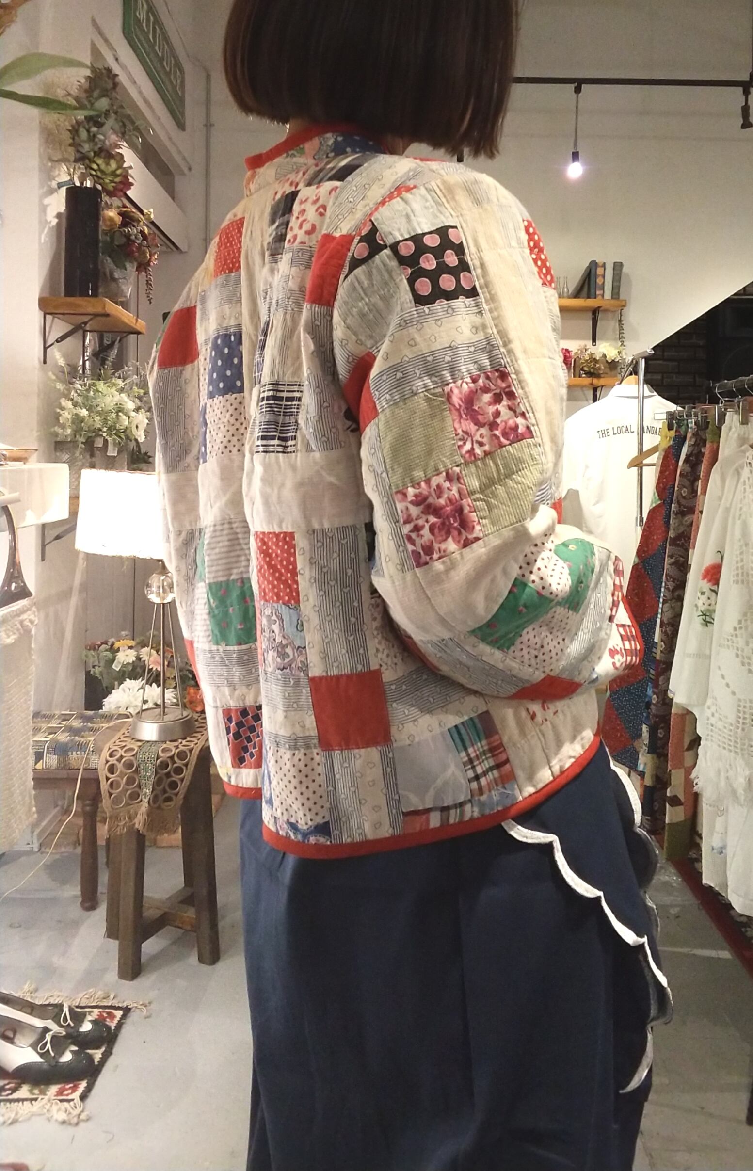 ヴィンテージのパッチワークキルト生地をたっぷり使用したオープンジャケット。こちらは当時の生地を使用してジャケットに仕立てたリプロダクト商品の一点物となります。こちらは厚手すぎず薄手すぎず普段使いにぴったりな1枚です。
