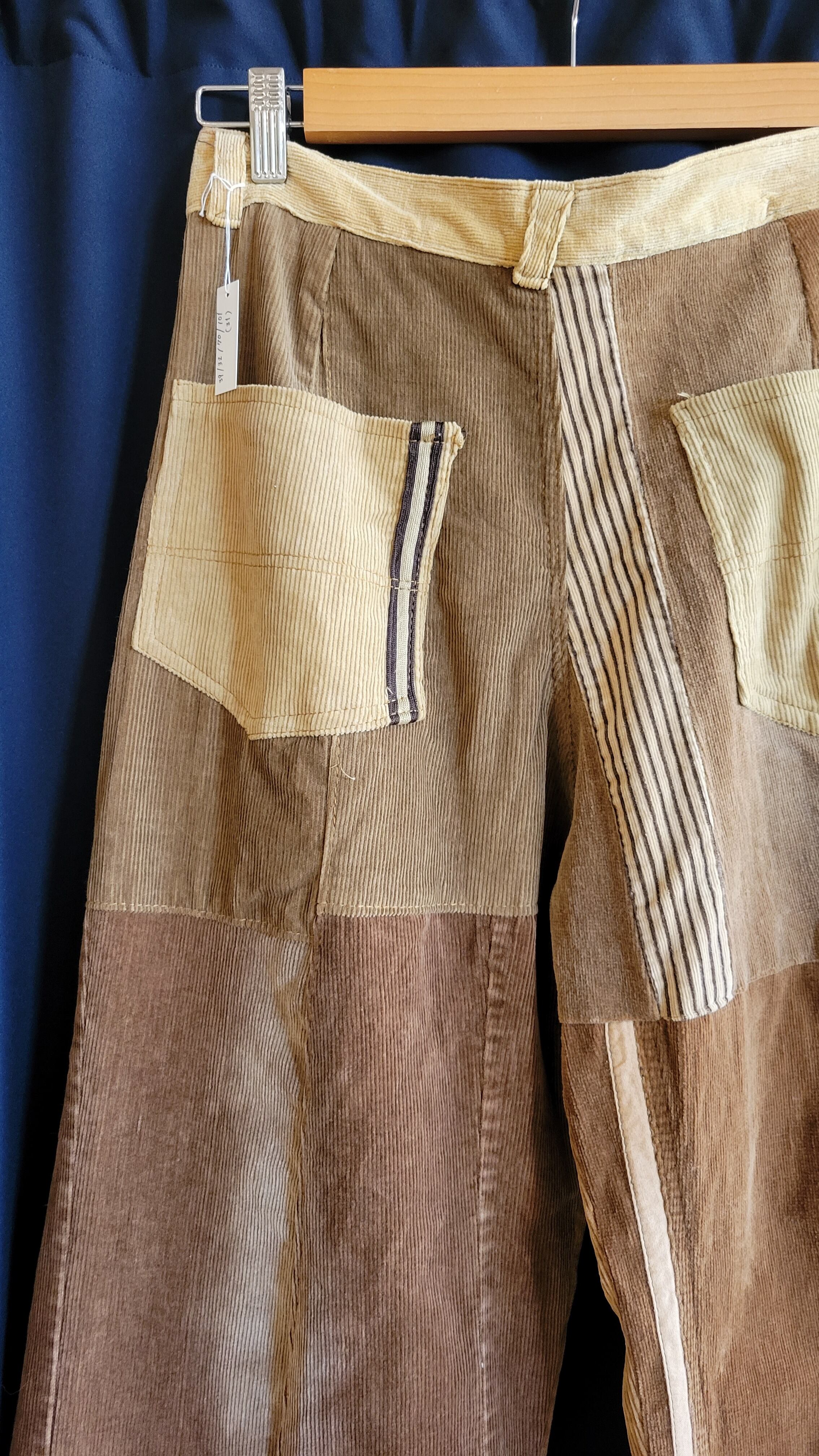 ヴィンテージのコーデュロイ生地を使用したパッチワークパンツです。フロント2タック、ハイライズ、ワイドシルエット。ひとつひとつサイズやパターン等表情の異なる一点物です。
